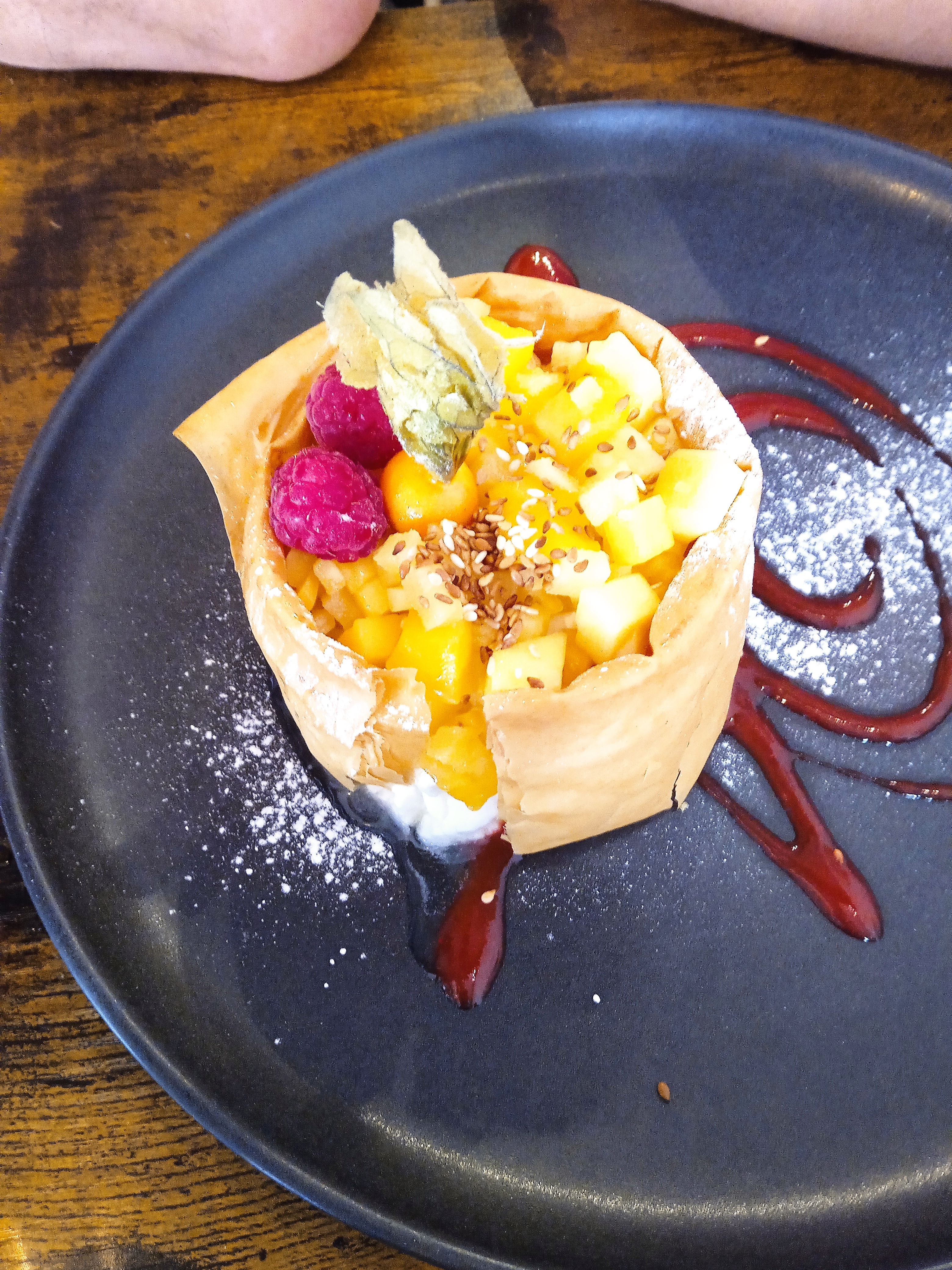 Délicieuse salade pour le déjeuner. Dessert très savoureux. Amical et serviable. Manger dehors sur la place.