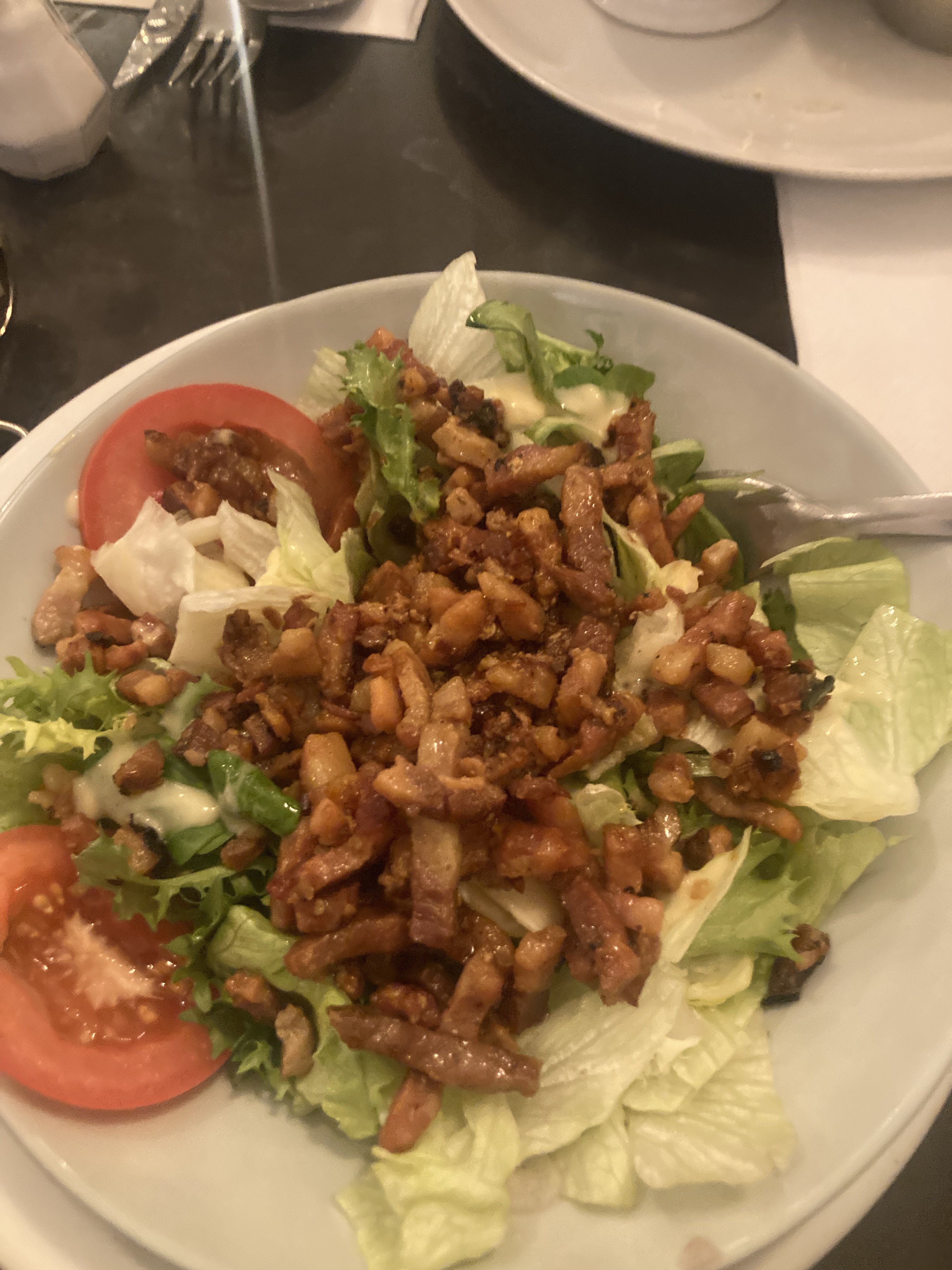 A mangé super savoureux. Parfois, il faut y jeter un deuxième regard. Pas très attrayant de l'extérieur et l'ambiance n'est pas un aimant, mais la nourriture était excellente. Nous avions chacun une salade (une fois aux noix et au Roquefort - divin) en entrée et une escalope de veau à la crème de Calvados en plat principal, avec une délicieuse rose. Nous sommes heureux d'avoir jeté un deuxième regard. Ce fut une soirée très agréable et savoureuse. Le menu est très varié. Nous serions ravis de revenir.