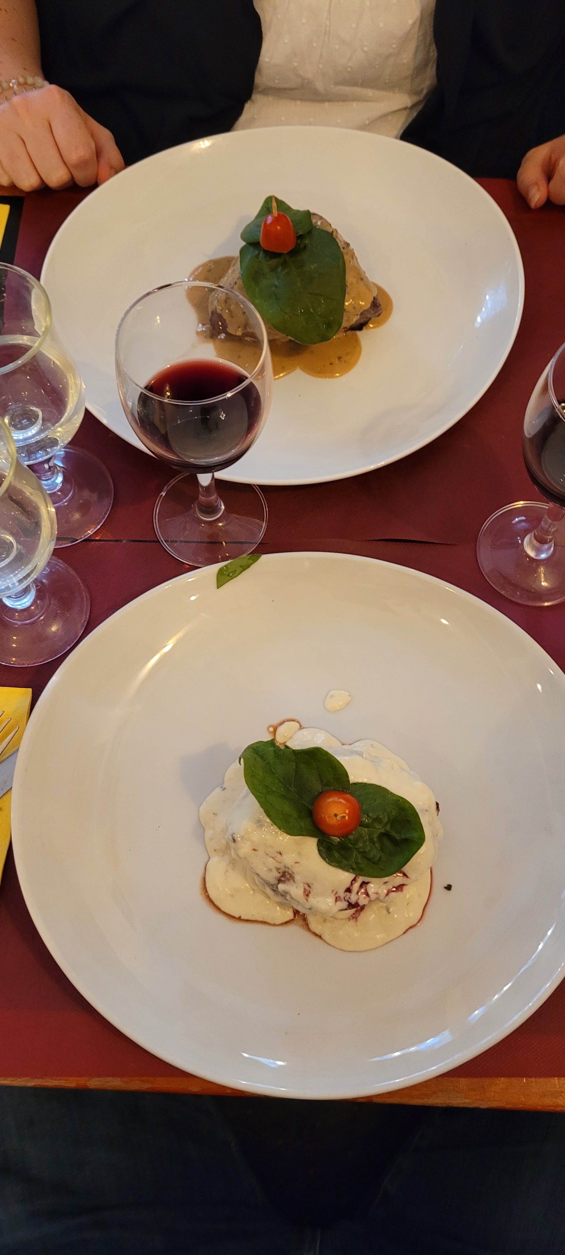 Il y avait la salade de gésier comme entrée et l'agneau. La viande était vraiment bonne, les légumes un peu décevants : les pommes de terre étaient juste tièdes et un peu détrempées, la partie salade de l'entrée mériterait également un peu plus d'attention. A part ça, ambiance typique sympa et prix corrects.