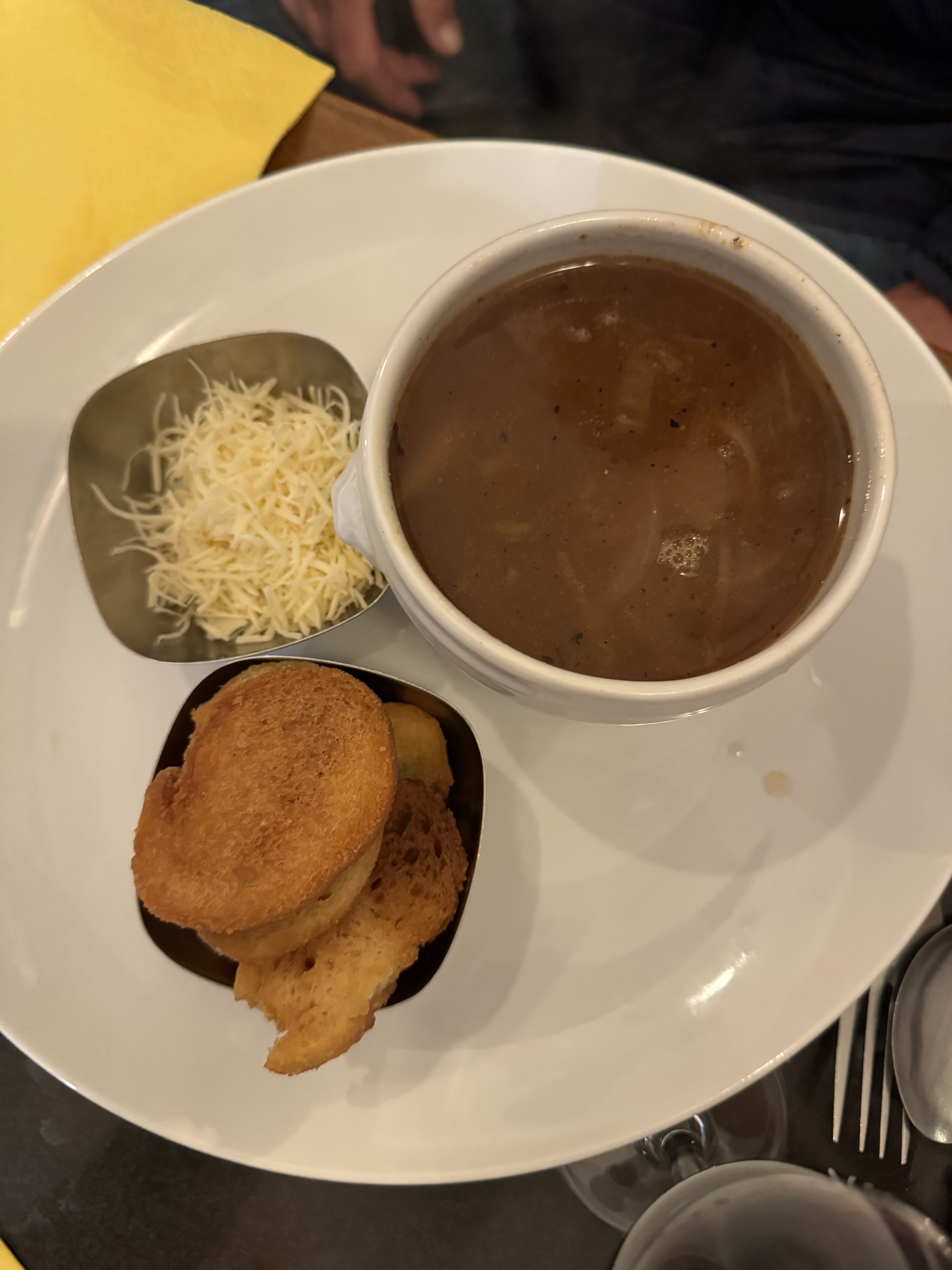 Délicieux j'adore. Soupe a l'oignon succulente pavé de boeuf excellent cuisson au poil et menu du soir a moins de 12e rien a redire