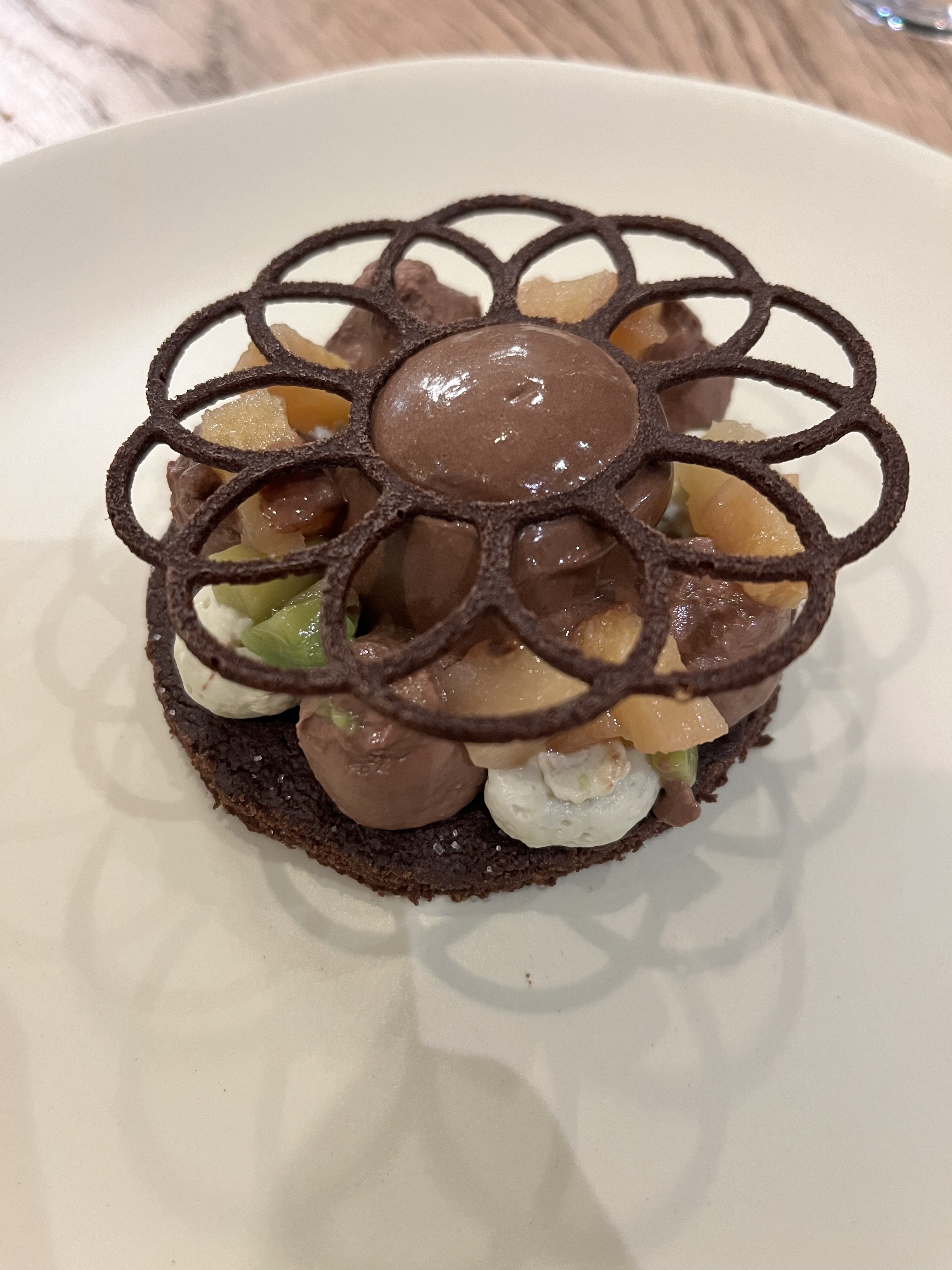 Déçus par cette expérience pas si gastronomique. Nous avons choisi le menu en 4 services avec vins. Le démarrage était excellent (velouté potiron, boudin noir), l’entrée très bien (St Jacques et foie gras) mais le plat et le dessert n’ont pas été au niveau. L’accompagnement du veau n’avait ni saveur ni intérêt, de mon côté j’ai trouvé la lotte un peu sèche et l’accompagnement à base de haricots coco m’a également paru sans goût. Le dessert à la poire et noisette avait nettement plus d’intérêt (même si sa présentation était assez médiocre), les morceaux de poire microscopiques nous ont laissé perplexes (que dire des morceaux de courge ! Hors sujet), le gâteau au chocolat/avocat sans saveur (seule qualité pas trop sucré). Globalement, l’expérience nous a déçus, les vins proposés étaient inégaux, 170€ mal investis. Le service était bon mais les plats décrits avec trop de rapidité…et parfois impossible de comprendre ce que l’on mangeait (une petite carte sur la table nous aurait aidés). La déco est réussie sur certains points (jolies tables bien dressées) sur un carrelage très froid. Je pense que la cuisine gagnerait à être plus simple et précise pour gagner en efficacité et épater nos papilles. Je ne serais pas étonnée que le menu du midi soit meilleur.