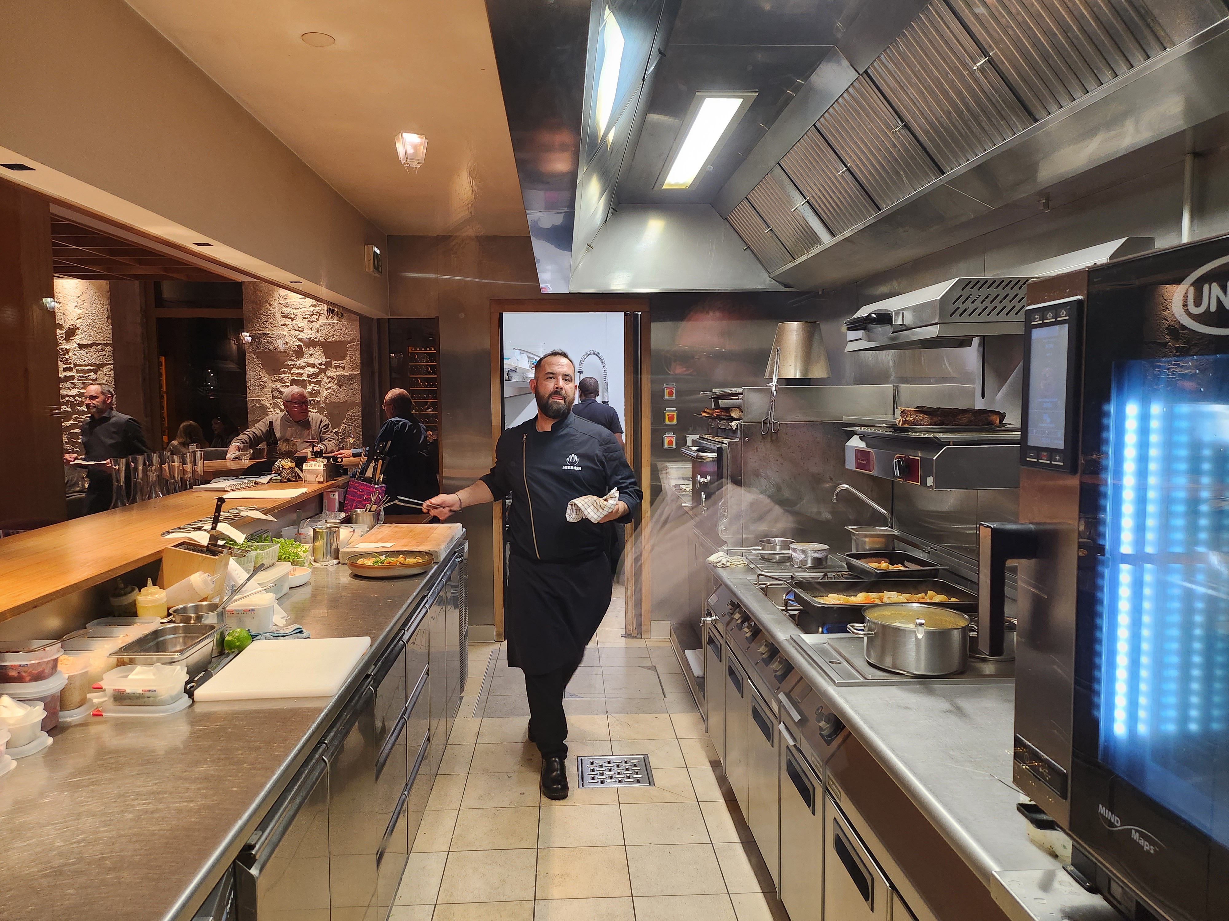 Vue de la cuisine, personnel très sympa et compétent (!!), plats excellents. Assez gros !