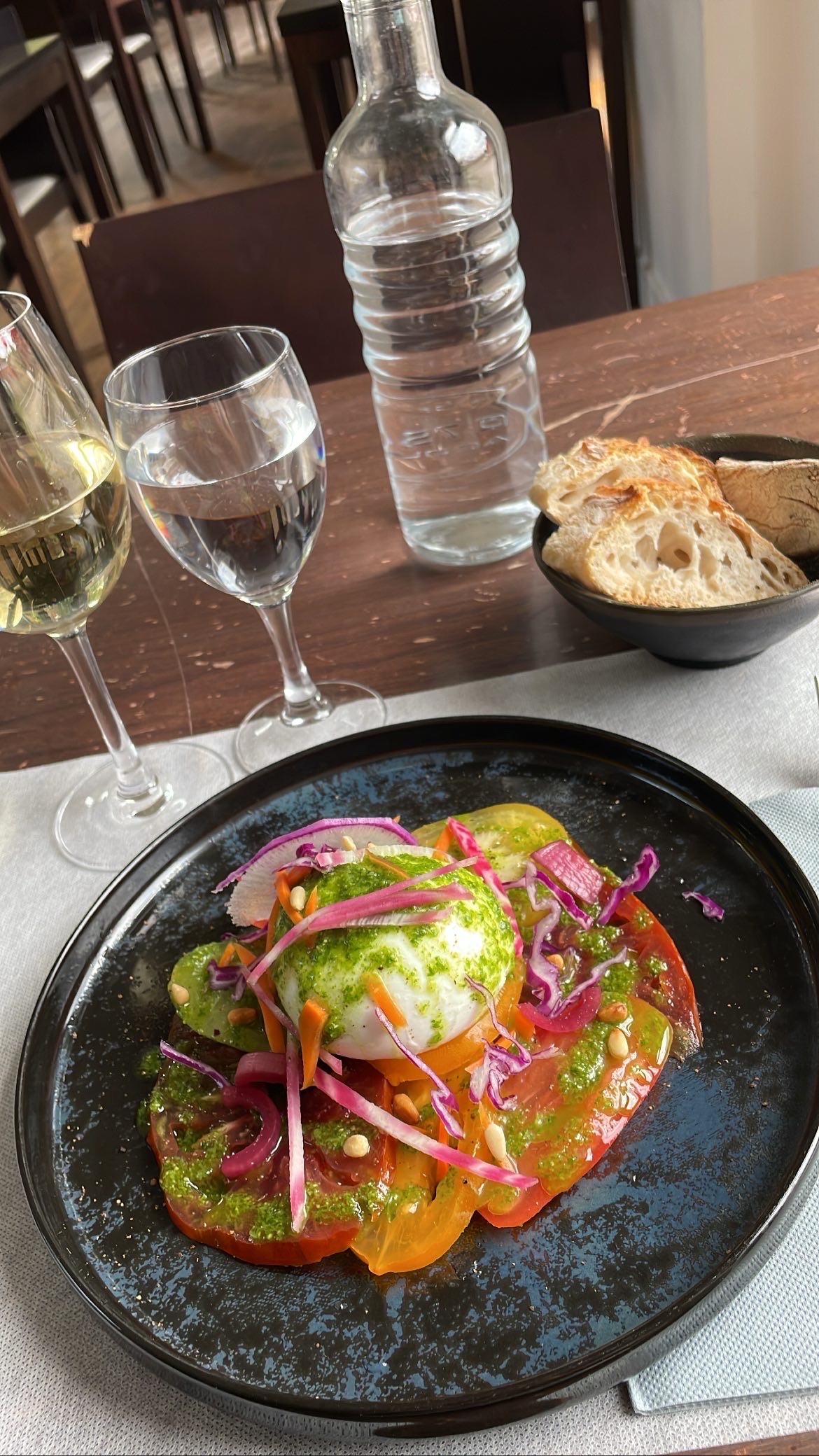 Cadre agréable. Service en partie sympathique. La moitié environ des plats était indisponible. Cela peut arriver mais c’est handicapant quand la carte est réduite. Les autres convives ont apprécié leurs plats. Mon plat, une salade de tomates mozzarella, assez cher était très incipide : les tomates rondes comme la mozzarella n’avaient aucun goût. Le dessert était, lui, plutôt réussi. Le temps d’attente était très long : 25 minutes avant de prendre la commande, presque autant entre le plat et le dessert. J’ai été déçu.