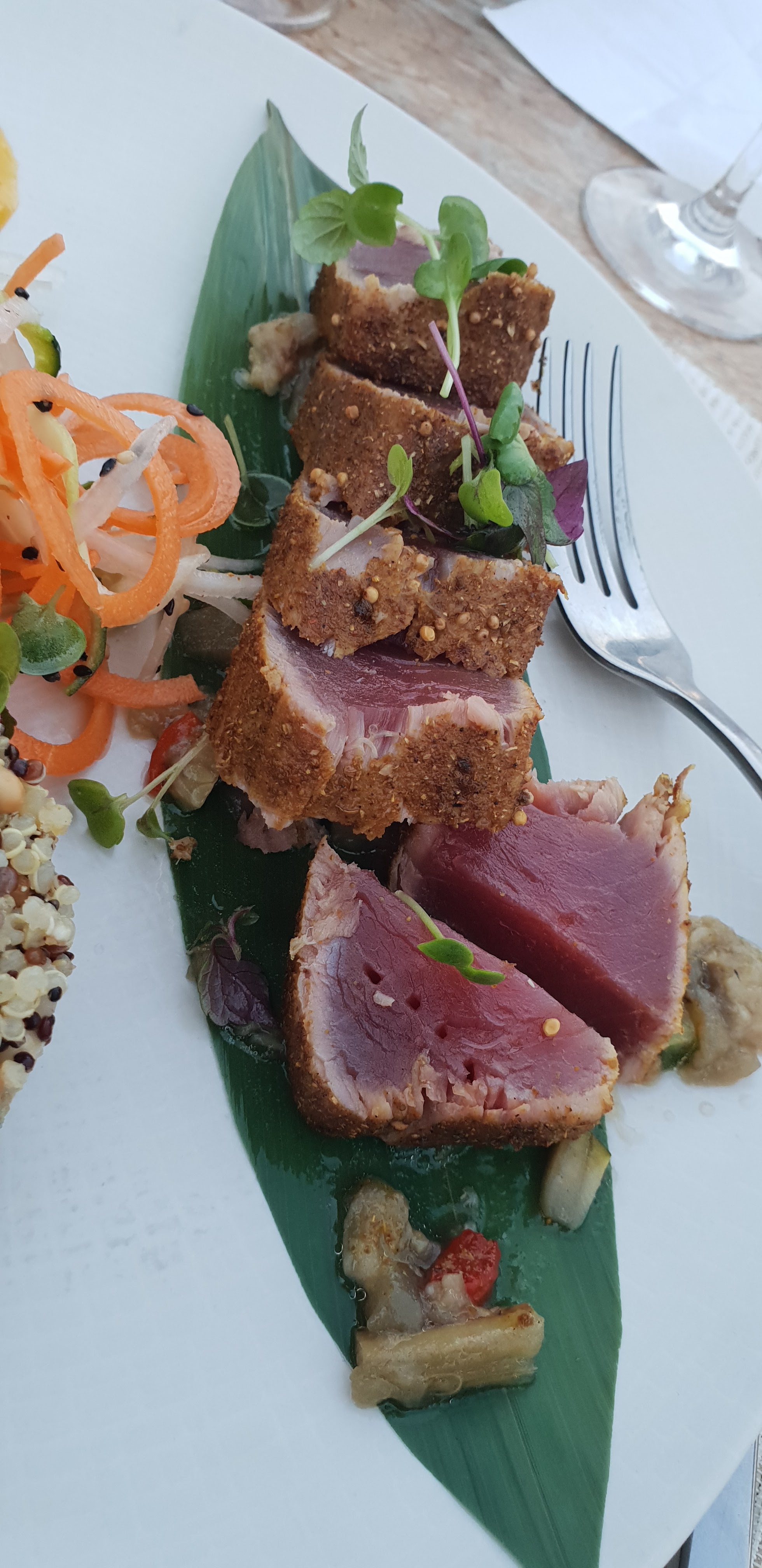 On s'est fait plaisir pour notre dernier déjeuner dans ce resto de plage, presqu'un gastronomique. Des entrées aux plats, de l'exotisme avec des touches asiatiques : bar sauce japonaise délicieux, les ravioles aux crevettes pour l'apéro originales. Le service est détendu et à l'écoute. La qualité et la déco se paye, au moins on ne se fait pas arnaquer 👍