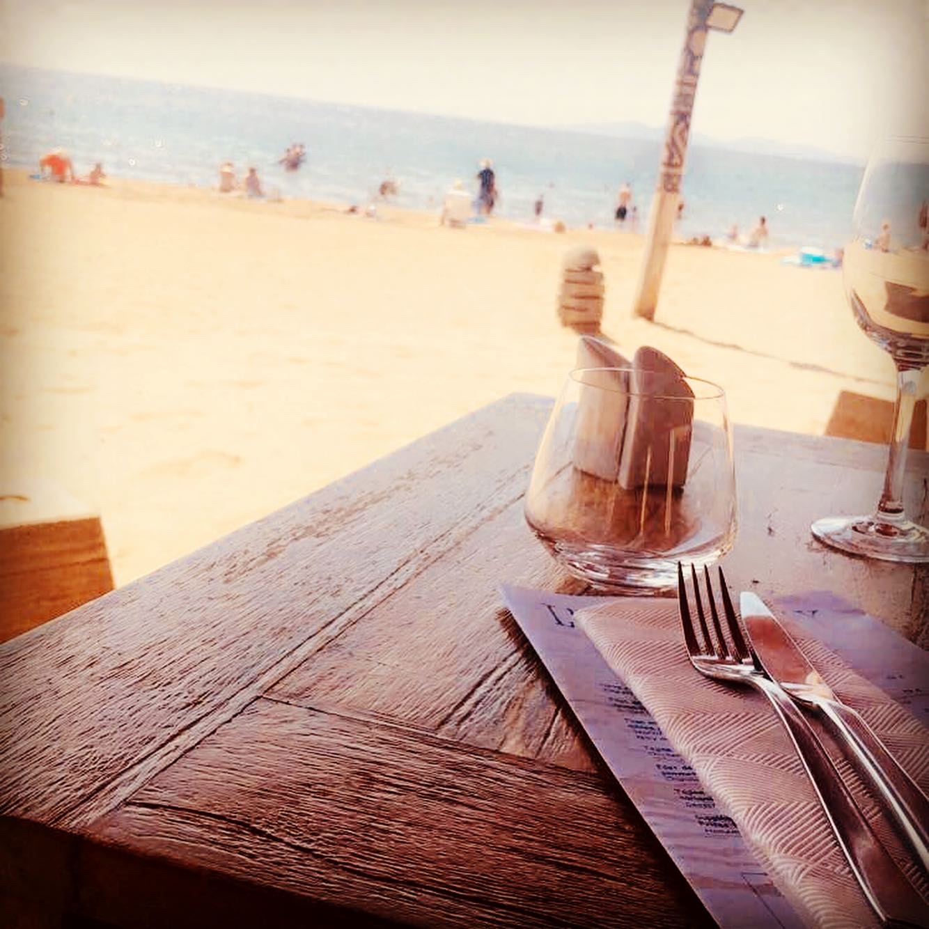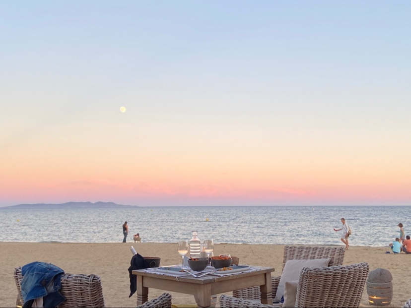 Tout nous pourrait faire penser que nous sommes en Californie où pour Heminguay le plus terrible hivers fut un été à San Francisco mais ici on est à La Londe Les Maures où l’été est bien chaud et les tables du restaurant sont posées sur le sables d’où on ne manque pas la vue sur la mer. Attention le soir il y a beaucoup de moustiques