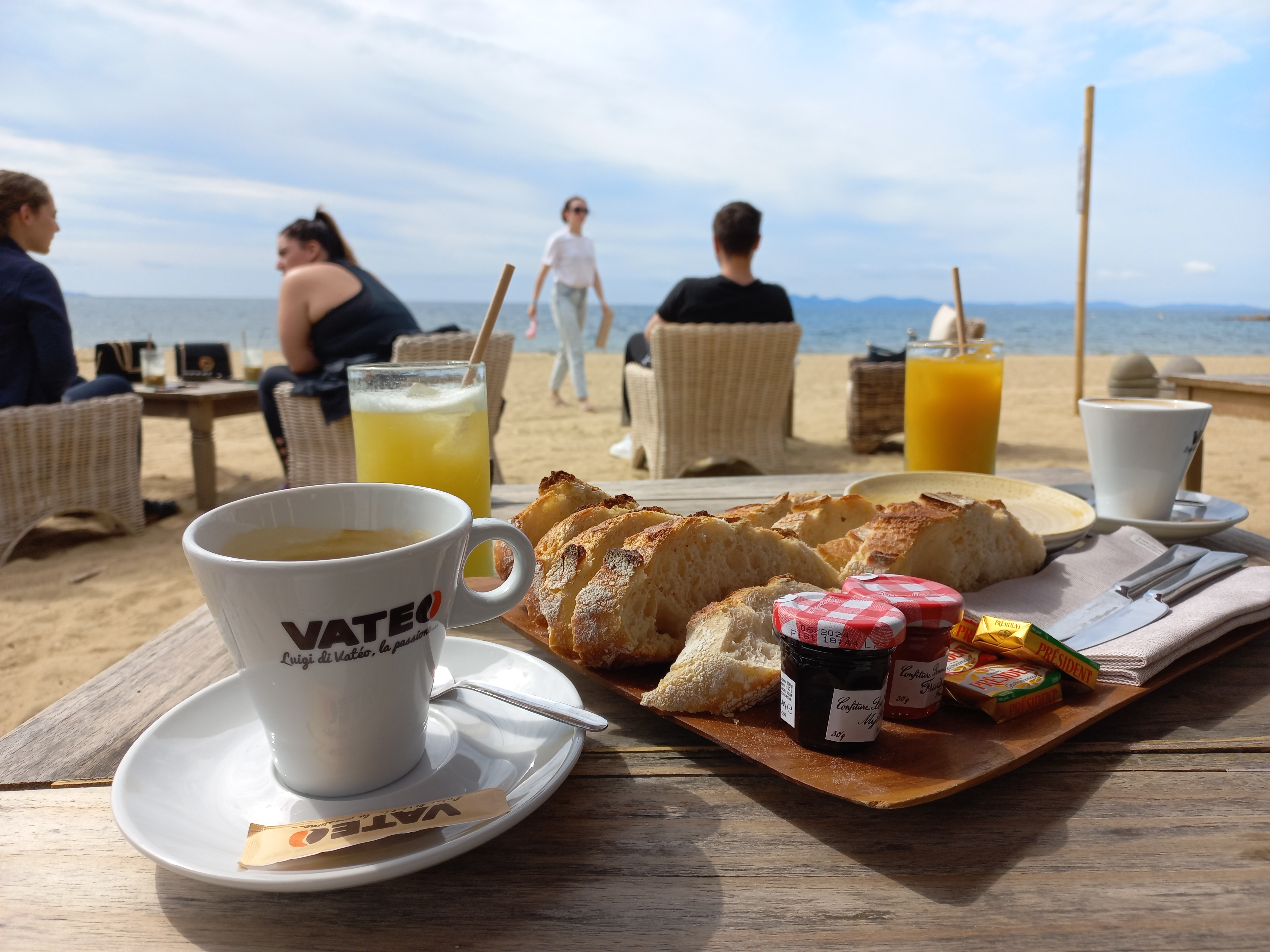 Petit déjeuner pendant les vacances d'été, sans résa, jolie présentation de tartines de bon pain, beurre (sans proposition de choix), confiture (sans proposition de choix), boisson chaude, jus de fruits bouteille (non pressé) Lover dans des fauteuils confortables, les pieds dans le sable ... et une envie d'aller plonger ! Il ne manquait qu'un accueil chaleureux, et un sourire ... et c'était vraiment chouette !!!!