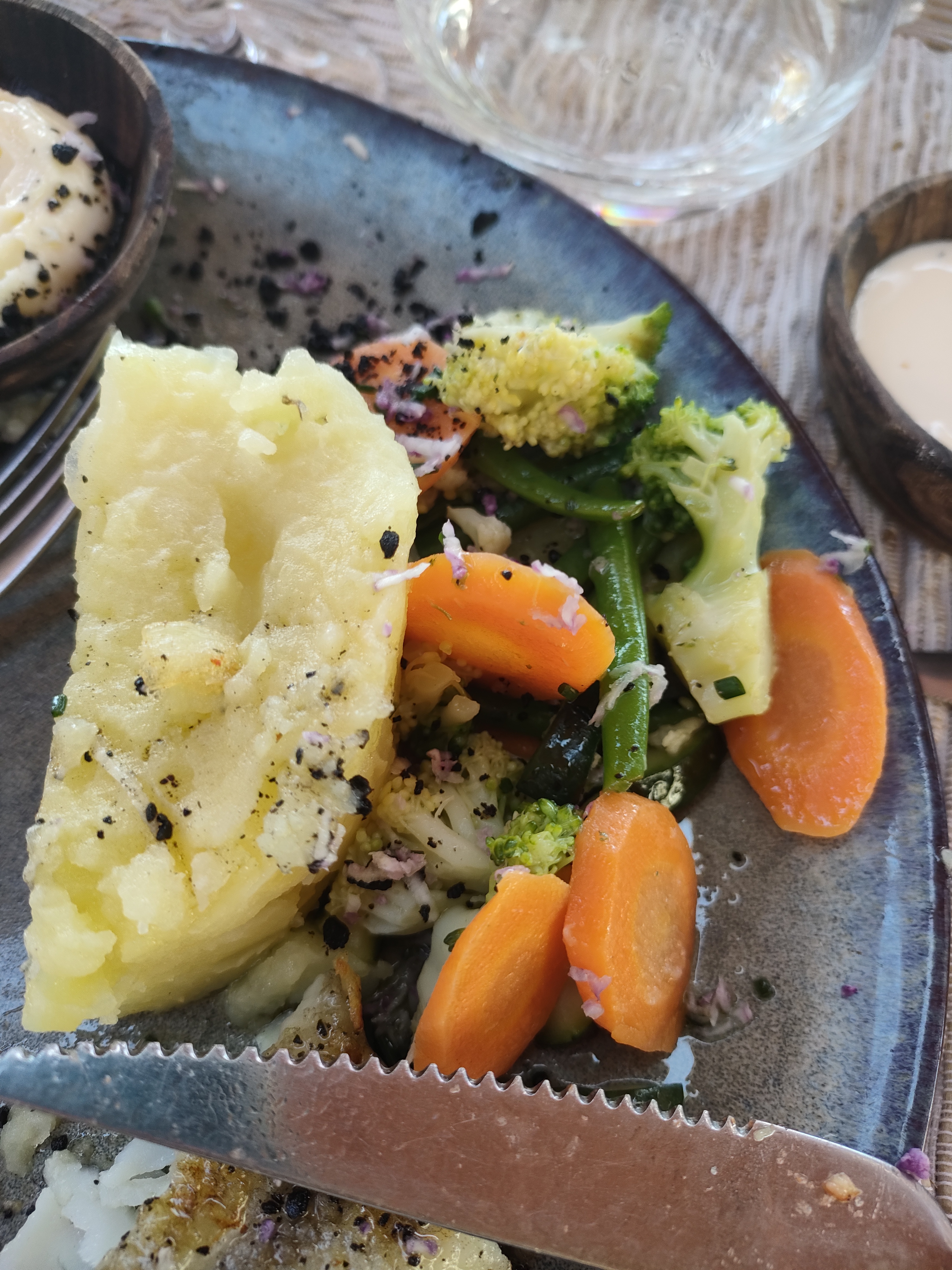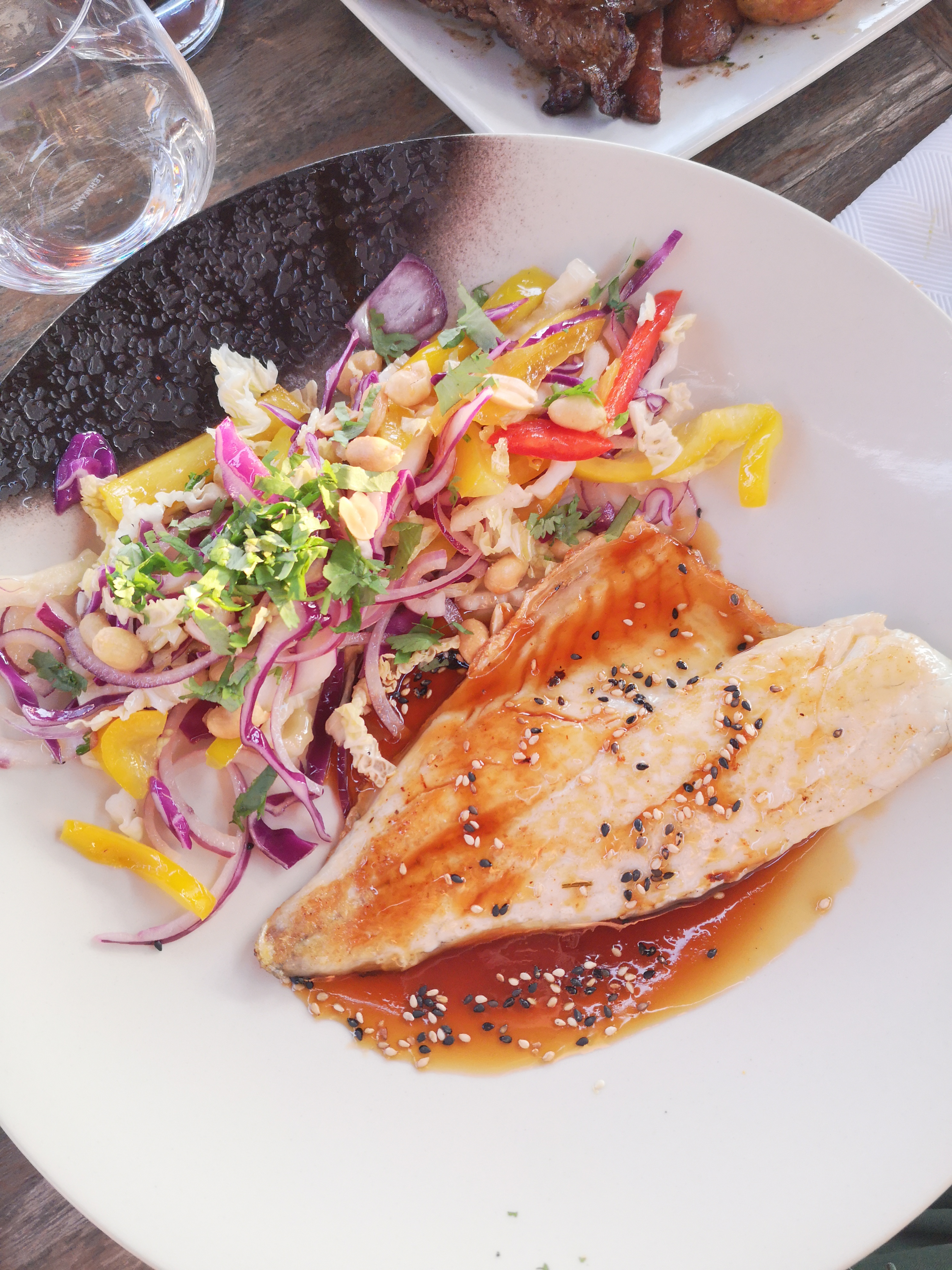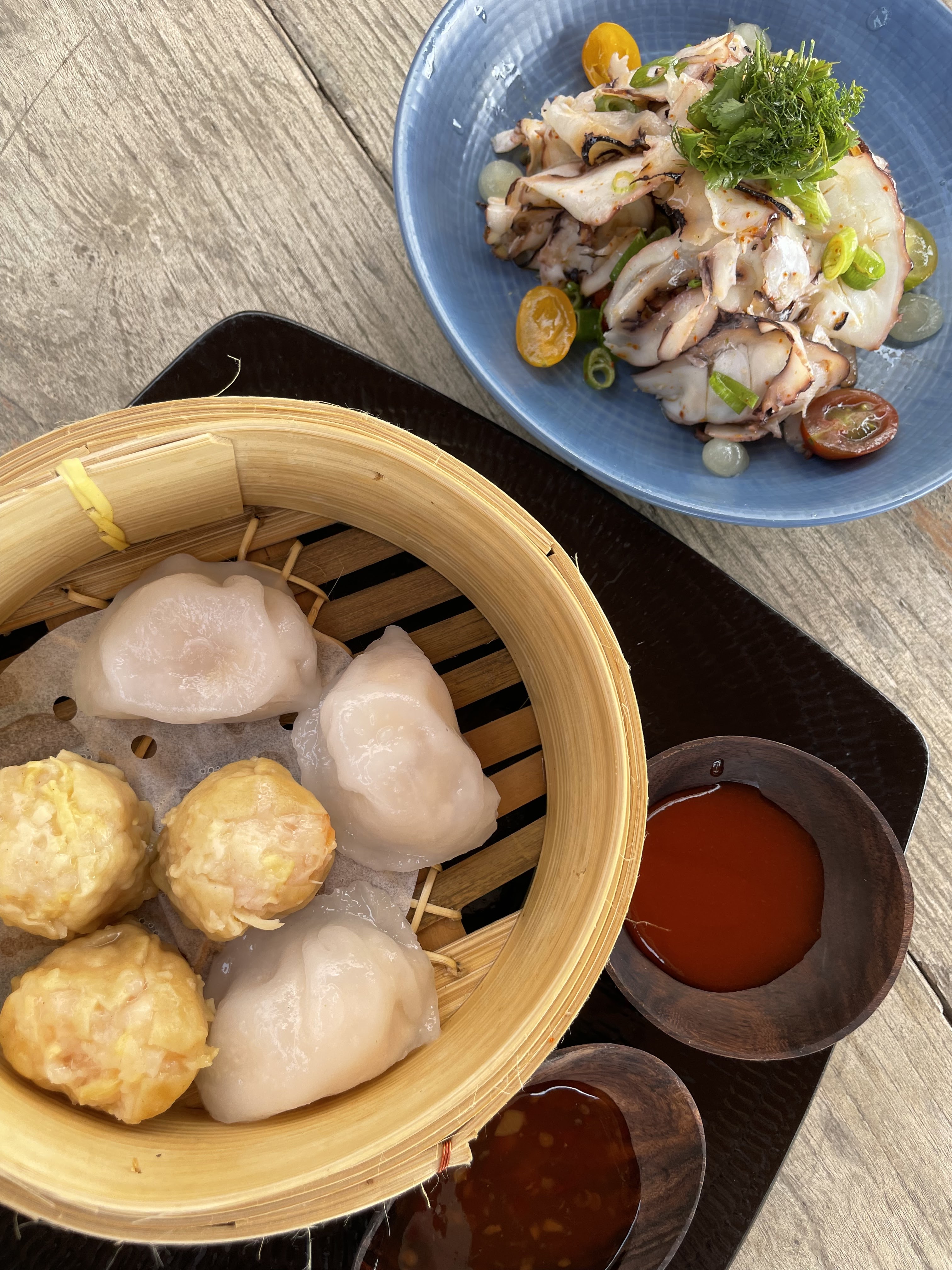 Cadre superbe, personnel très attentionnés et compétents cependant nous avons pris une entrée le Dim Sum ( 6 raviolis aux crevettes ) titre très alléchant mais ce n’étaient que de vulgaires raviolis à la vapeur surgelés avec des sauces toutes prêtes ! Dommage car lorsque l’on va à un restaurant de qualité on ne s’attend pas à déjeuner des surgelés comme à la maison ! Le poisson était bien cuit accompagné de légumes frais. En ce qui me concerne nous sommes dans une région où la cuisine méditerranéenne est basée a l’huile d’olive et malheureusement les légumes étaient cuisinés au beurre ! Avec toutes les huiles d’olive de la région au goût exquis ils ont préféré le beurre qui dénature la fraîcheur des légumes on avait l’impression de manger une plaquette de beurre !