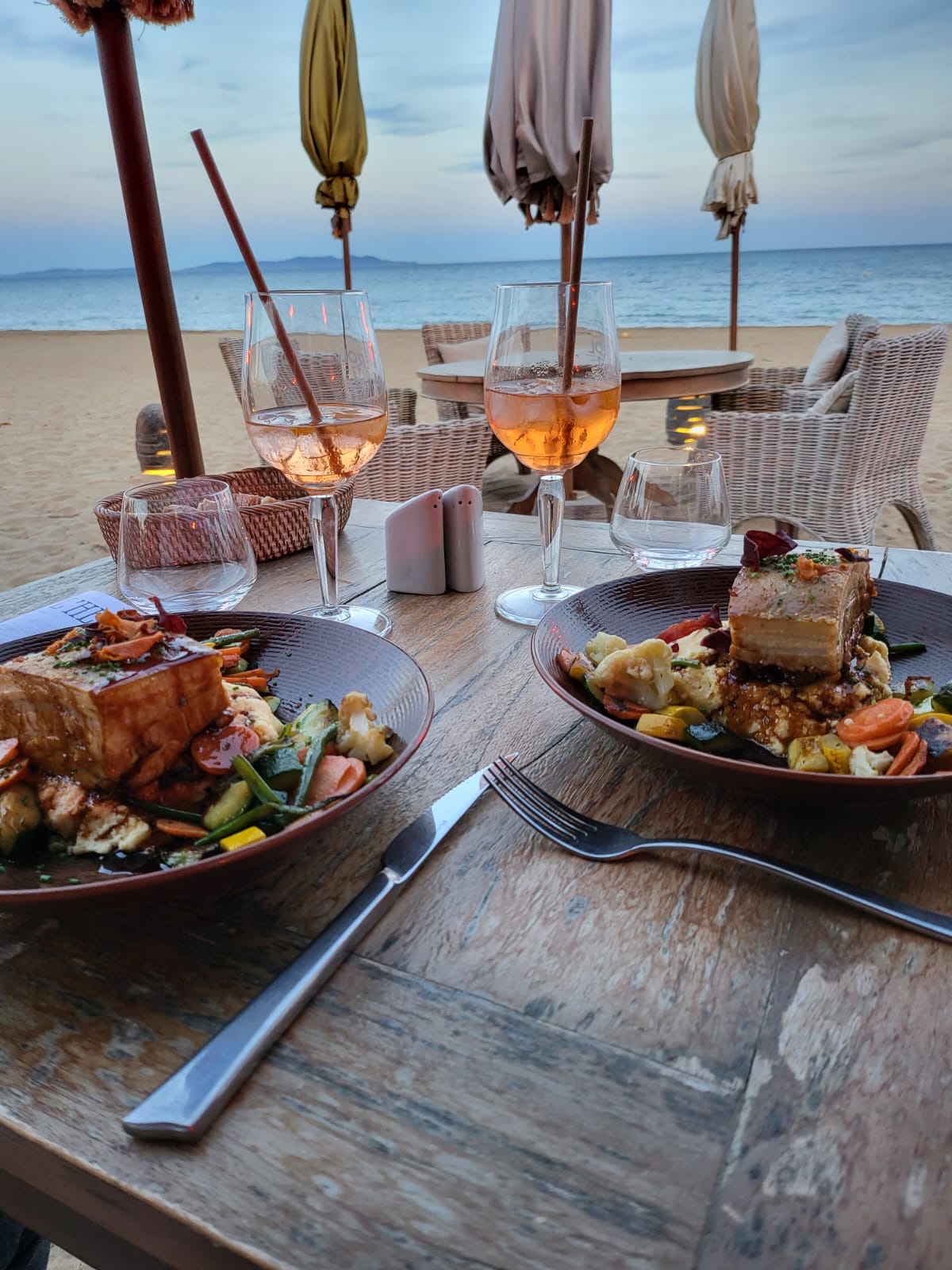 L'esthétique du lieu est agréable, il invite au voyage, à la détente, et dîner sur la plage, les pieds dans la sable, le regard tourné vers la mer, vers le soleil qui disparaît à l'horizon, c'est un privilège agréable. La cuisine est réalisée avec des produits frais, les mets sont joliments présentés dans l'assiette. J'ai mis quatre étoiles uniquement parceque j'ai trouvé dommage que les serveurs s'interpellent entre eux à plusieurs mètres de distance alors qu'ils sont à votre table, ils pourraient être plus discrets, cela ne cadre pas avec le côté feutré de l'hemingway, et en regardant une serveuse qui présentait une bouteille de vin rouge en disant seulement voilà l'rouge ça fait un peu gargote quand même !