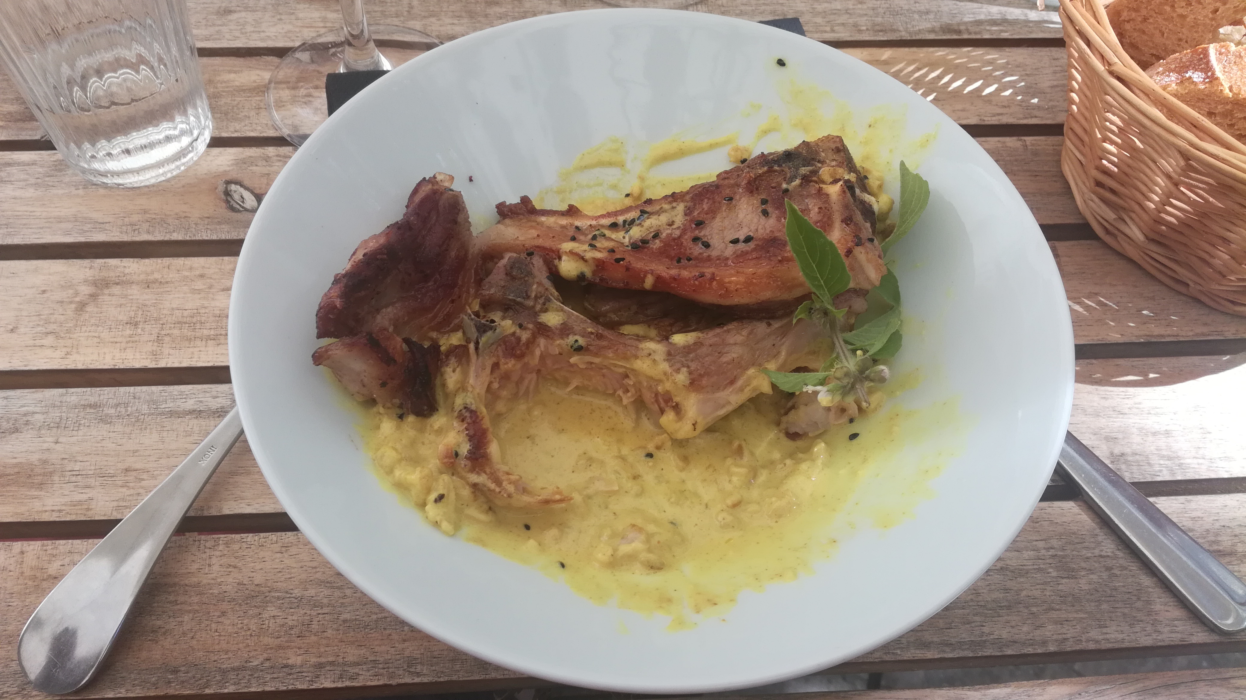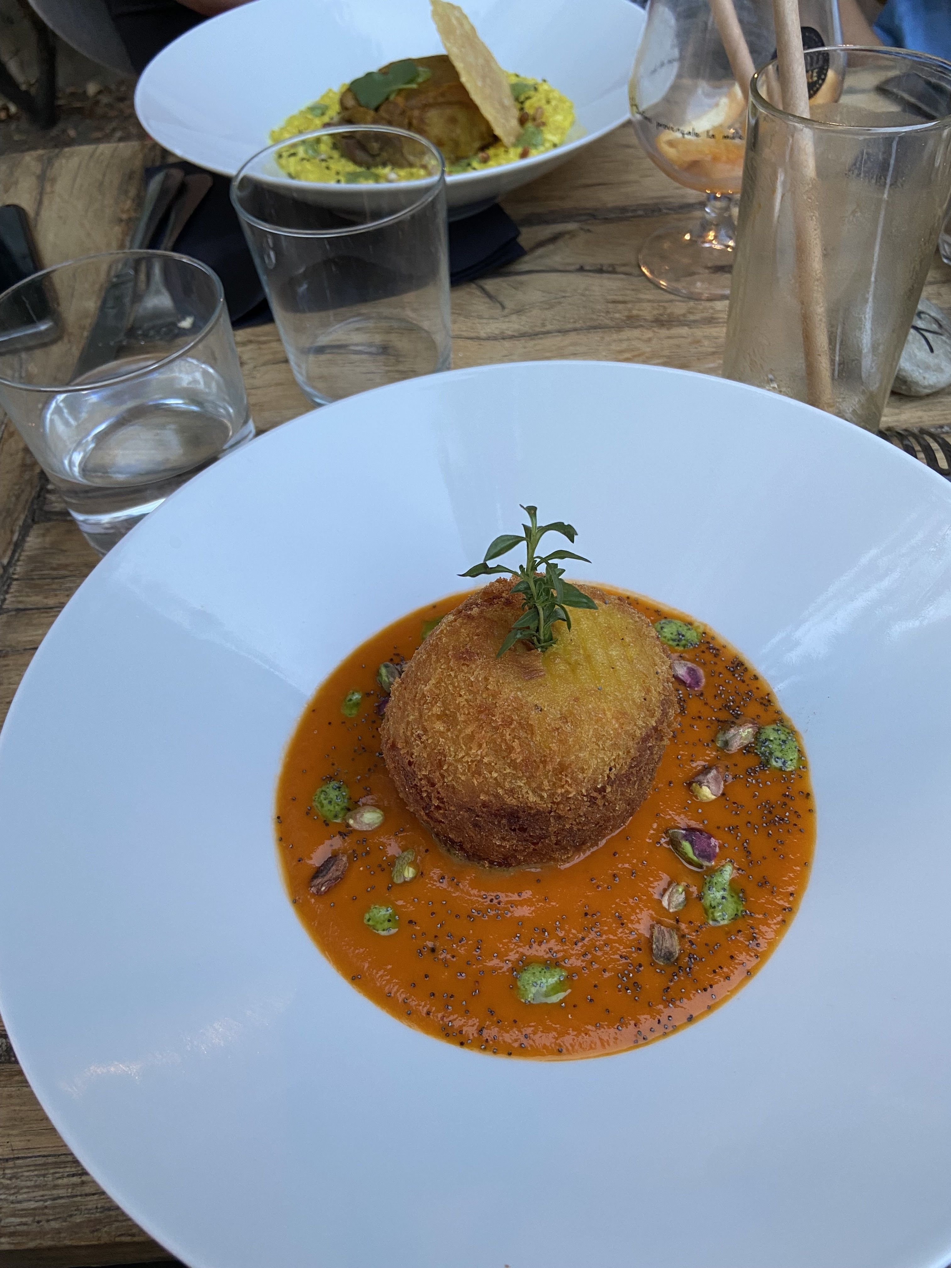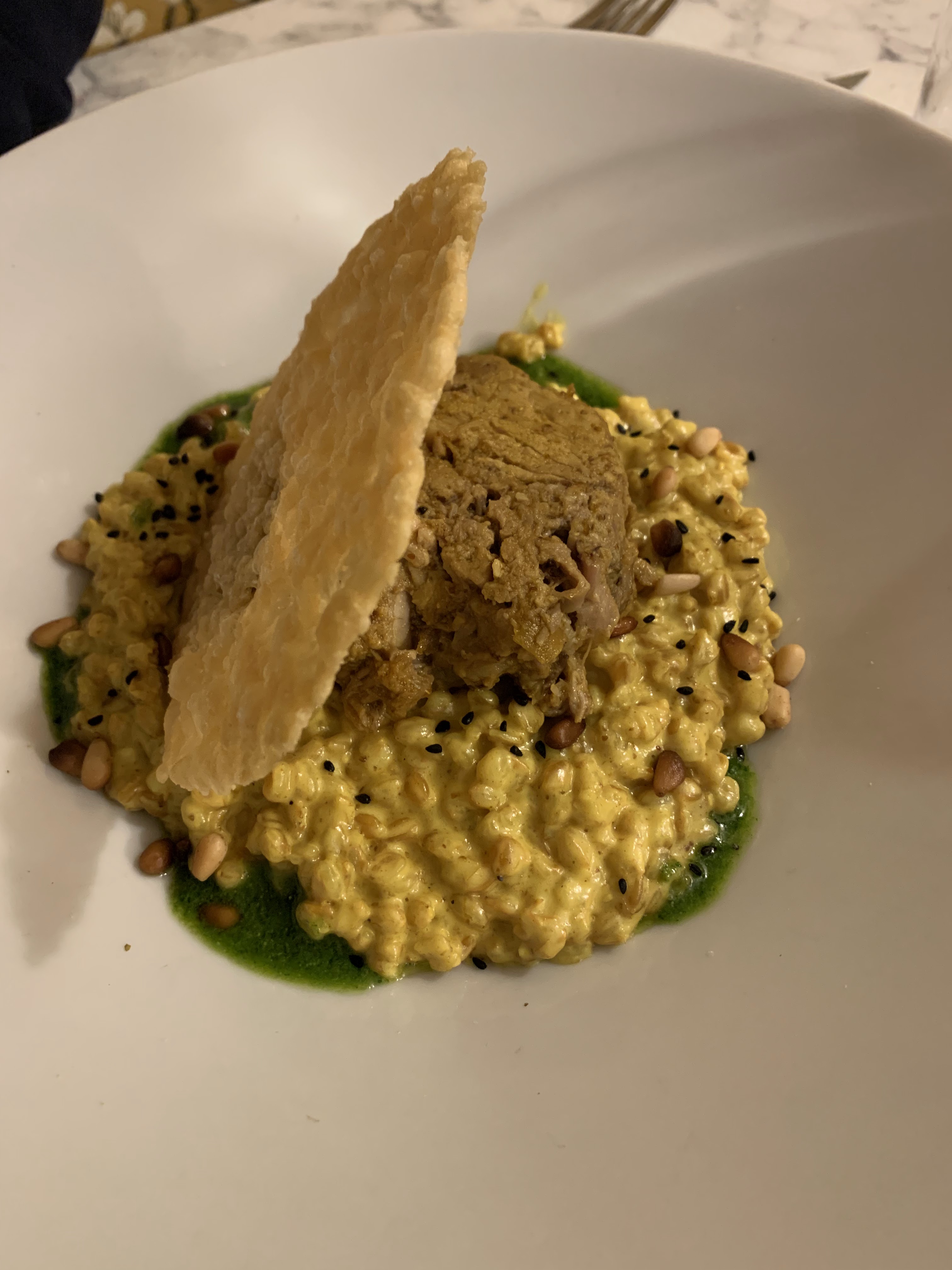 Veloute de panais, la croquette d’escagots mériterait davantage de foudant, peut être un beurre persillé. Attention le vin au verre, la quantité est vraiment trop faible, une demi dose par rapport aun portion normale Gnocchi de ricotta par pitié mettez un fromage avec du gout , gnocchi bien faites mais fade