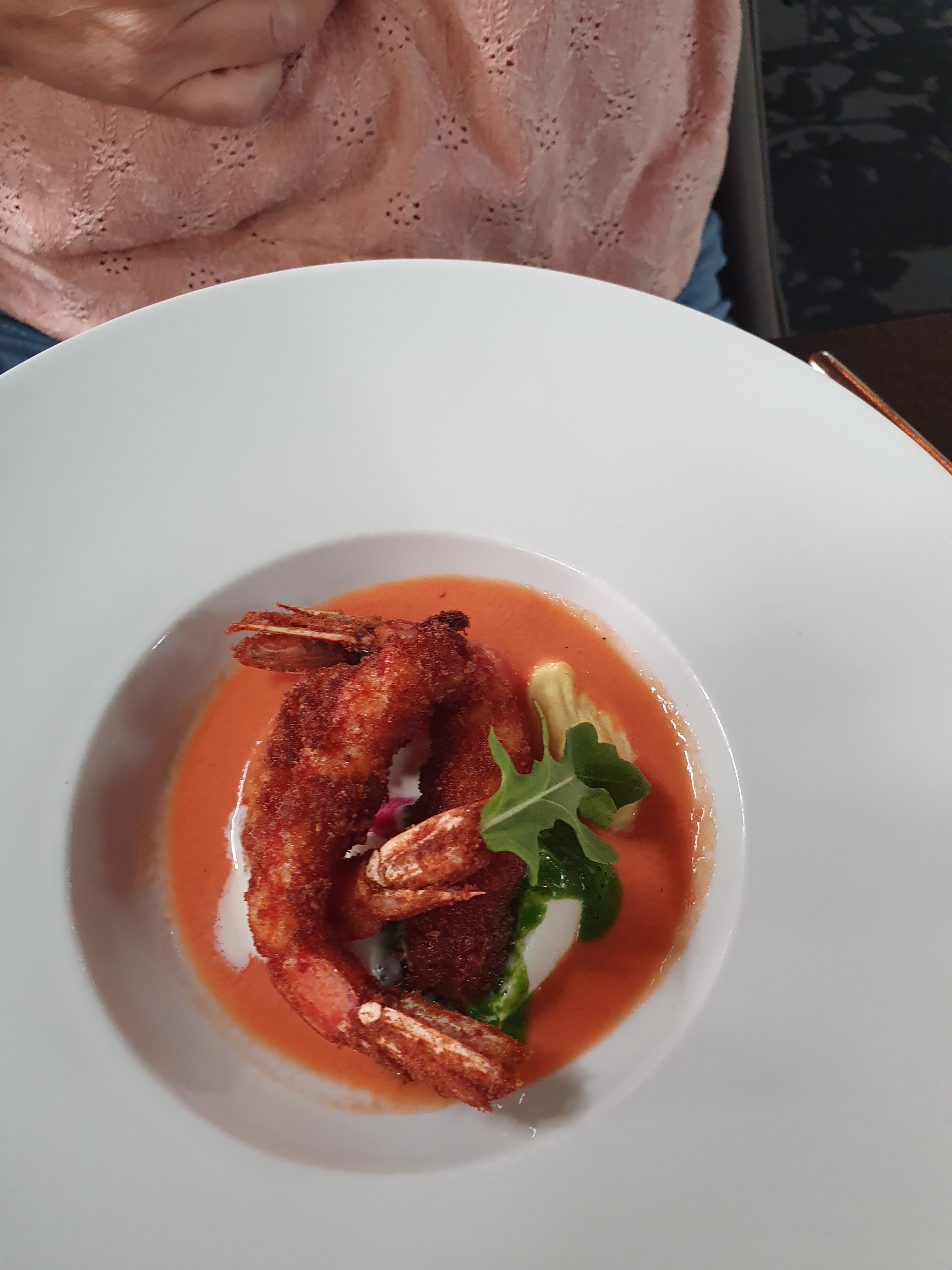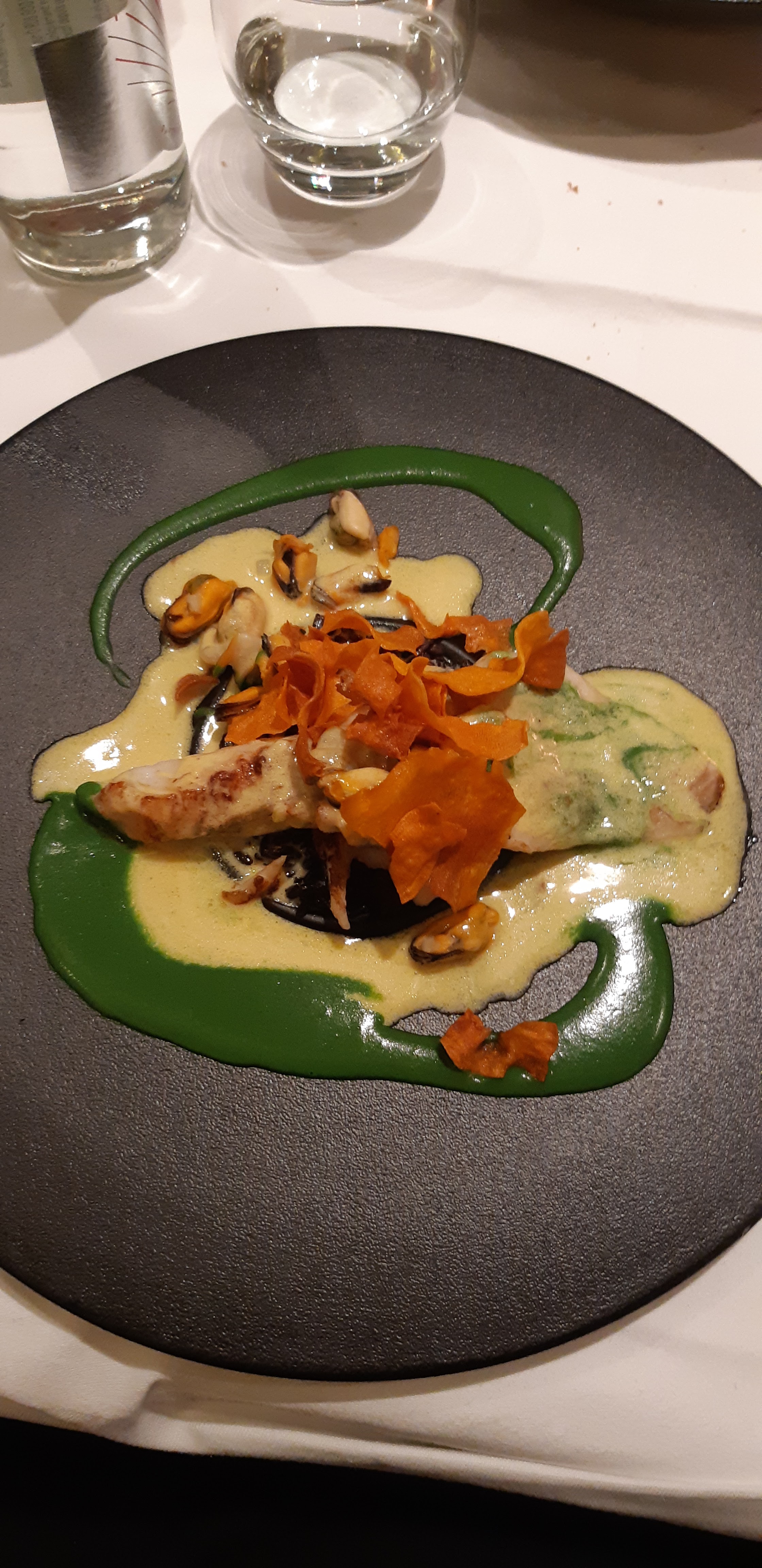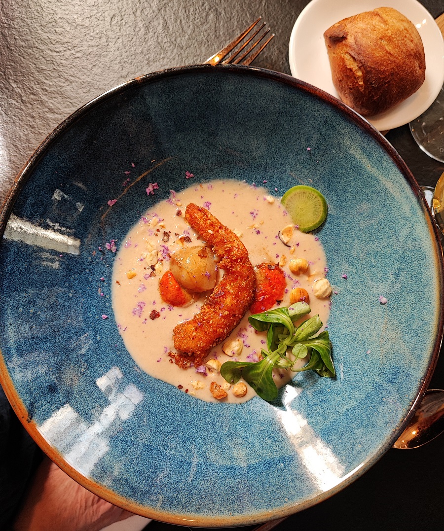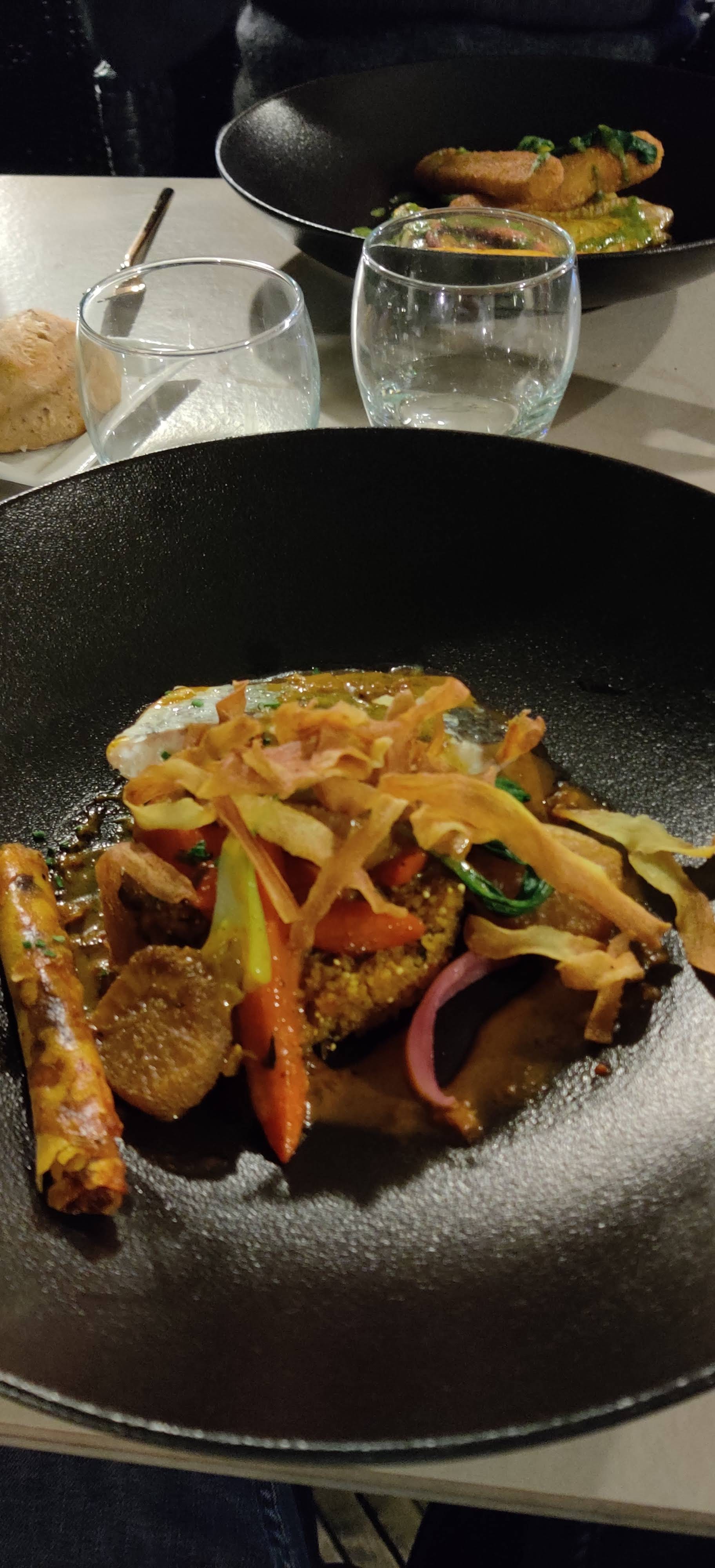 La soirée d'hier était fabuleuse culinairement parlant. Nous y avons passé un moment agréable en famille. Seul bémol la salle était trop bruyante et à la fin de la soirée c' était difficile de se comprendre. Le menu que j'ai choisi un Terre et Mer à 32€ Entrée La gambas sauvage Croustillants de queues de gambas sauvages, chapelure de panko, aïoli maison, tomate provençale : fabuleuse! Une gambas de plus et moins de bisque gelifiée peu être, mais la je chipote 😁 Le dos de cabillaud légèrement fumé poêlée de légumes méditerranéens, croustillant de pommes de terre, jaune d’oeuf au plat, jus de crustacés et épices : magnifique ! Mon œuf était un peu trop cuit mais le cabillaud était nacré parfaitement maîtrisé 🤗 Le vacherin pêche et framboise crème légère au mascarpone, coulis de fruits rouges ! Divin rien à ajouter 🤤