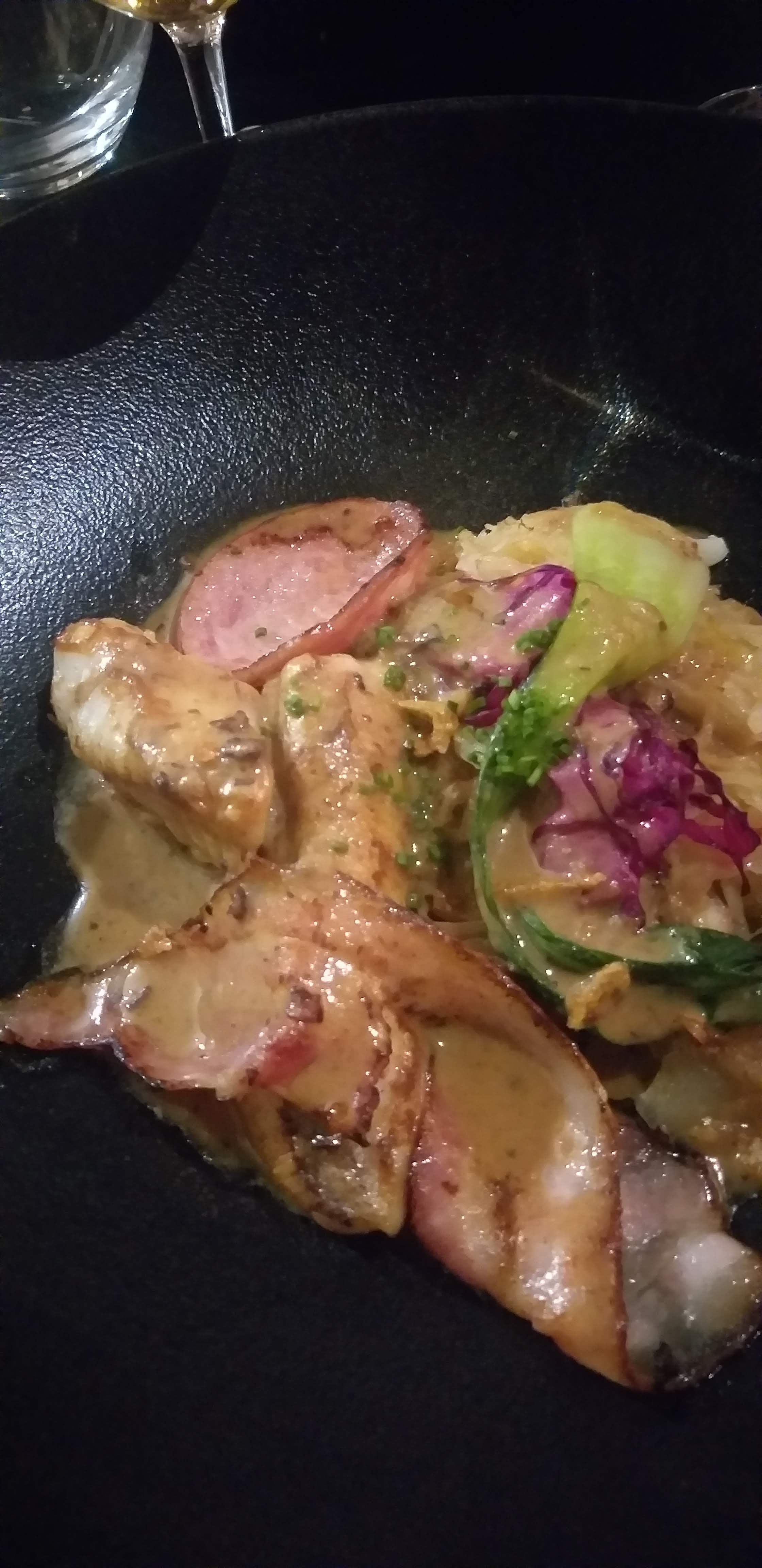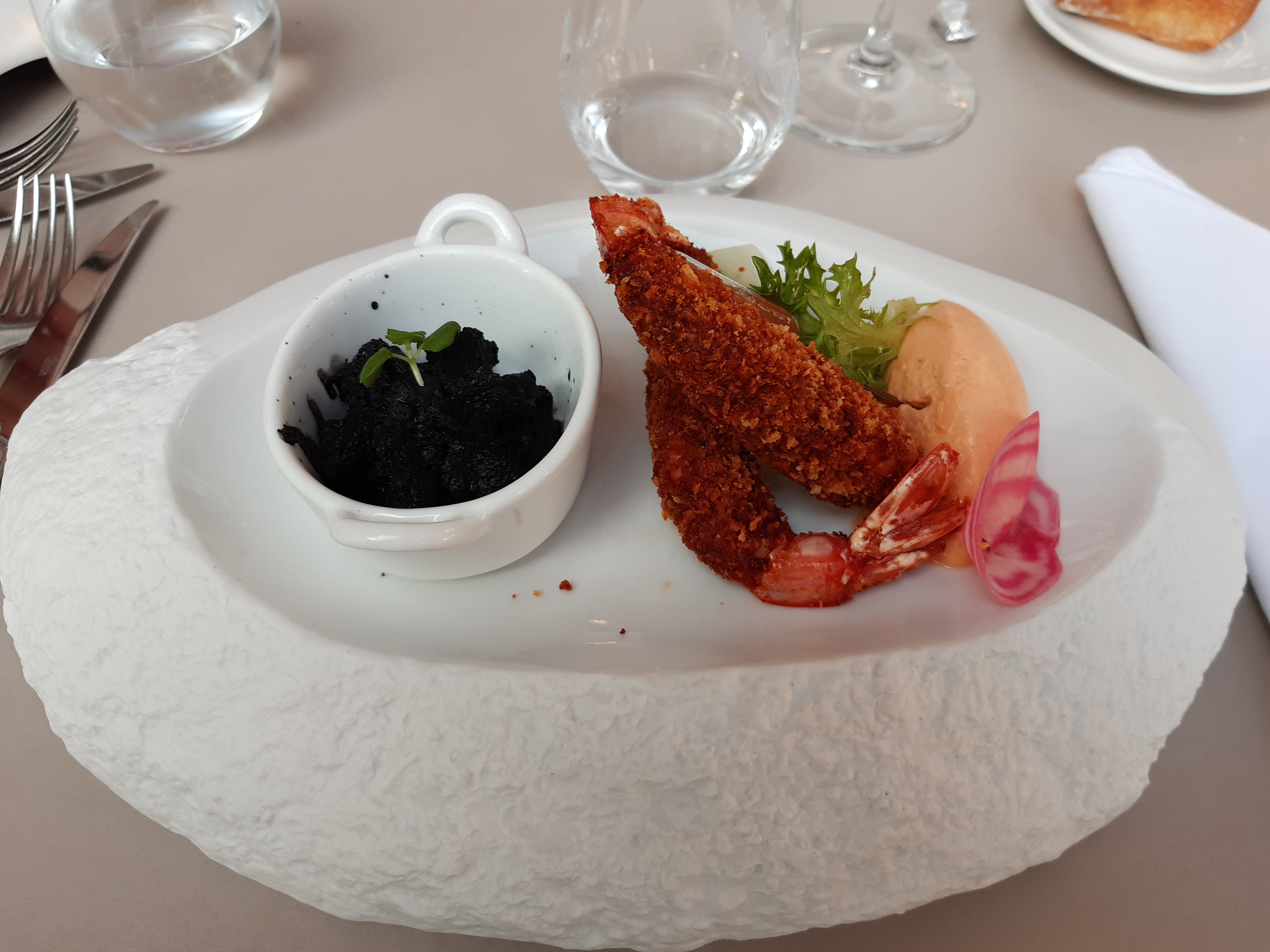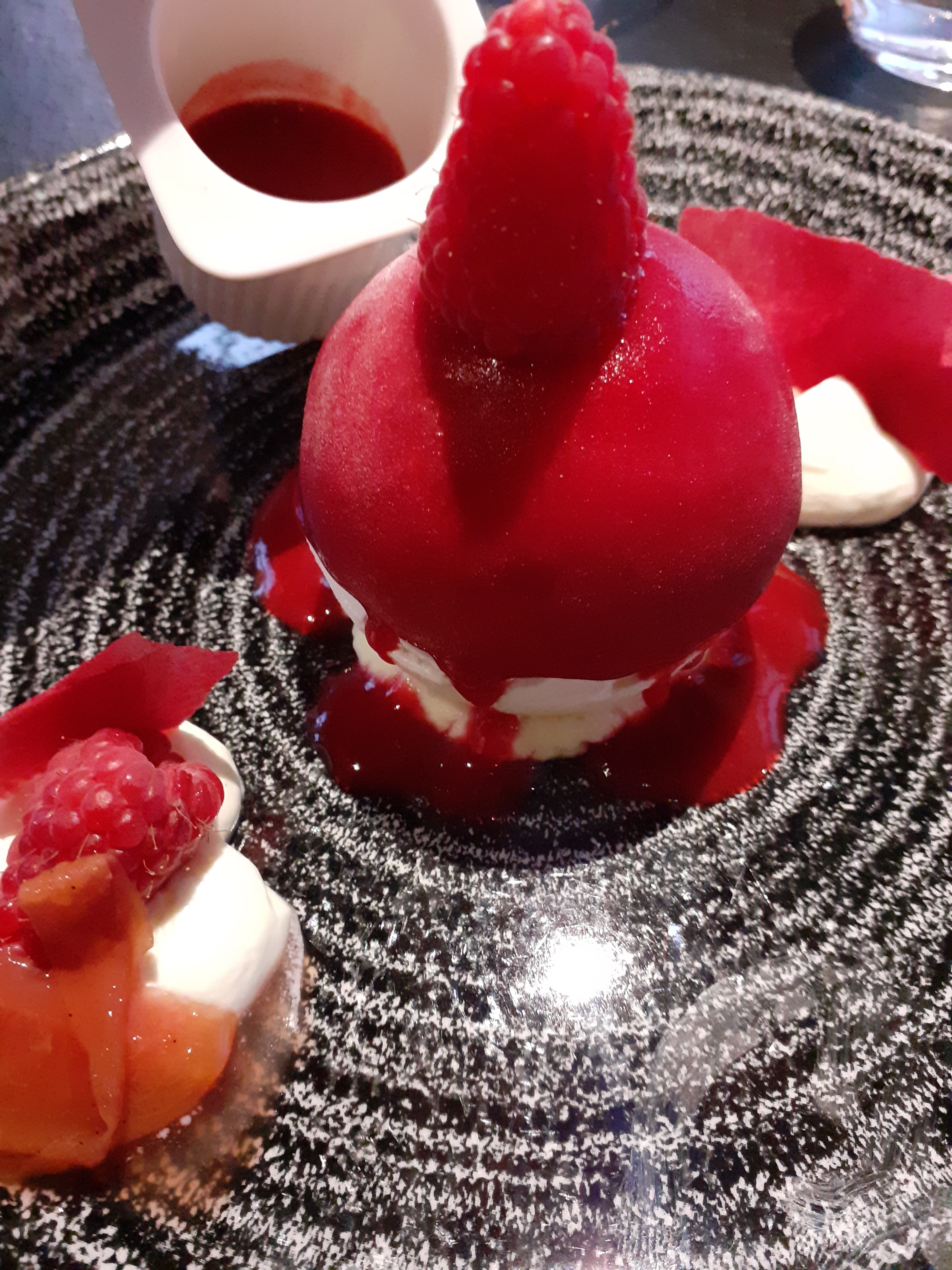 La soirée d'hier était fabuleuse culinairement parlant. Nous y avons passé un moment agréable en famille. Seul bémol la salle était trop bruyante et à la fin de la soirée c' était difficile de se comprendre. Le menu que j'ai choisi un Terre et Mer à 32€ Entrée La gambas sauvage Croustillants de queues de gambas sauvages, chapelure de panko, aïoli maison, tomate provençale : fabuleuse! Une gambas de plus et moins de bisque gelifiée peu être, mais la je chipote 😁 Le dos de cabillaud légèrement fumé poêlée de légumes méditerranéens, croustillant de pommes de terre, jaune d’oeuf au plat, jus de crustacés et épices : magnifique ! Mon œuf était un peu trop cuit mais le cabillaud était nacré parfaitement maîtrisé 🤗 Le vacherin pêche et framboise crème légère au mascarpone, coulis de fruits rouges ! Divin rien à ajouter 🤤
