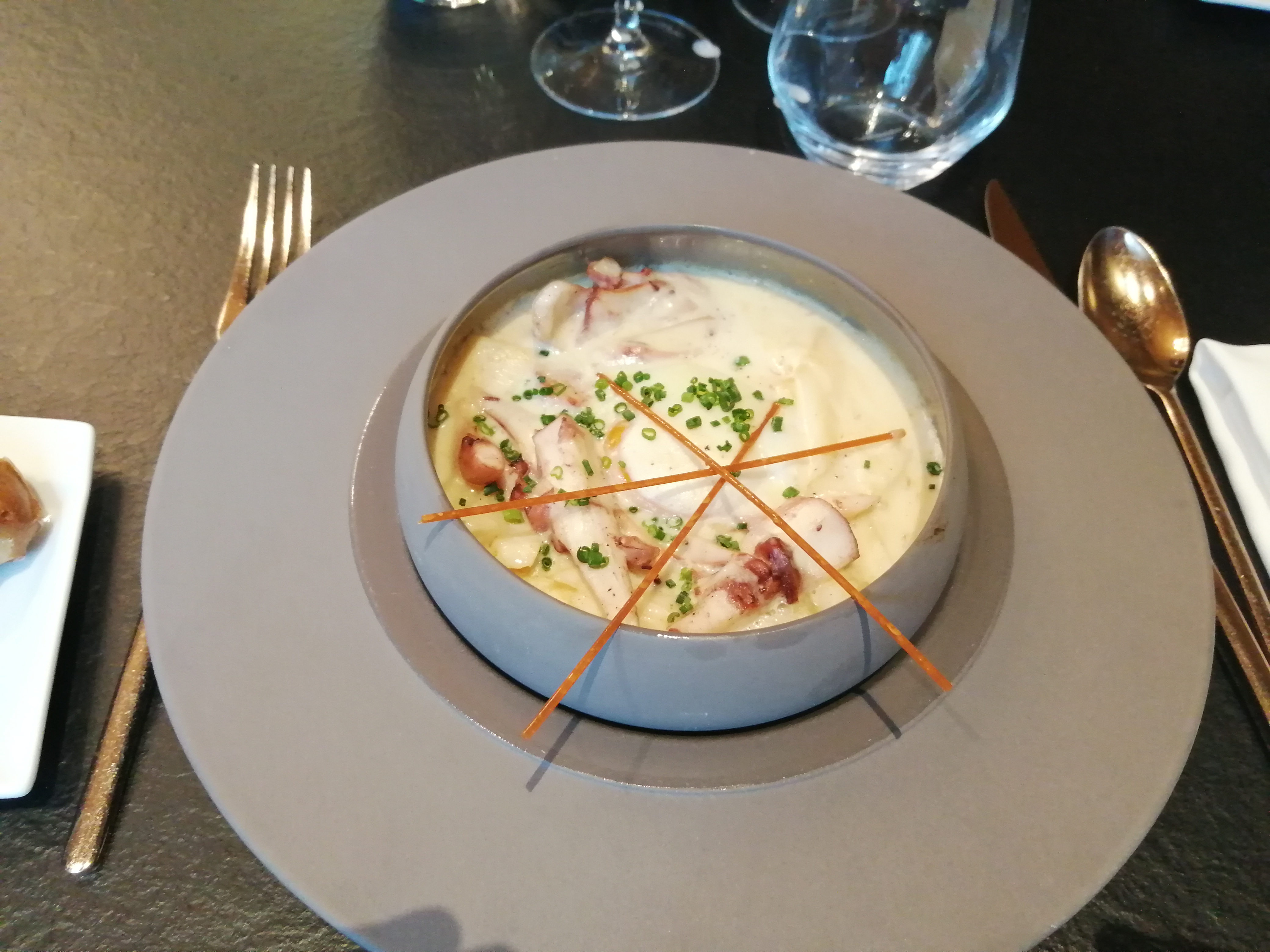 Un première expérience avec un avis assez partagé. Cadre convenable avec quelques défauts à corriger (lustre quasi éteint tant les ampoules sont manquantes) . Chef, attention aux excès d'innovation. La purée potimarron gélifiée froide et l'avant dessert (riz au lait) c'est pas bon! Cela dit, j'y retournerai pour affirmer mon avis.