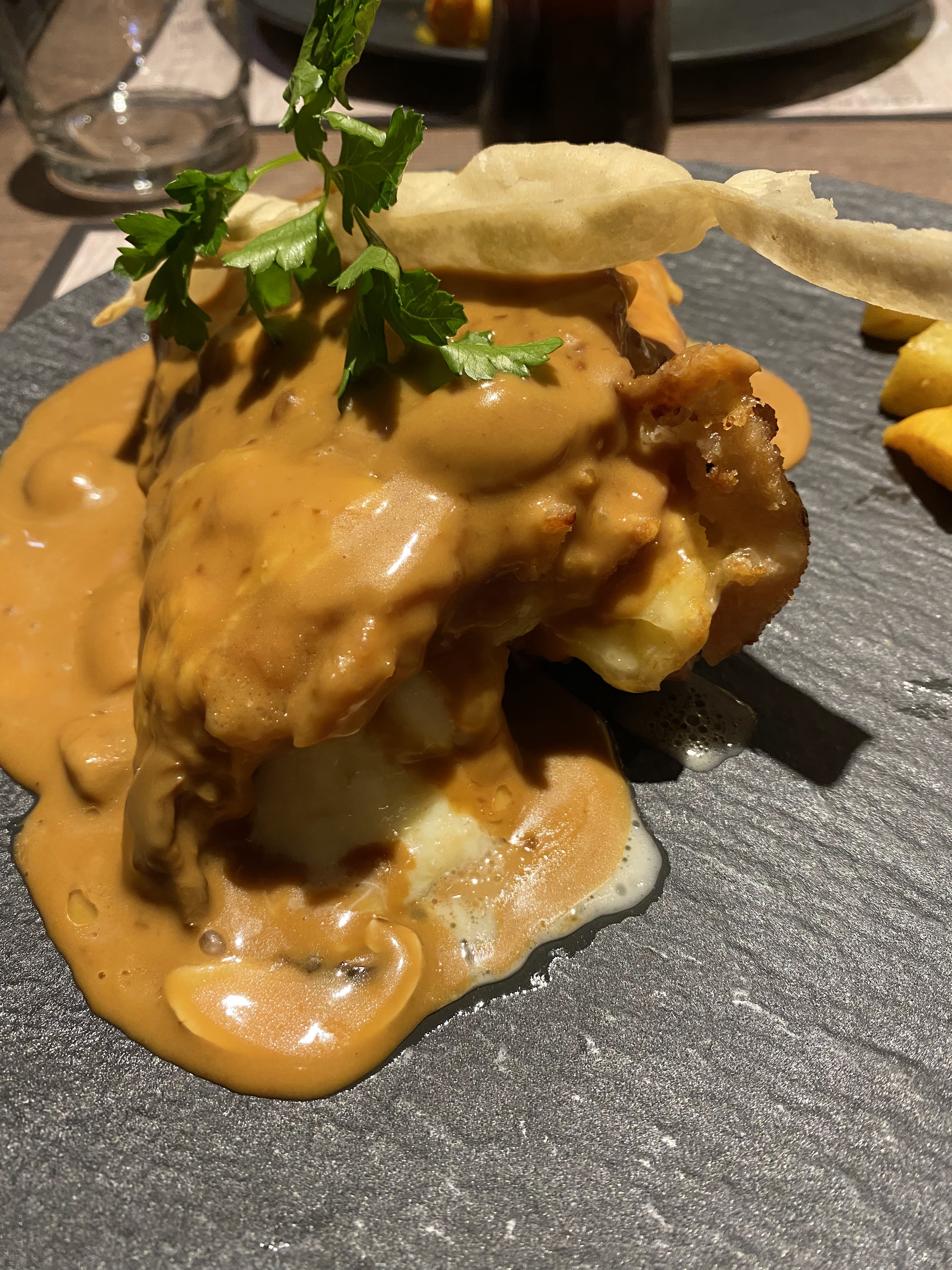 Joli décor, personnel efficace, sympa et accueillant, nous avons pris 1 cordon bleu au mortier, 1 vrai régal, une volaille d'une tendreté et si copieux que nous avons demandé à emporter le reste. Nous reviendrons avec plaisir 😊😊😊