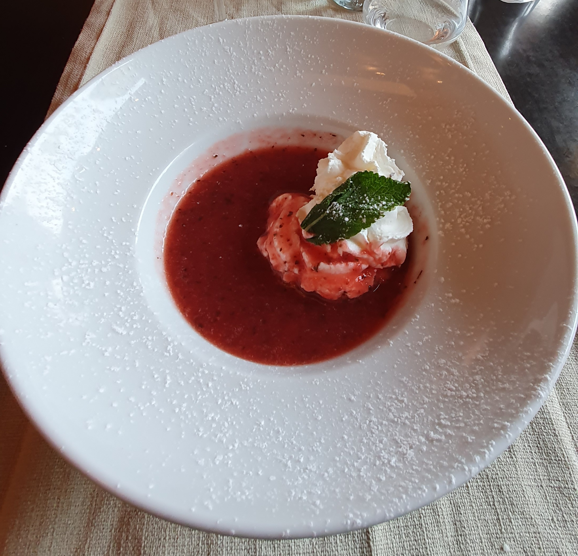 Assez déçu au final: le gravelax n'en était pas, juste qq cubes de saumon cru jetés à la hâte sur de la salade; selle d'agneau à point arrivée carbonisée, et pour le trifle de fraises, je cherche encore les fraises ds le trop plein de crème.