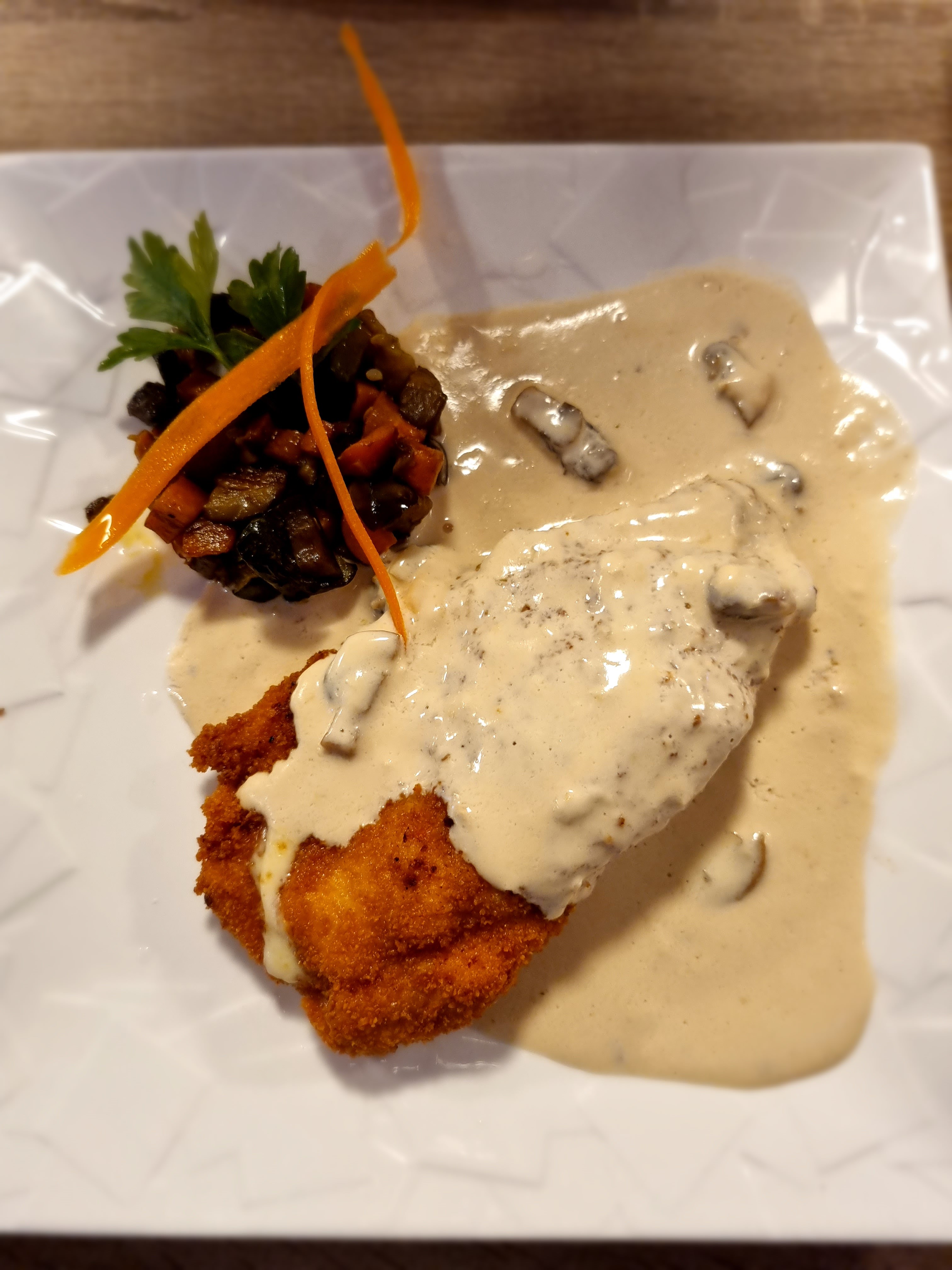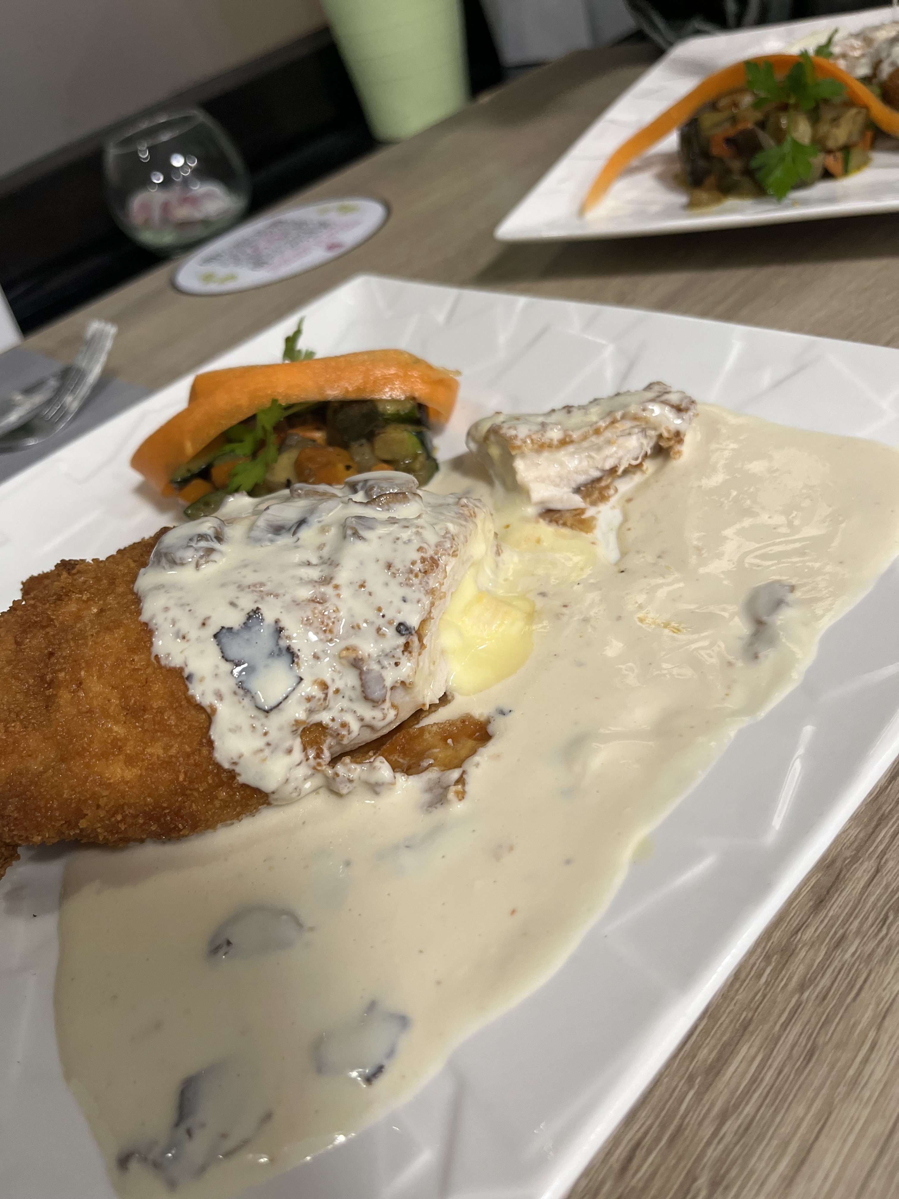 La nourriture était superbement préparée. Nous avons commandé le veau Cordon bleu qui était le premier que nous l'avions. Belle sauce et ce n'est pas si salé même si elle est pleine de fromage. La viande était rendue et savoureuse. Le cordon de poulet était également savoureux. Nous avons mangé des salades de fruits de mer et nous aimons la saison/sauce qui était agréable à manger avec le pain. Ce restaurant a également été recommandé par un chauffeur de taxi local qui fréquente ce restaurant. C'est donc un restaurant incontournable. Un personnel très gentil et sympathique également. Ce n'est pas si cher aussi.