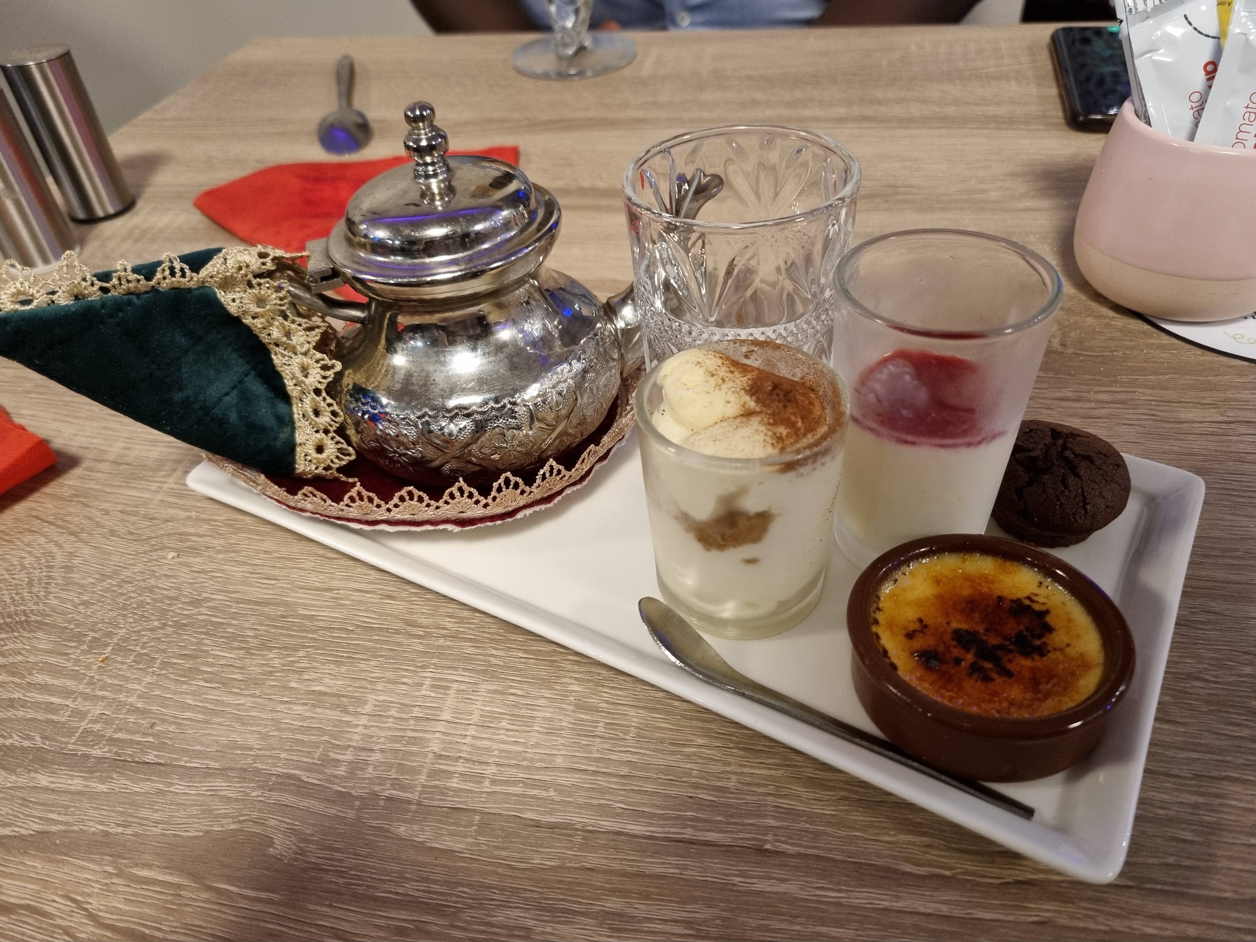 Plats bons mais franchement un effort pourrait être fait au niveau de la quantité… on en ressort pas repus… un plus gros cordon bleu et un peu plus de frittes / pâtes seraient pas de refus. La taille du tiramisu pareil… une vrai arnaque. Et le thé n’est pas réussis, loin du vrai thé à la marocaine. Par contre un vrai + pour l’accueil, très très sympathique