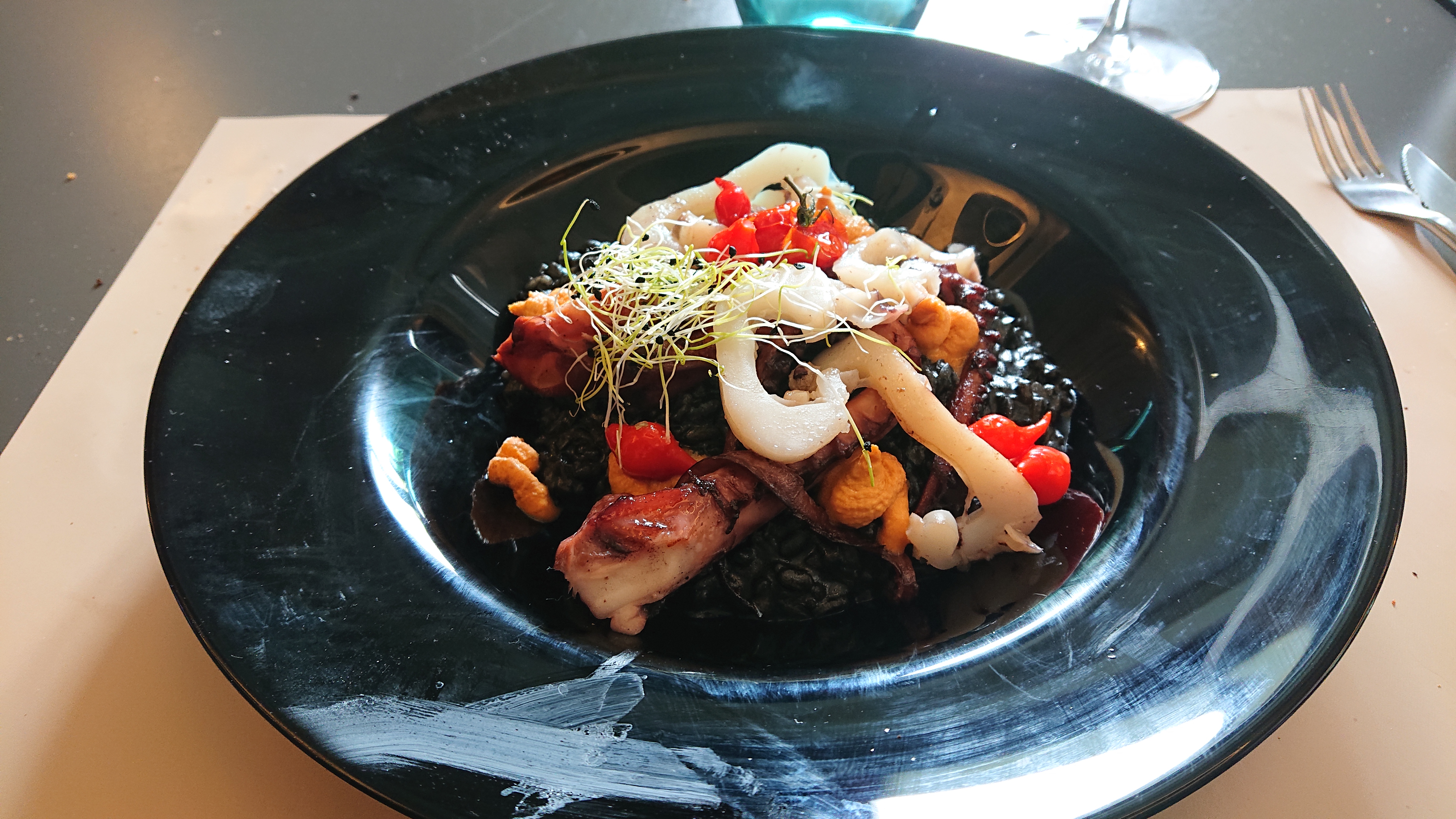 Un vrai régal en famille ce midi. Carpaccio de daurade pétillant de saveurs, risotto à la seiche délicieux, et un coulant au chocolat fondant et parfait 👌 Je reviendrai