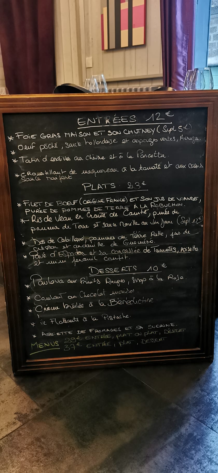 Joli petit restaurant avec une carte à l'ardoise. Le choix se fait entre 4 ou 5 entrées, 4 ou 5 plats et 4 ou 5 desserts. Ce qui nous assurent une qualité à mettre en avant ! Nous avons choisi la fricassée d'escargots et le foie gras infusé au whisky en entrée, un filet de bœuf et sa purée et en dessert une crème brûlée et un cheese cake. Mention spéciale pour la pièce de bœuf qui se coupait comme du beurre ! La carte des vins est très bien fourni, vous aurez beaucoup de choix. Tres contente d'avoir découvert ce restaurant où l'accueil est au petits soins 👌