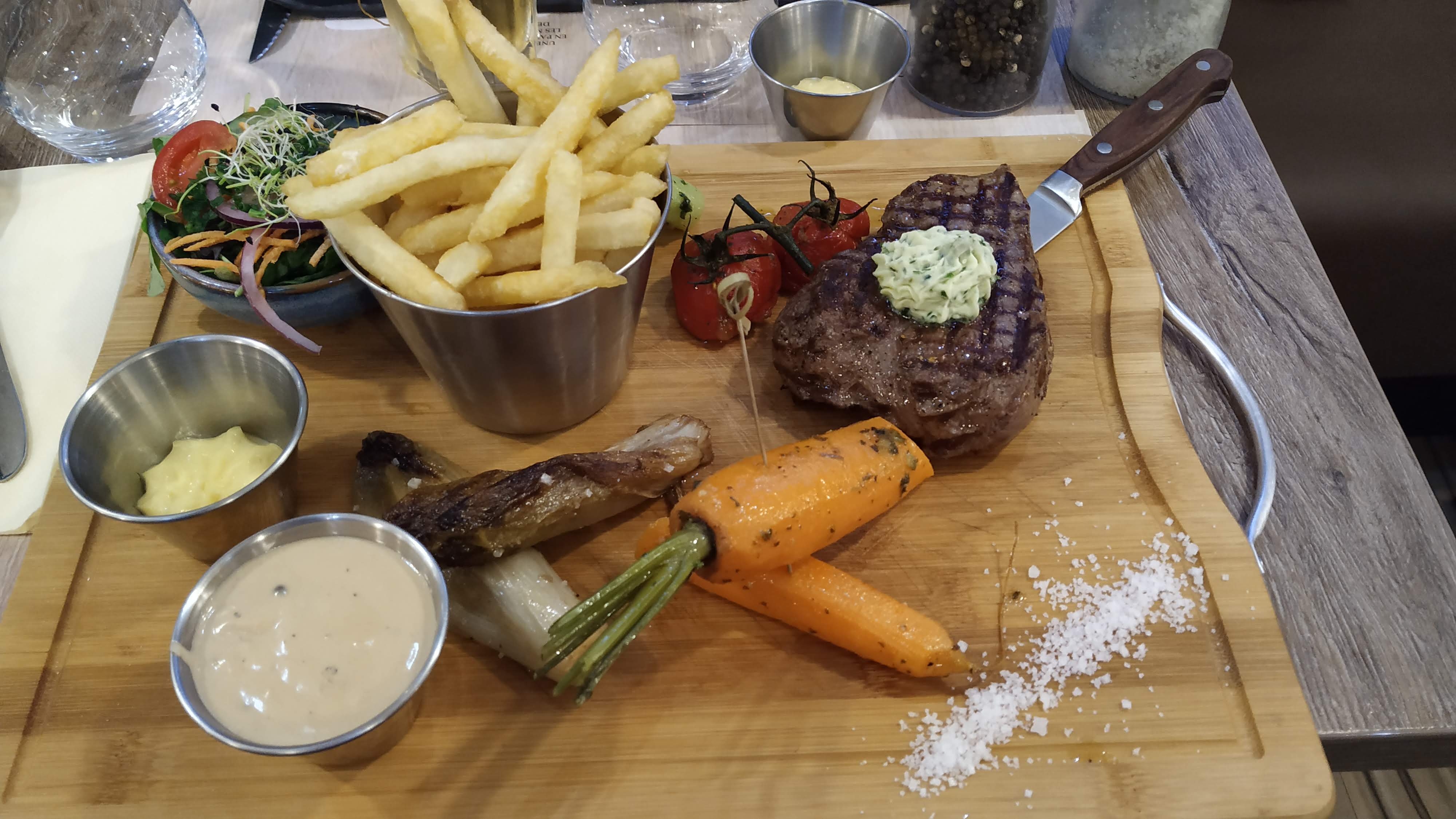 Très bonne adresse Pour commencer une planche à l'apero de très bonne qualité et très copieuses comme sera votre assiette par la suite Des frites au top en accompagnement Une assiette de très haute qualité Un service sourire Encore merci pour cette soirée