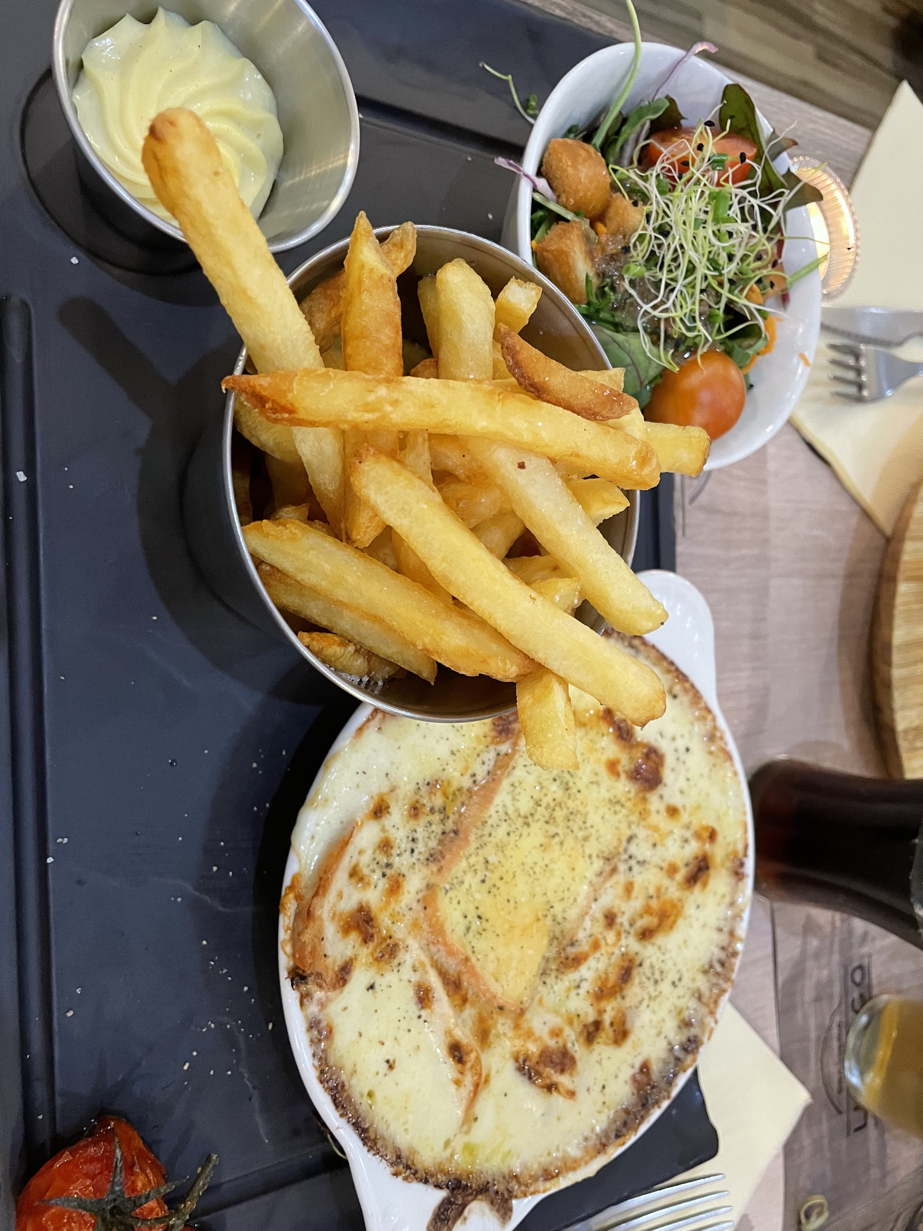 Personnel très accueillant. Première fois que nous mangions du Welsh au maroilles c'était délicieux , même les accompagnements étaient très bons ! Merci :)