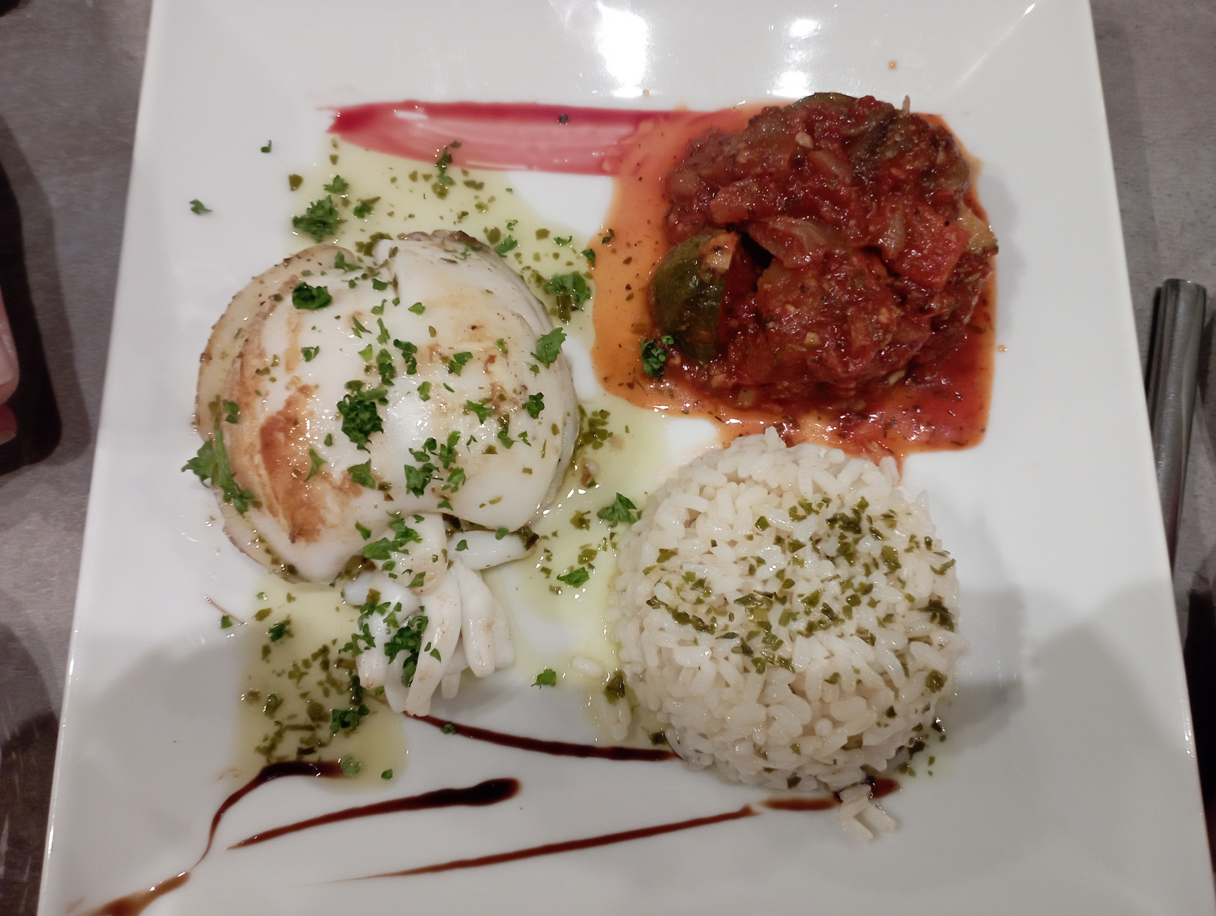 La belle surprise de la soirée en amoureux : Gambas à la plancha avec riz Camarguais et ratatouille. Et coté dessert : citron meringué revisité et profiterolles fait maison (le dessert phare de la maison dixit le serveur : les choux sont fait par un patissier du coin : excellent !!) On est très loin des attrapes touristes du bord de mer ! Venez sans hésiter !