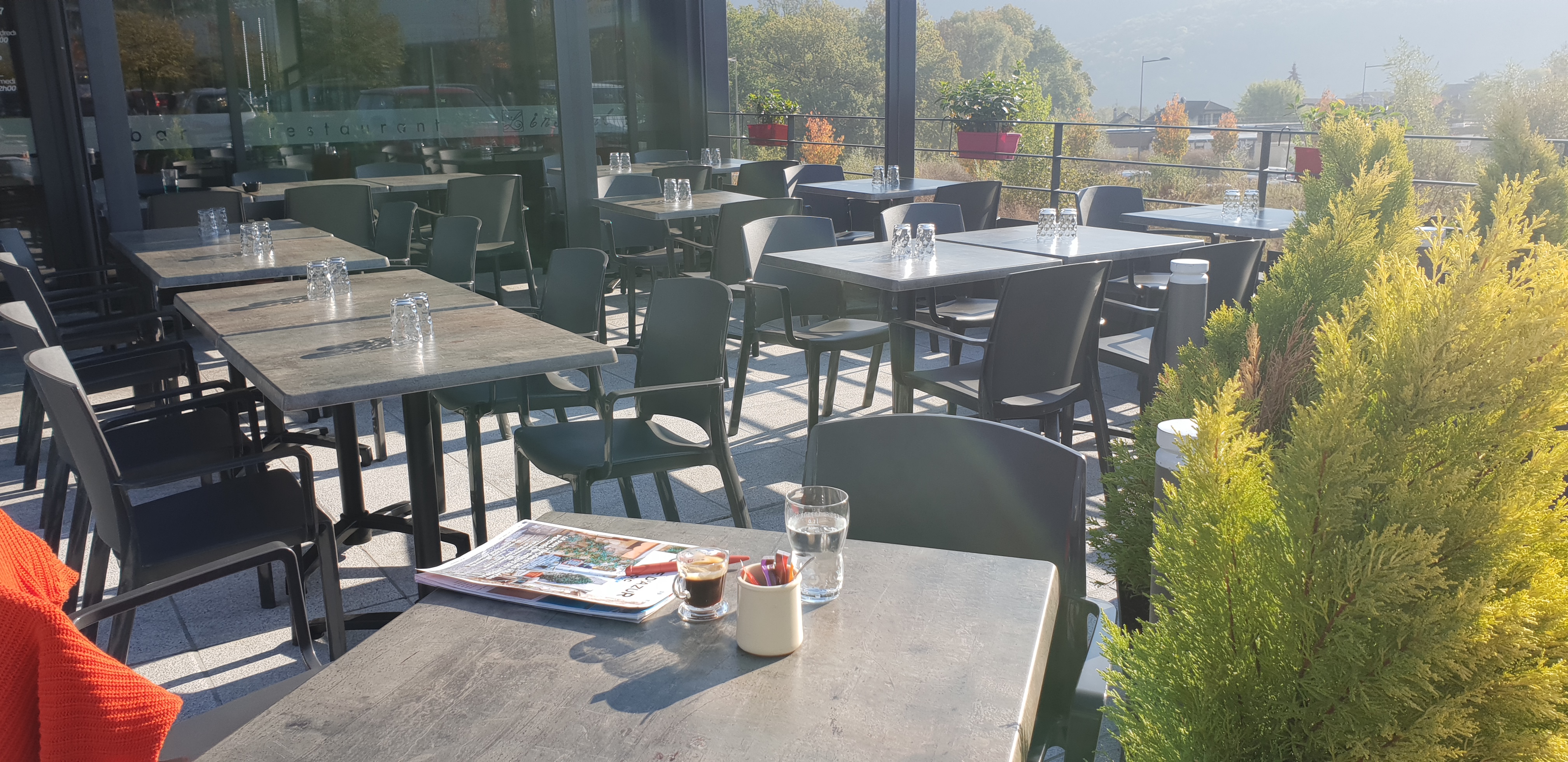 Bar restaurant ouvert 7j/7, avec grande terrasse ensoleillée toute la journée. Ce qui est rare. Parking gratuit. Le café ouvre à 10h. Café à 1€. Personnel chaleureux. Karaoké certains vendredi