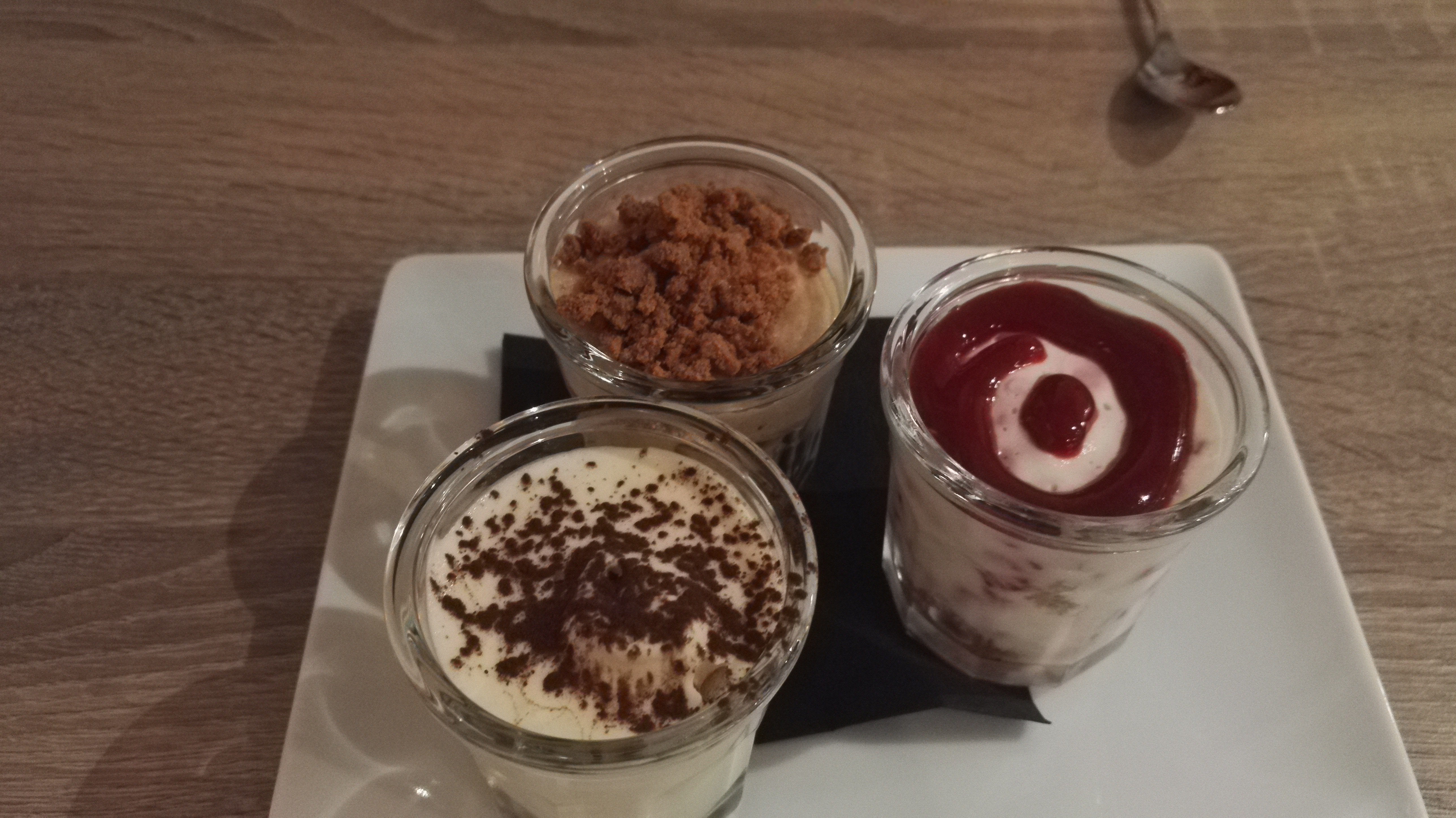 Très bon, servi rapidement, personnel au top et très souriant rien à dire ! Délicieux trio de tiramisu en dessert