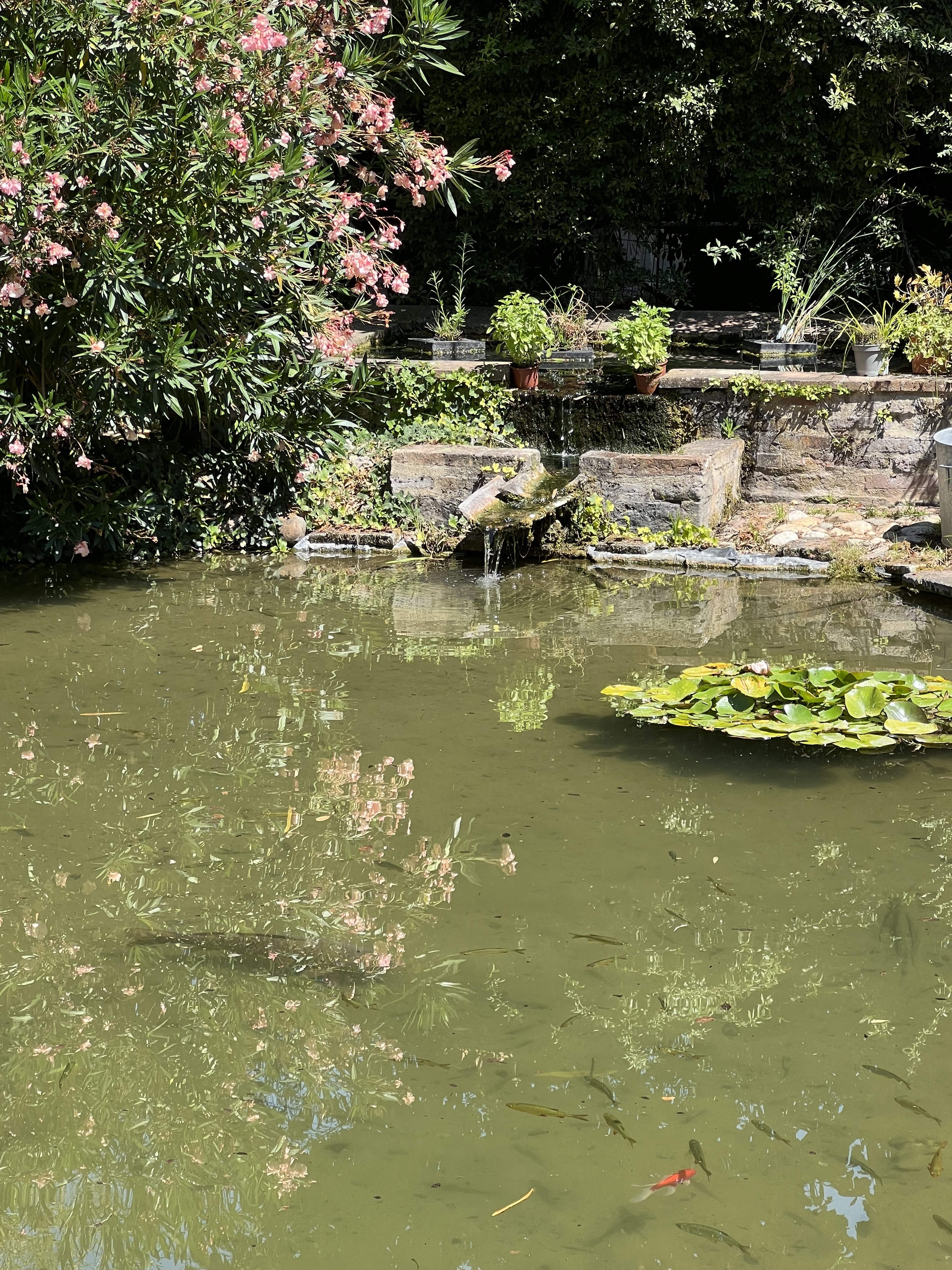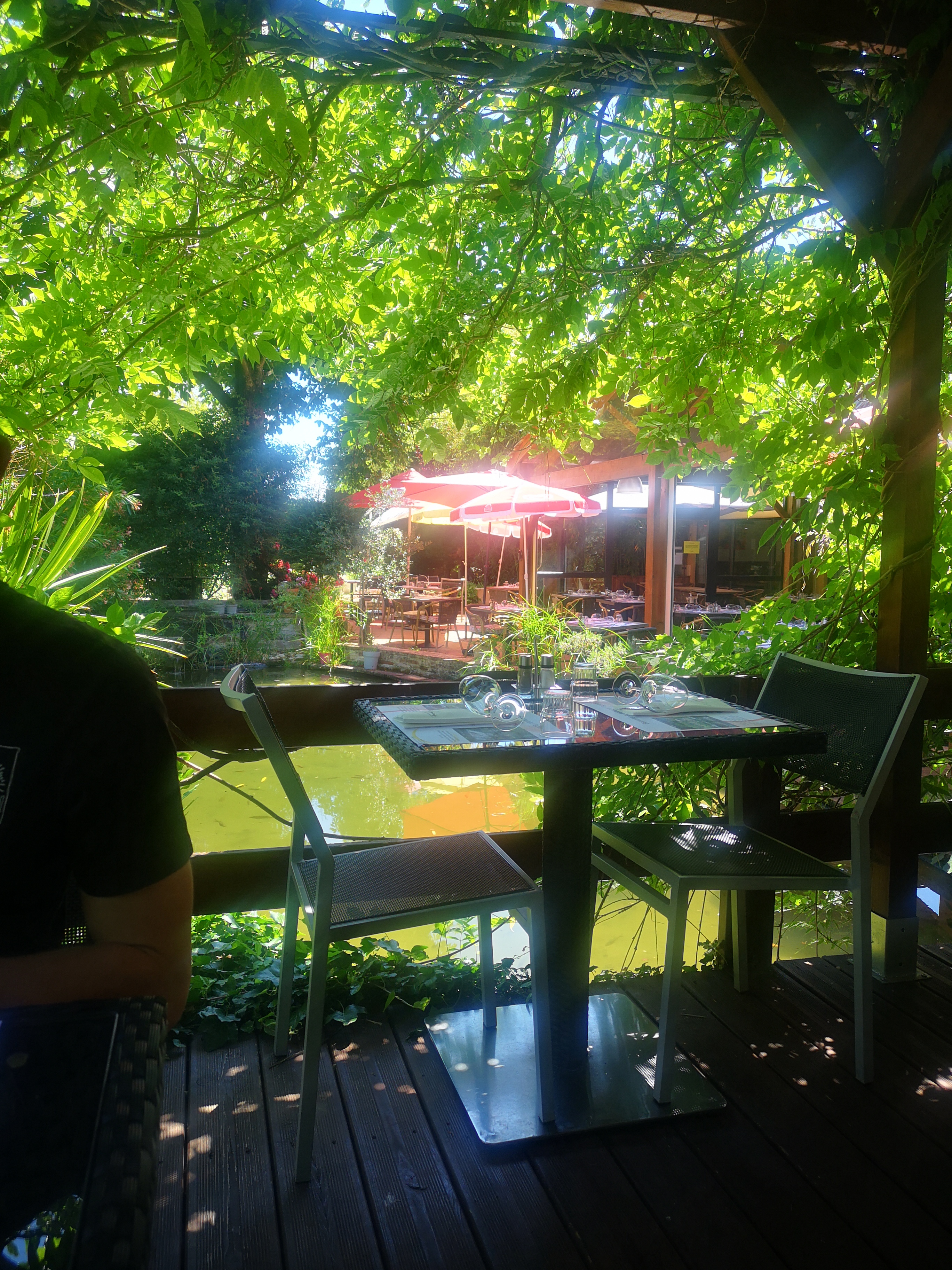 Nous étions là pour le 14 juillet. Bon déjeuner avec un excellent café gourmand. Les poissons géants et les grenouilles bruyantes dans l'étang occupaient tous les enfants. Repas très relaxant. Nous y retournons alors que nous sommes à Gaillac.