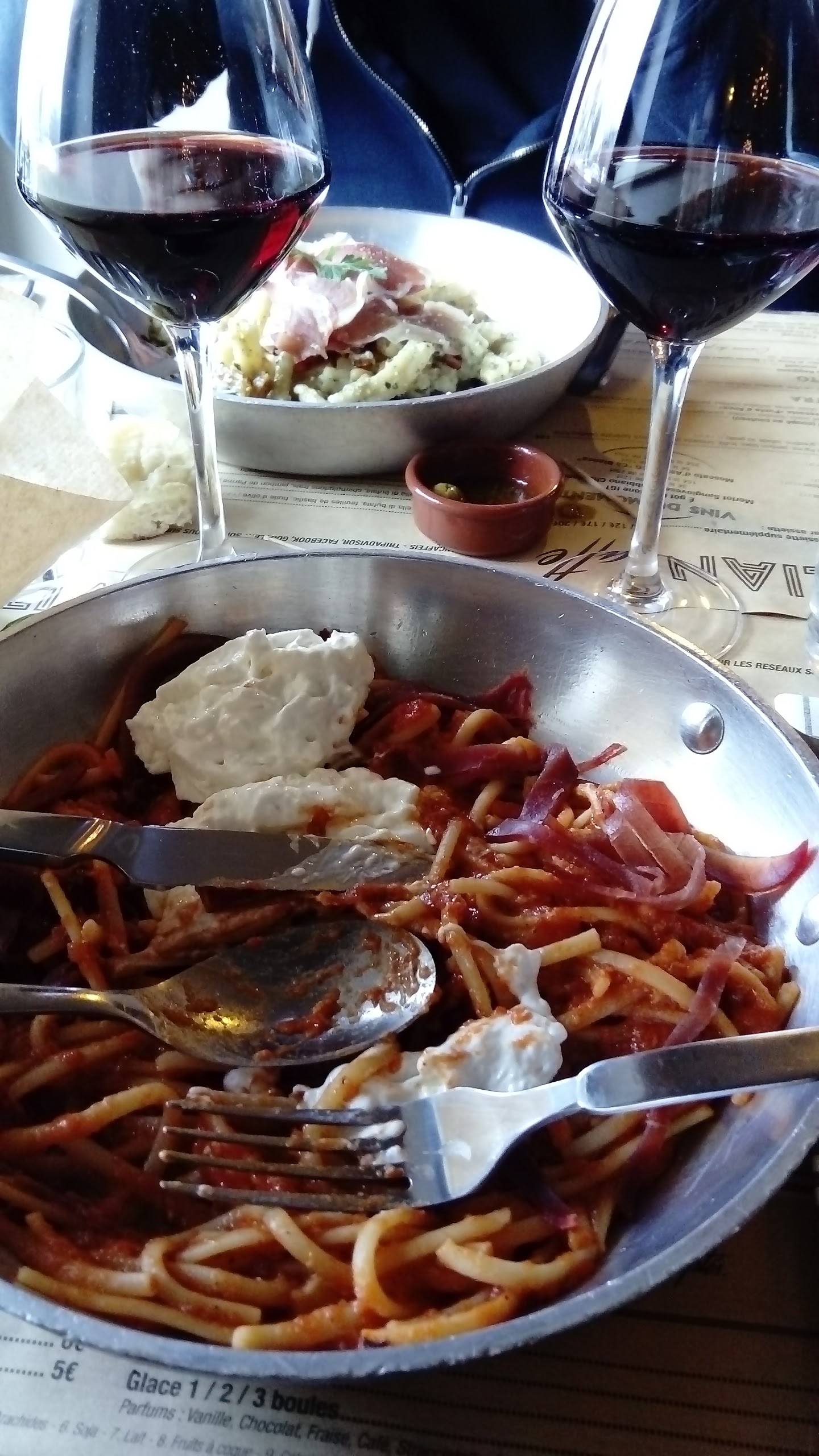 Pâtes excellentes, verre de vin qui ne dépasse pas la dose prescrite d'où le fait que la note est un peu élevée : plat de pâtes +1 verre de vin : 20€. Mais très bon.