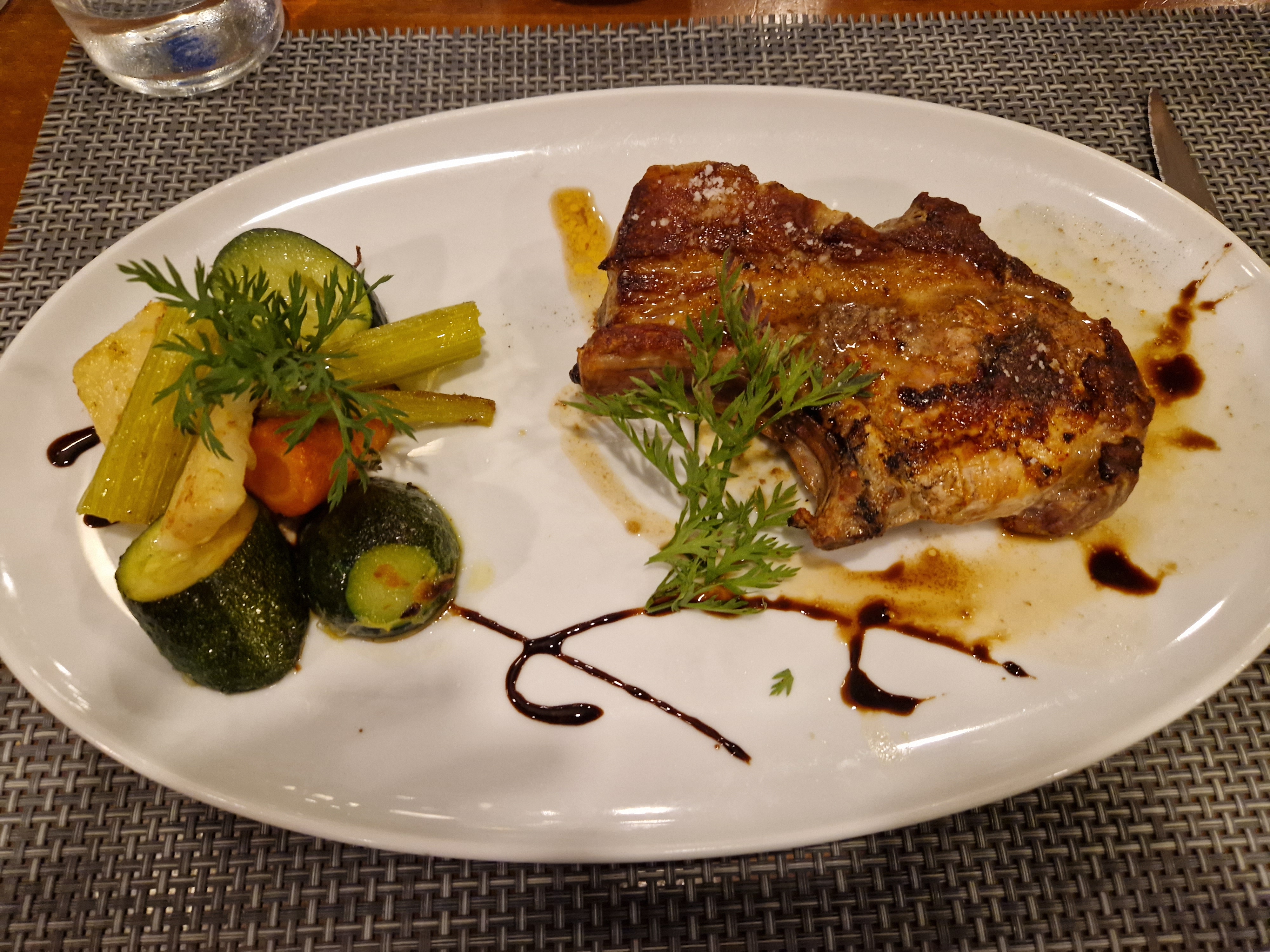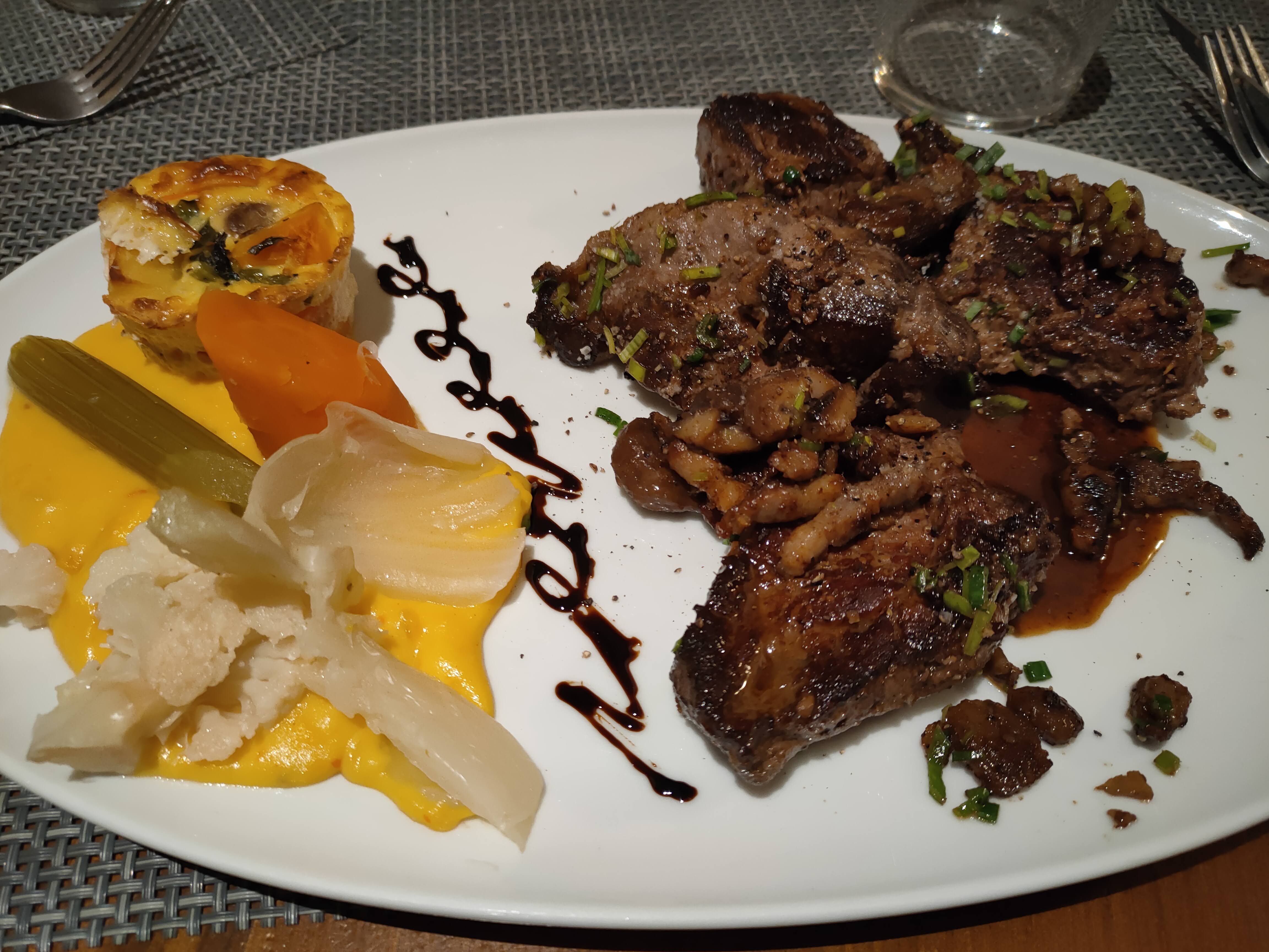 Côté de porc très bonne mais mon dessert était un peu fade (entremet aux fruits). Très bien dans l'ensemble.