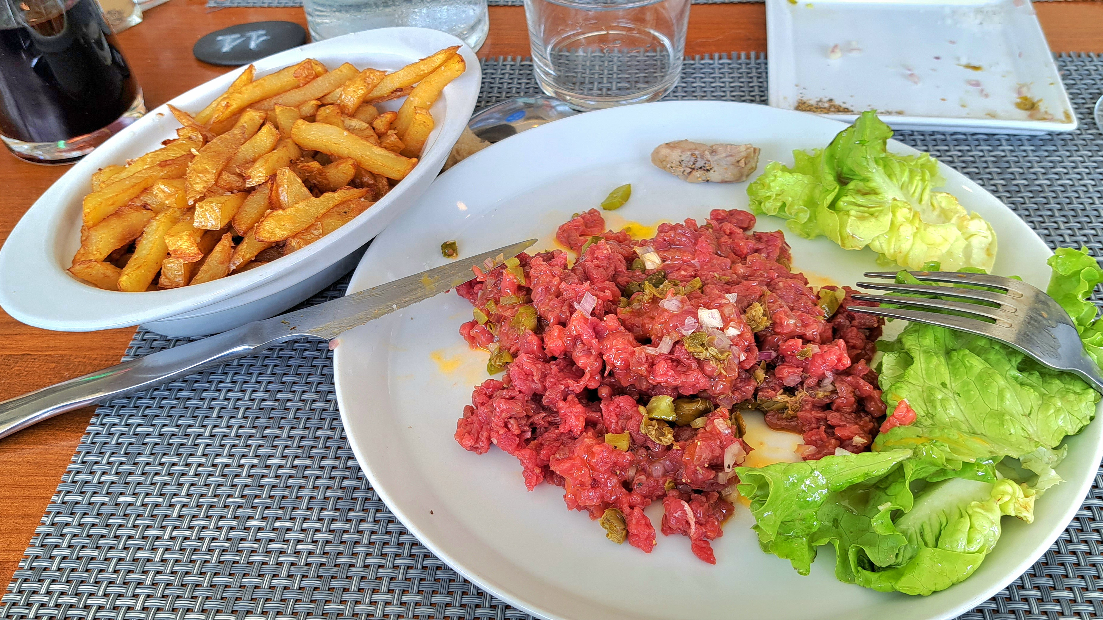Déplorable !!! Tartare de bœuf noir, frites cramées, légumes pas frais et sans goût. Une catastrophe !