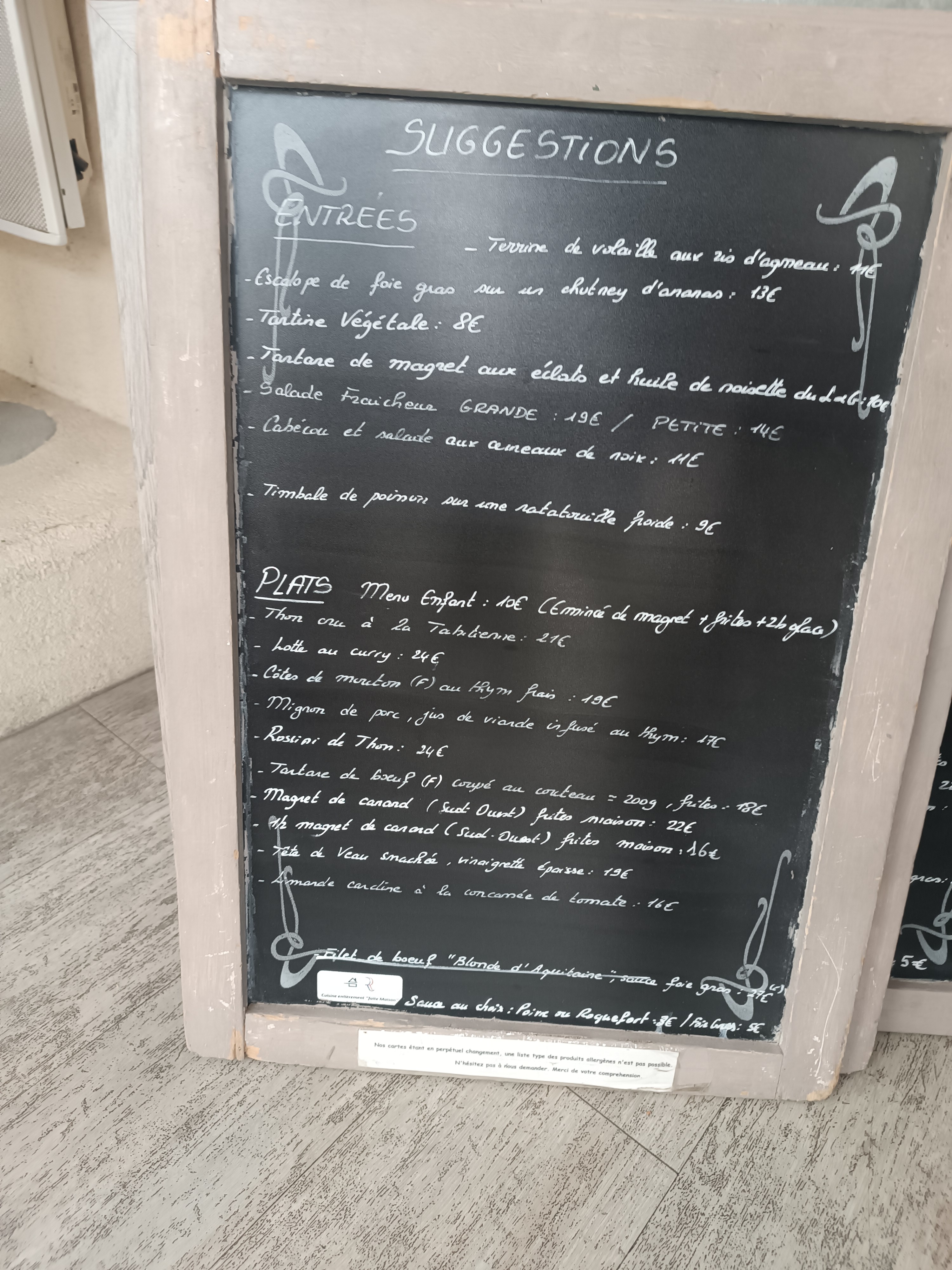 1ere fois que l'on vient.jour de marché donc pas facile pour trouver une place pour se garer.le cadre du restaurant est très sympathique,très classe,ainsi que la présentation des serveurs et serveuses .les plats étaient très bon et très joliment présentés.l'attente est correcte ,par contre qq petit problème de communication entre les serveurs ,j'ai attendu pour du pain et j'ai du redemandé à une autre qui me l'a emmené de suite ,pareil pour le fromage ,le serveur nous as demandé ce qu'on voulait comme dessert alors qu'on venait juste de le finir et de nous débarrasser 😳j'ai voulu un verre de vin ,la serveuse me répond ,c pas moi ,c l'autre serveur qui s'en occupe ,obligé de redemander ,elle avait pas fait le lien.attitude limite désagréable de certain serveurs et serveuses .sinon prix correct .photos: magret frites,pain perdu,langue de boeuf sauce câpres,assiette de fromage