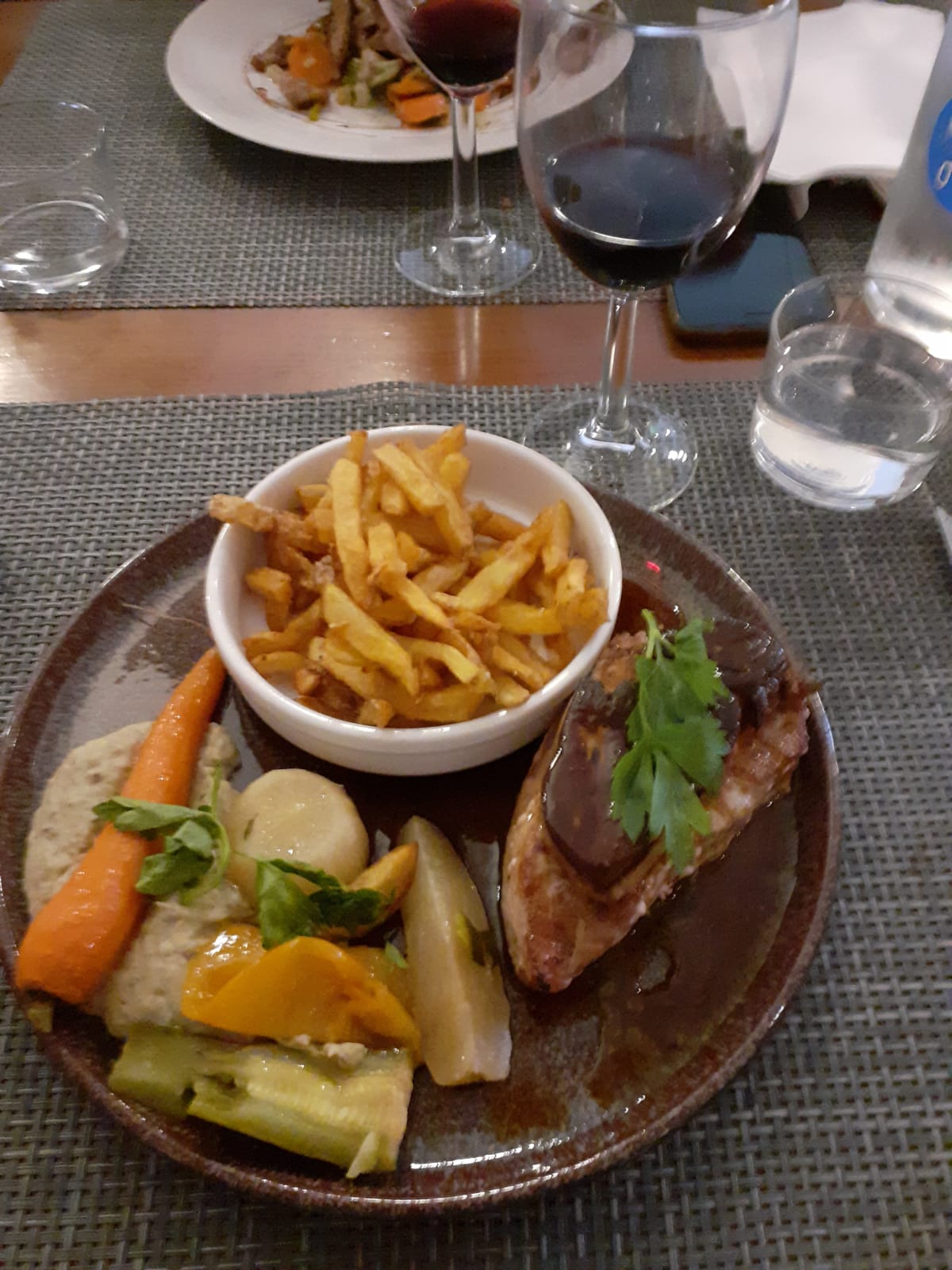 Attention si vous prenez un apéritif vous n'avez pas le temps de le boire que l'entrée arrive. J'avais encore mon assiette de l'entrée que le plat principal est servi sans même nous demander si nous voulions du vin... Menu pour un groupe côtelette de porc sèche pas un bon de sauce et légumes tièdes Service express à 21h30 restaurant vide . .....pour un samedi soir !!