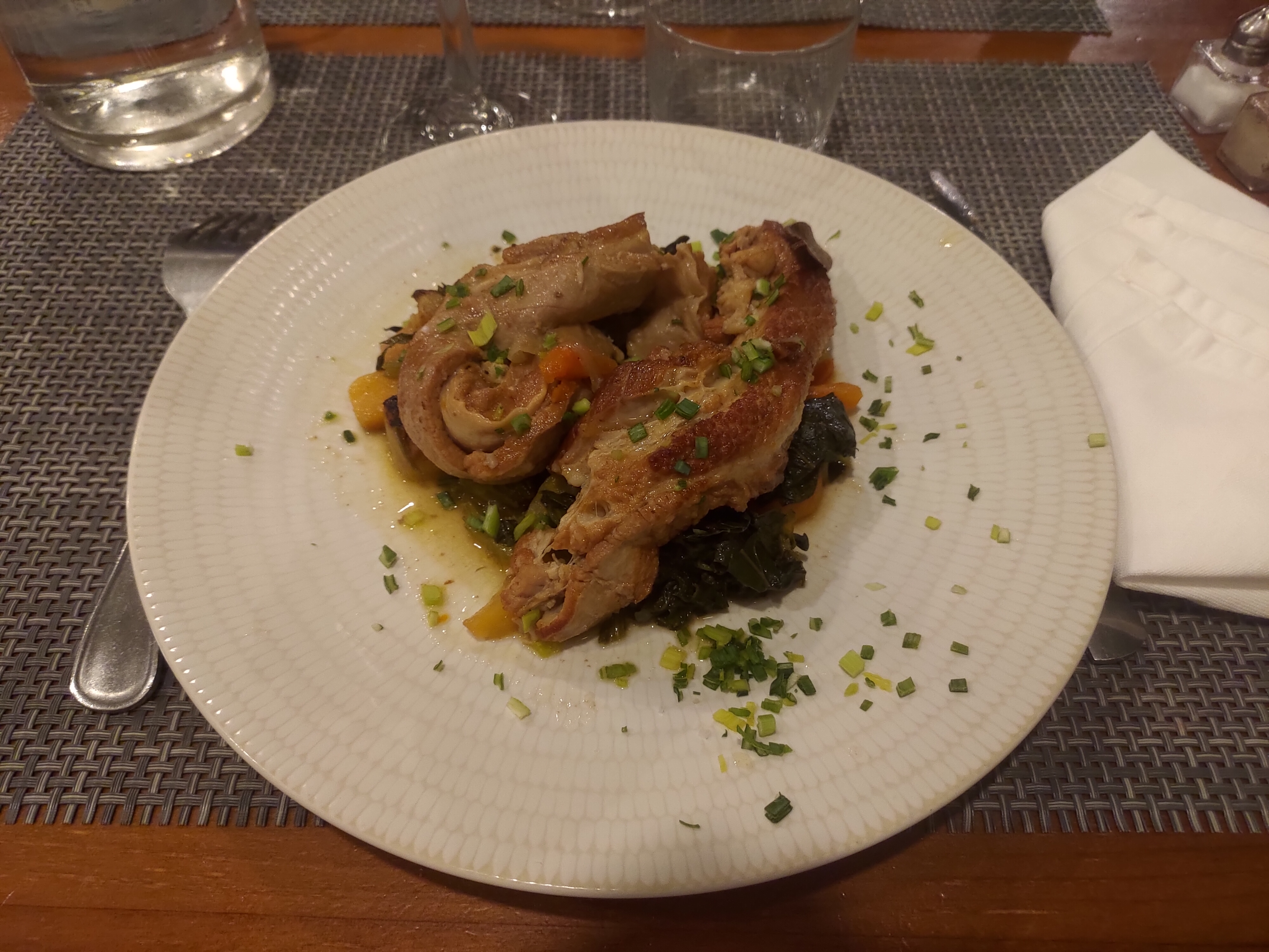 Très décevant, verre à eau pour le vin rouge, serviette tissu déchirée , petit morceau de truite annoncé filet, et l entrée d asperges aux lardons , très gras, c était plutôt lardons aux asperge, serviettes blanches efilochées. Très décevant par le personnel de service.