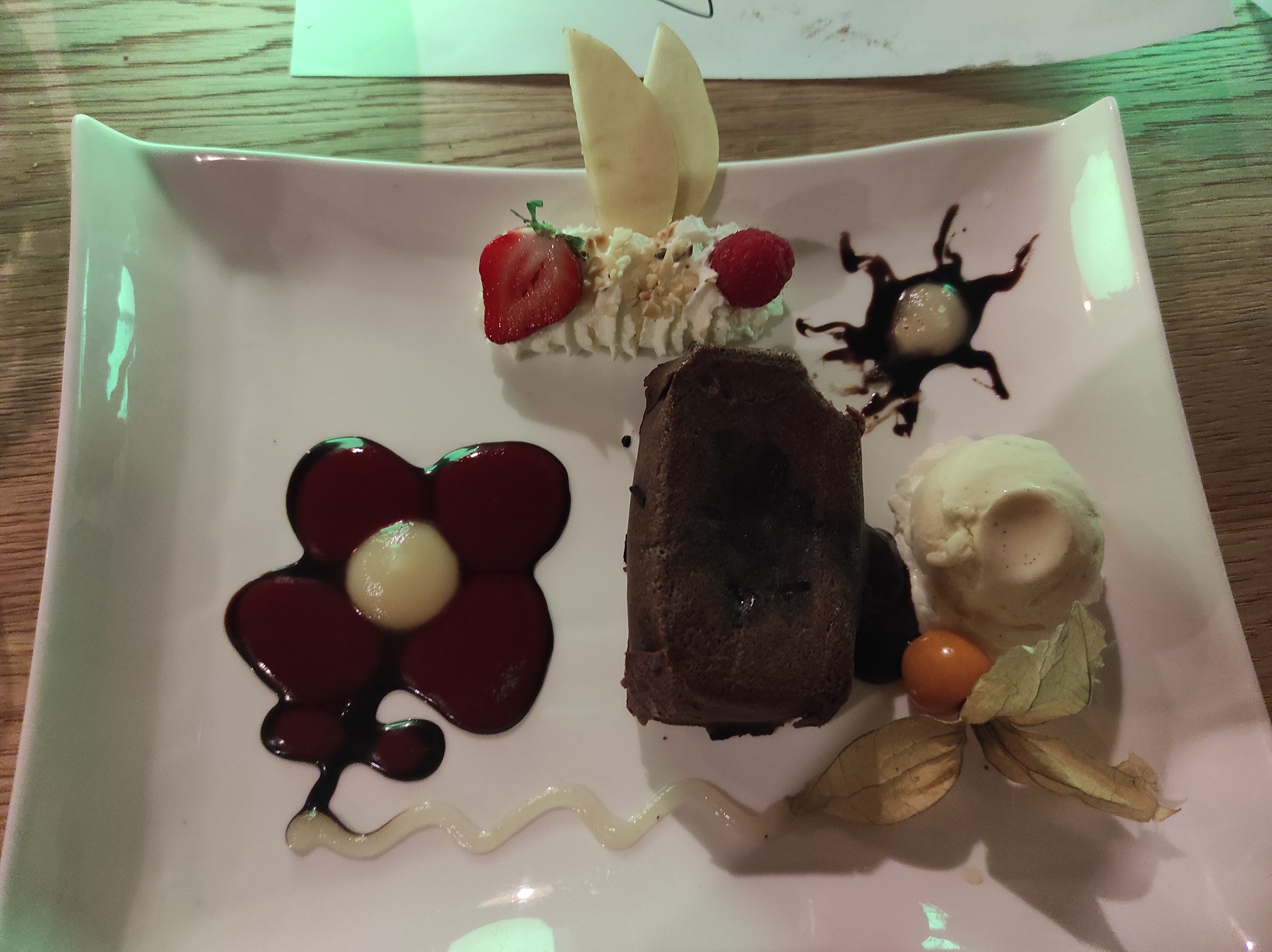 Le désert était exceptionnel ( goût et présentation de l'assiette). Moelleux au chocolat. Gustativement et artistiquement parfait. Le plat lui n'était pas au même niveau.