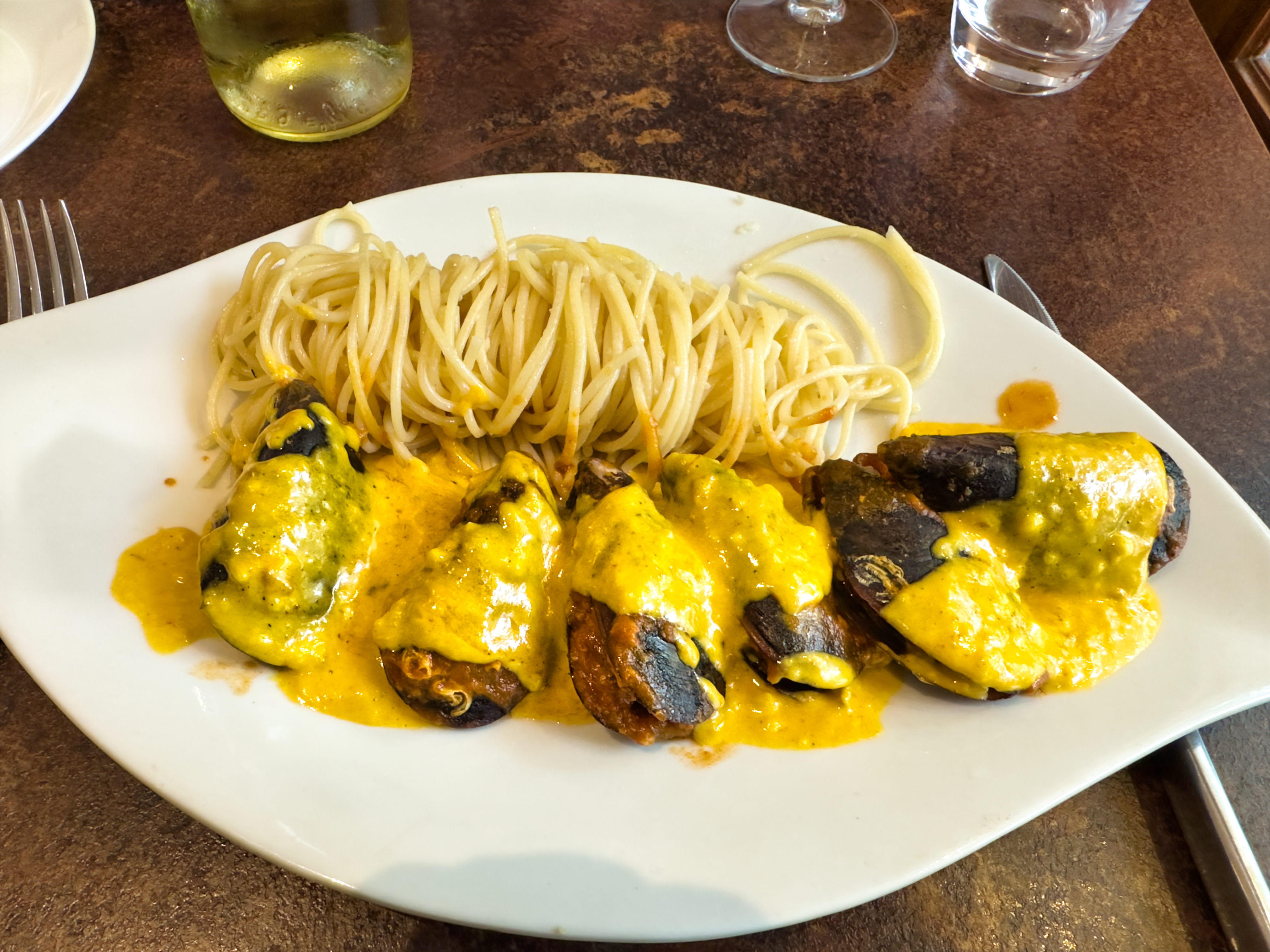 Moules farcies à la Setoise et spaghettis à l'ail excellent !!! Tres agréable déjeuner sous les premiers rayons de soleil du mois de mars dans l'ambiance vivante de la place du pouffre. Des bons produits, je recommande !