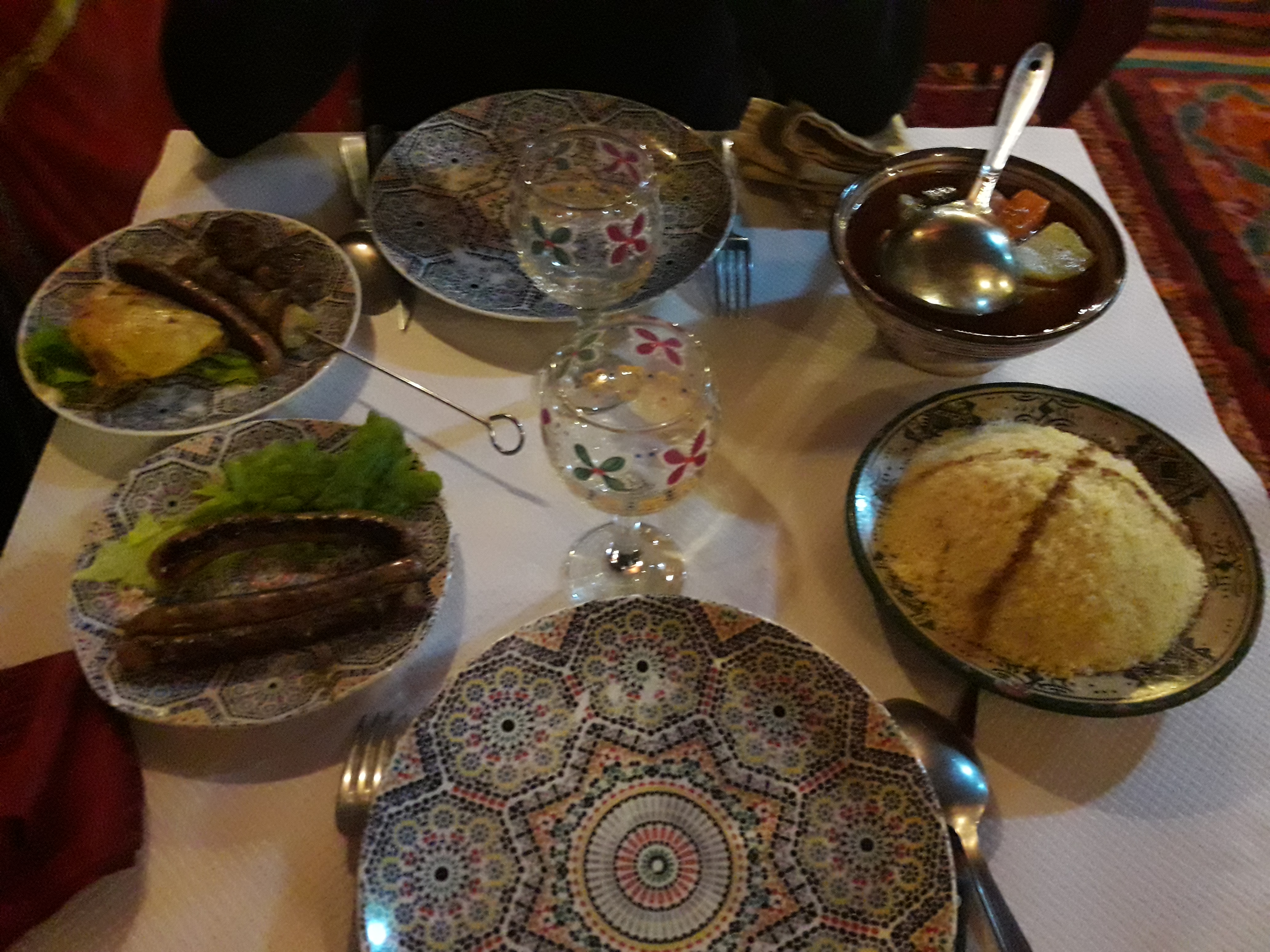 Un restaurant coquet près de la gare et du cinéma. Les odeurs étaient tellement délicieuses que j’en ai oublié de faire la photo. Couscous de souris d’agneau épicée et savoureuse, avec des produits frais. Le meilleur couscous que j’aie jamais goûté. (Plus qu’à Marrakech en tous cas :-)