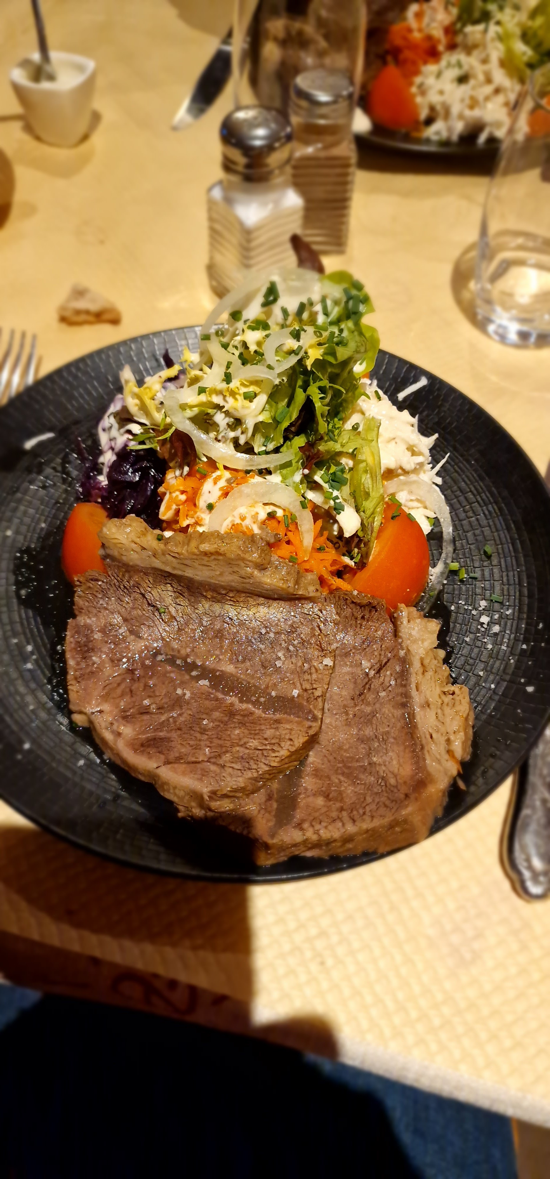 La prise de commande est rapide, les boissons arrivent sans trop d’attente. Le plat choisi était un bœuf gros sel avec crudités et patates. La cuisson de la viande était parfaite, elle était bien juteuse et bien tendre. Le pain qui accompagnait le repas était excellent. Pour finir, un grand café à été commandé mais celui ci n’était pas très bon. Rien d’autre à dire.