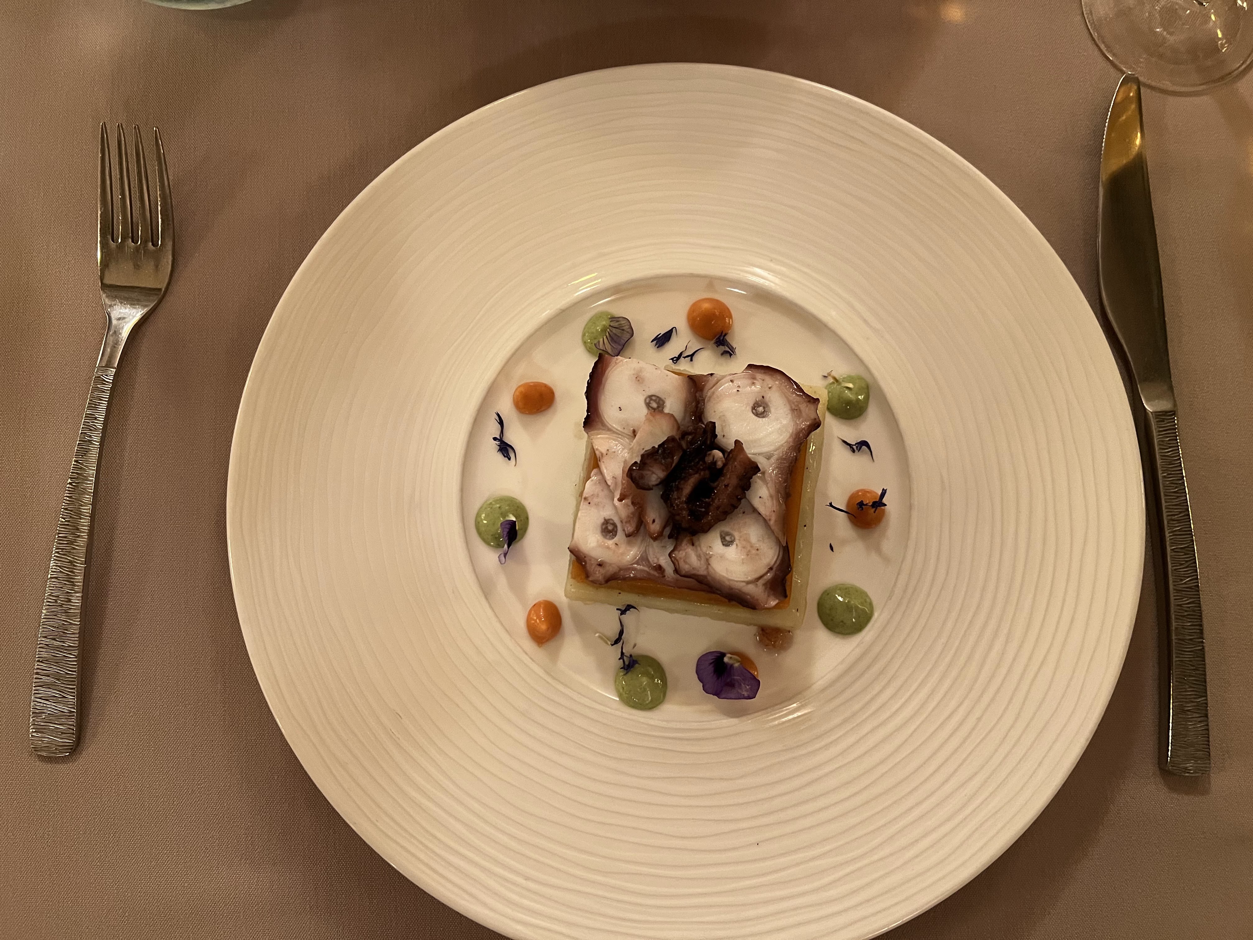 Ambiance raffinée, service impeccable. Il n'y a pas de service à la carte, mais seulement 2 options de menu. Le plus cher (calendrier) comporte 5 pièces et le moins cher (signature) comporte 3 pièces (entrée, plat et dessert ou fromage). Au menu signature, vous trouverez 2 entrées, 2 plats principaux et 2 desserts, et vous pouvez opter pour du fromage au lieu du dessert. Le choix du menu le plus cher doit être fait pour l’ensemble de la table. Nous avons mangé le menu signature et la nourriture ne m'a certainement pas plu, mais je pense que c'est essentiellement dû au fait que je ne suis pas habitué aux plats raffinés, à la cuisine française de haut niveau. Ils servent du pain, très bon d'ailleurs. Ils servent également une entrée en appétit avec des olives noires, de très bons toasts et autre chose de très bon aussi.