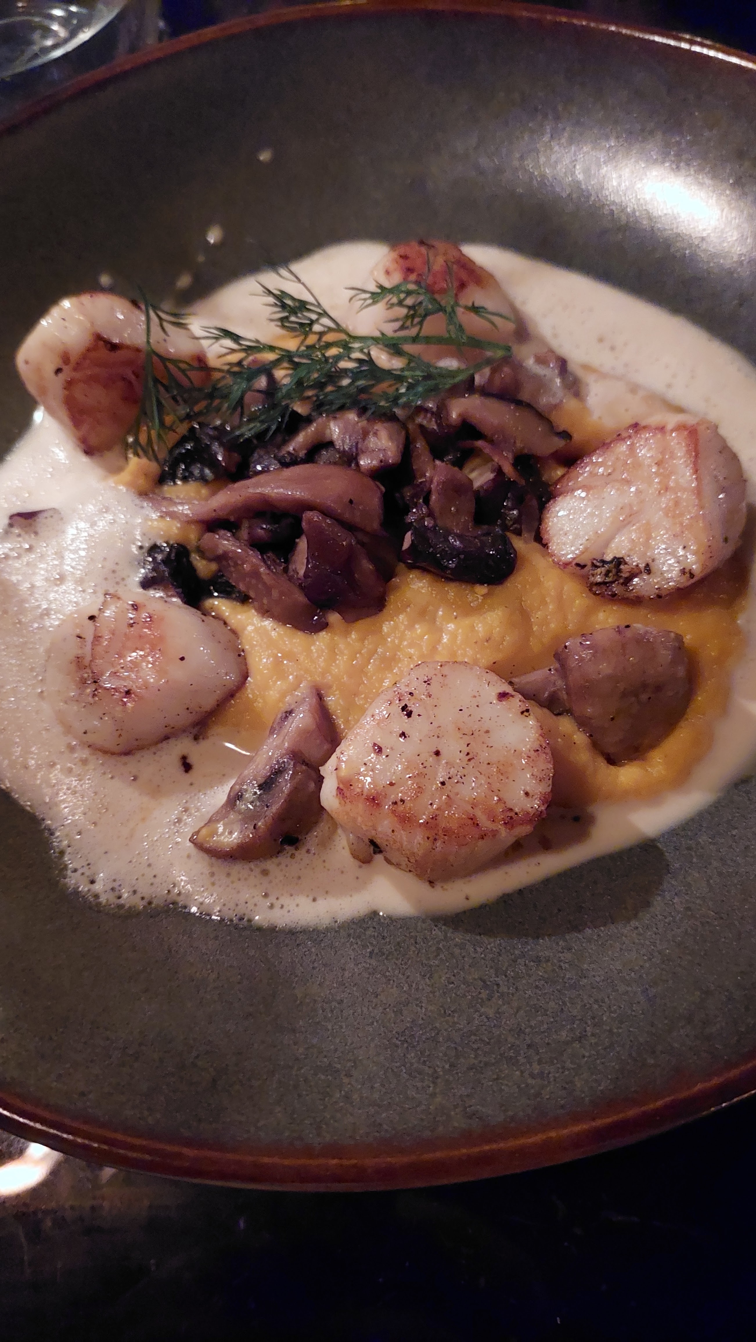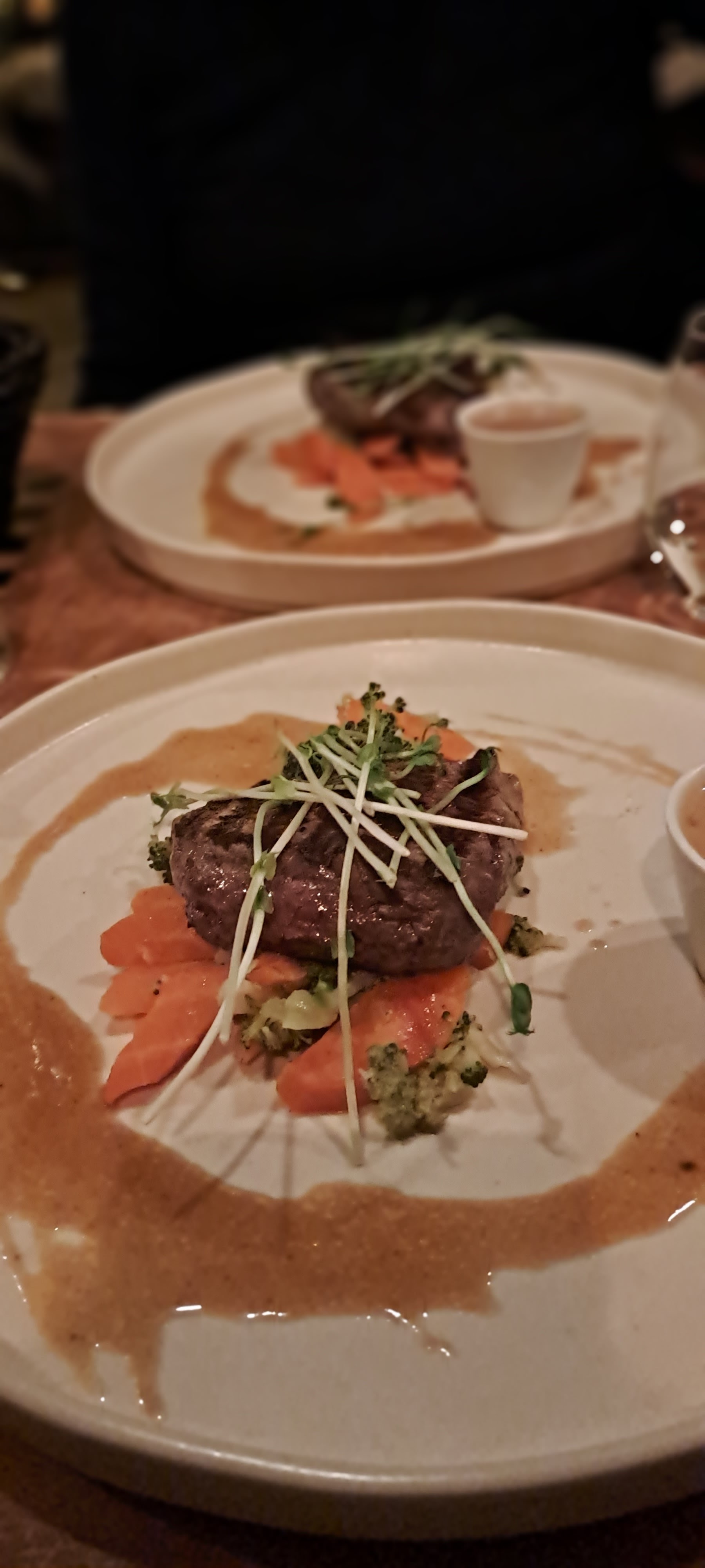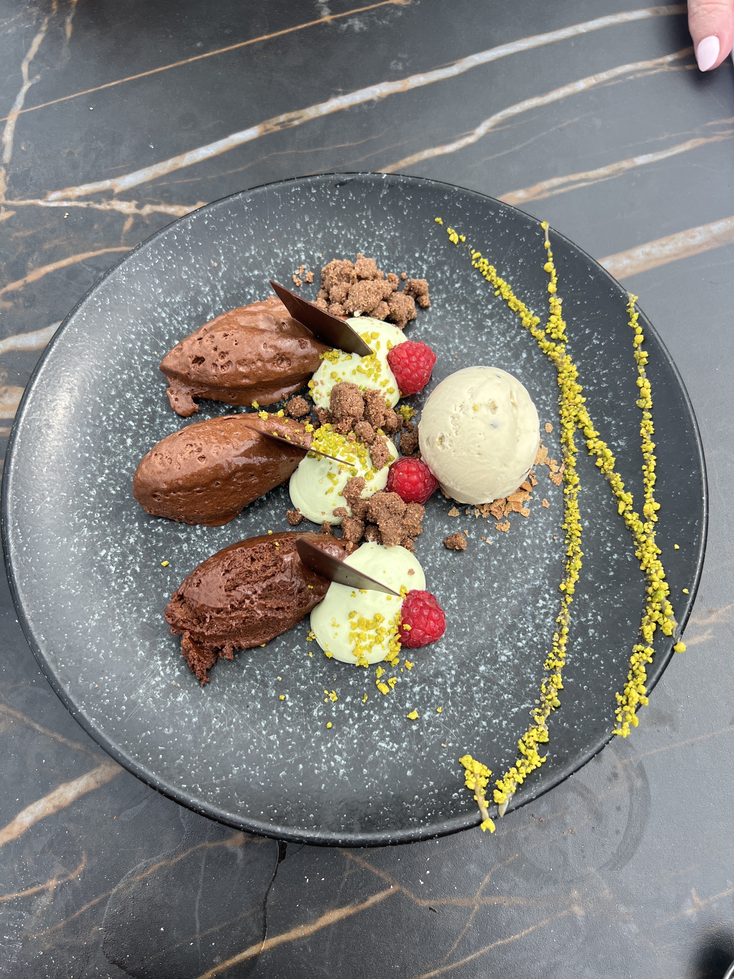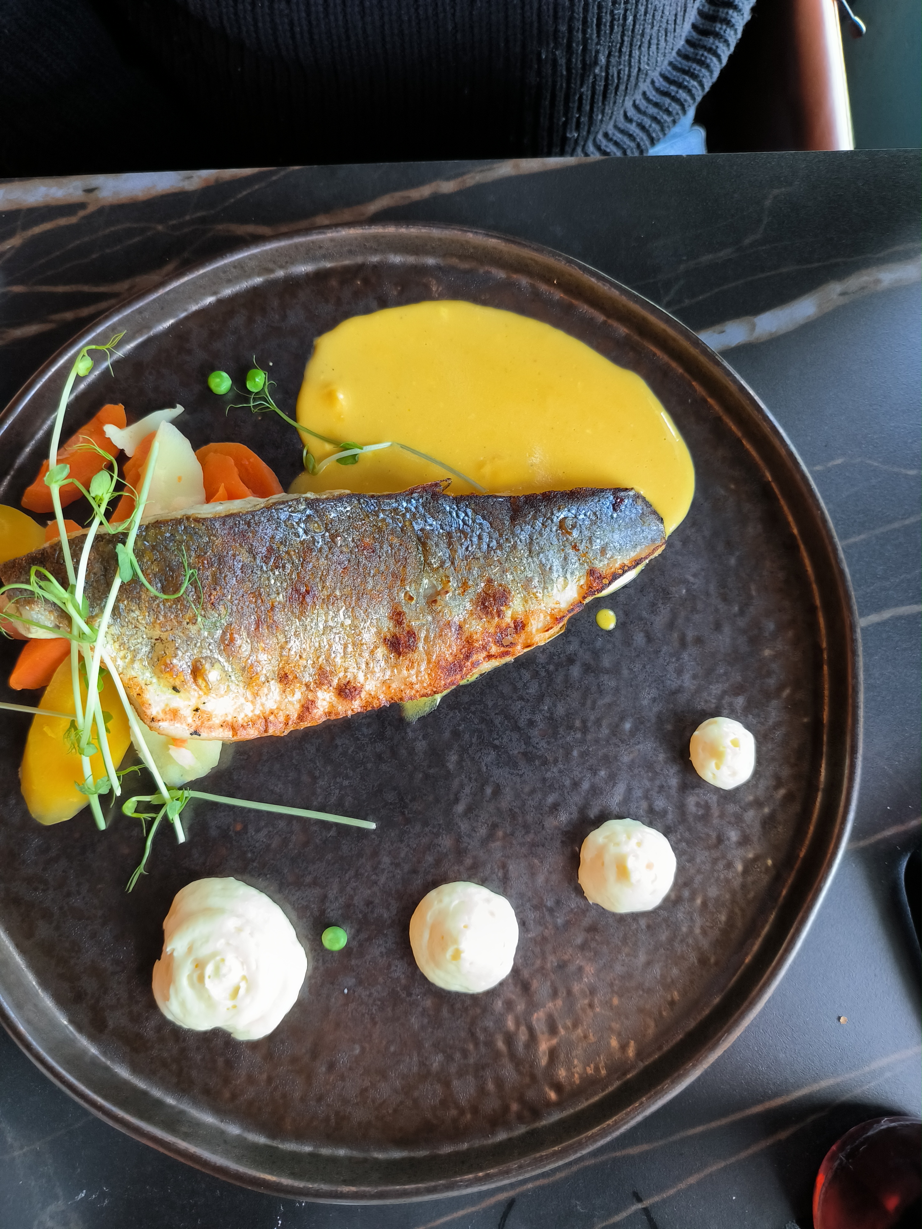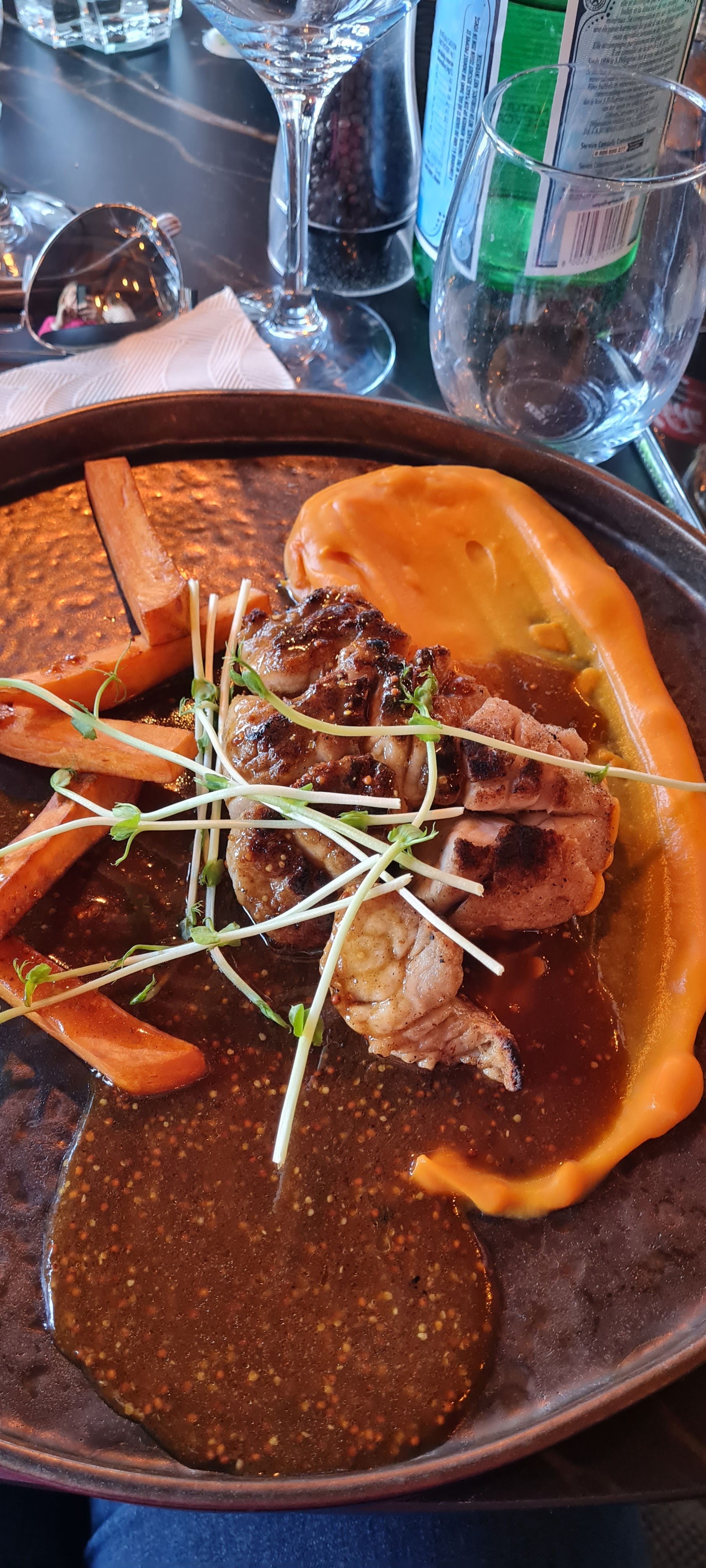 Un repas très agréable, belles assiettes Très joli cadre Seul bémol le service,par une dame,pas très chaleureux ni prévenant Ça nous empêchera pas de revenir