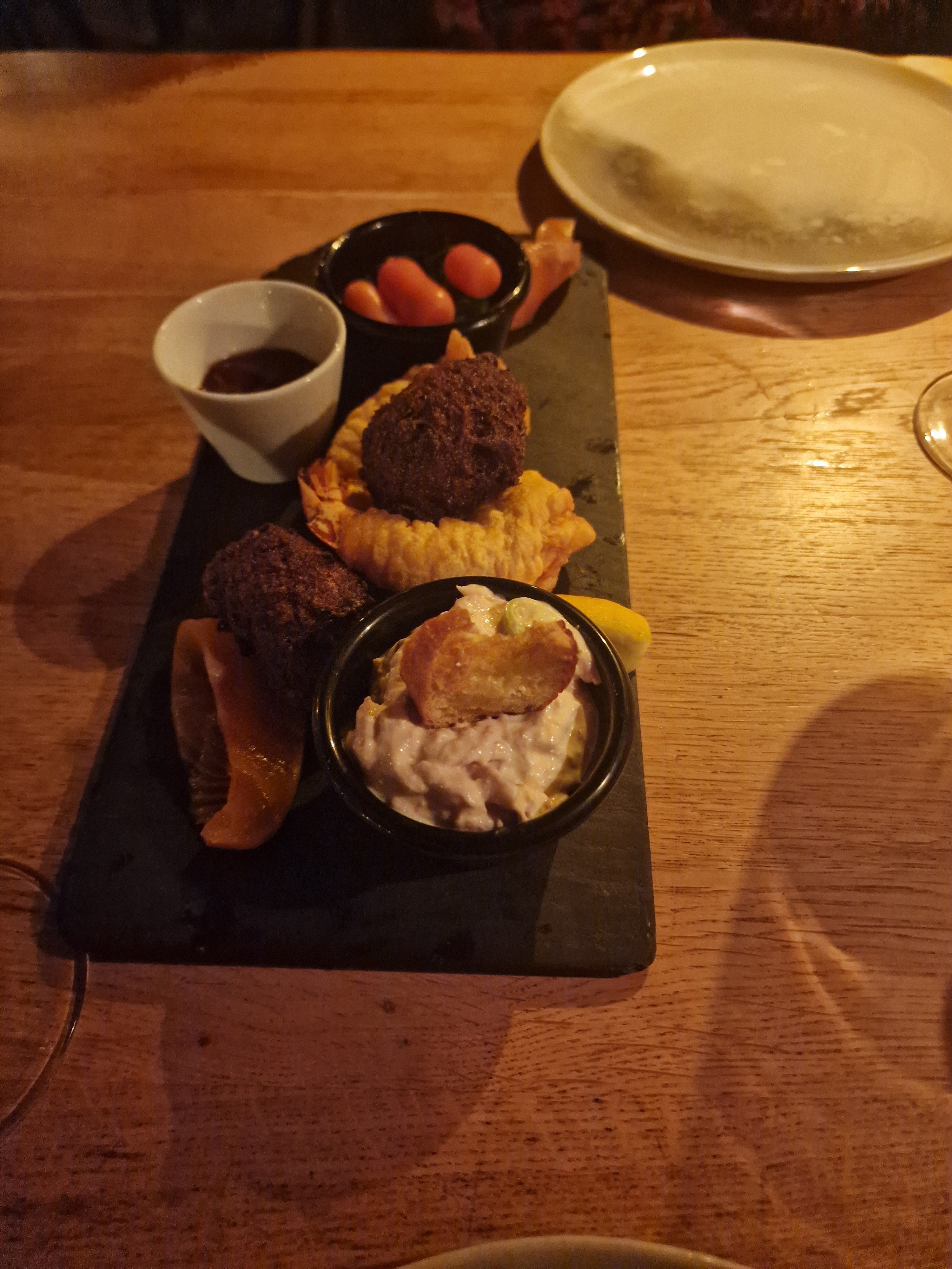 Nous avons pris que le plat principal car nous avons eu un week-end très gourmand et donc à notre grand regret nous sommes restés au plat principal mais...mais à refaire absolument car très bon produits excellent...quand au décor et l'ambiance wouaaaa...discret avec un petit fond de musique..très chaleureux..on adorere..à faire absolument..vraiment..endroit magique avec toutes ses bougies déco de Noël avec sa cheminée qui réchauffe les cœur et l ambiance romantique..très belle accueil également. Je vous laisse maintenant seul juge...