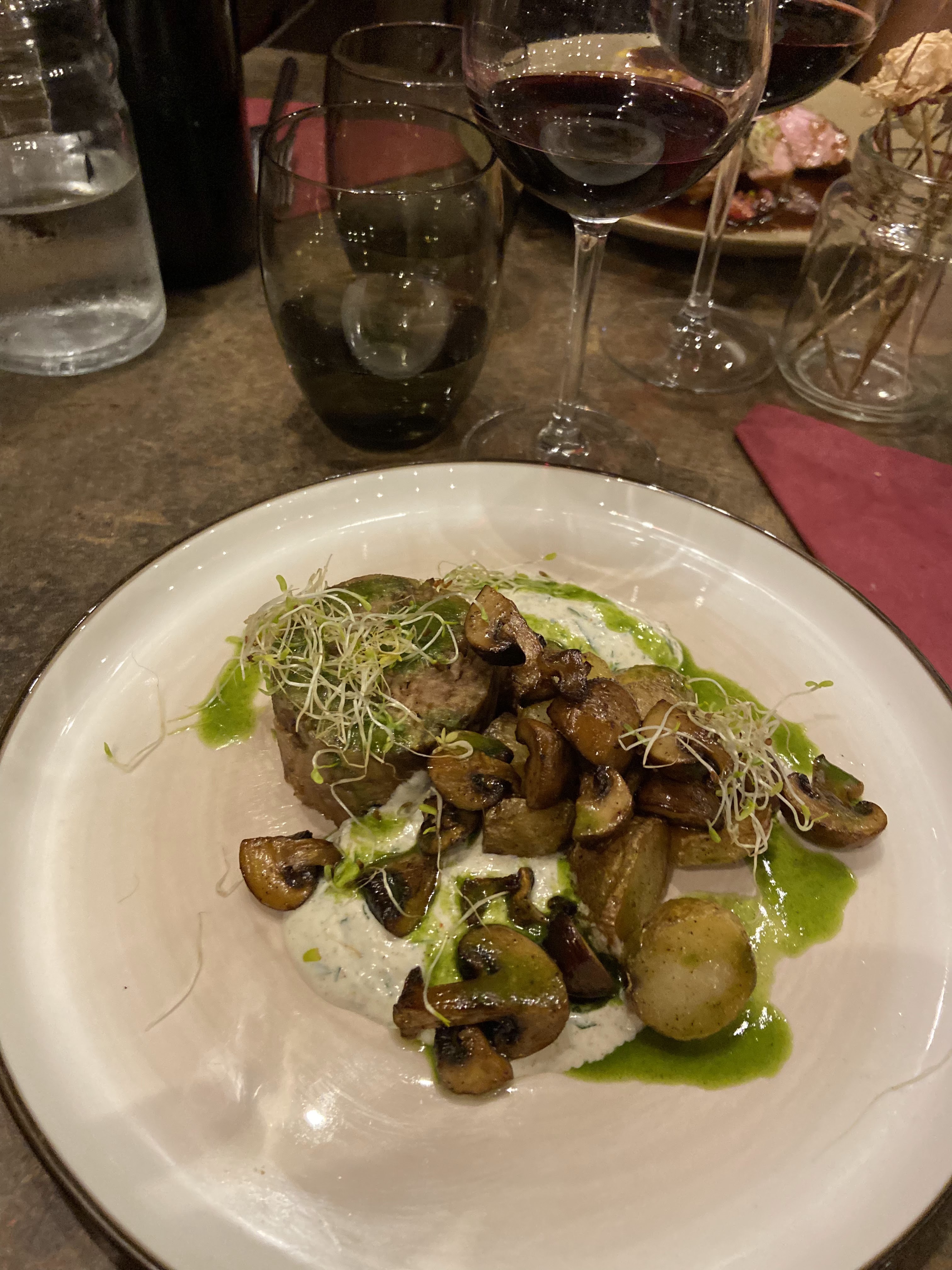 Le plat était très bon ( Ah la sauce aux champignons!), le dessert aux fruits de la passion excellent, et on a eu le privilège d'un morceau de piano joué par le cuisinier en fin de soirée , belle énergie que ce lieu 🙂