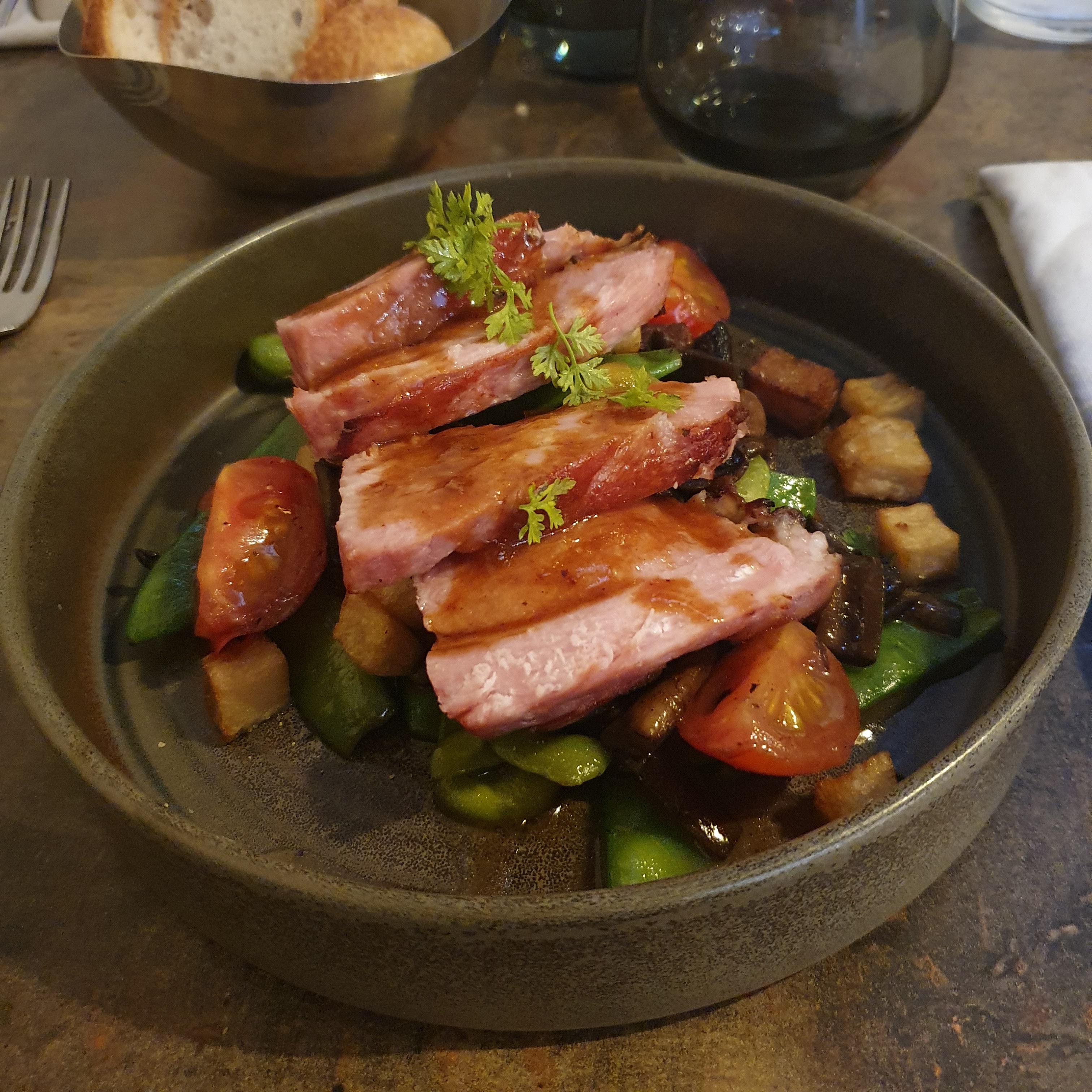 Des produits frais et de qualité très bien travaillés : burrata noire de Crimée roquette et jambon sec, un magnifique carré de porc grillé et tendre, et la qualité tient jusqu'au dessert !! Ajoutez à cela une très belle carte des vins pour l'accord mets et vins avec les conseils de connaisseur de Medhi (sommelier),et vous passez une très belle soirée gustative, dans une ambiance détendue