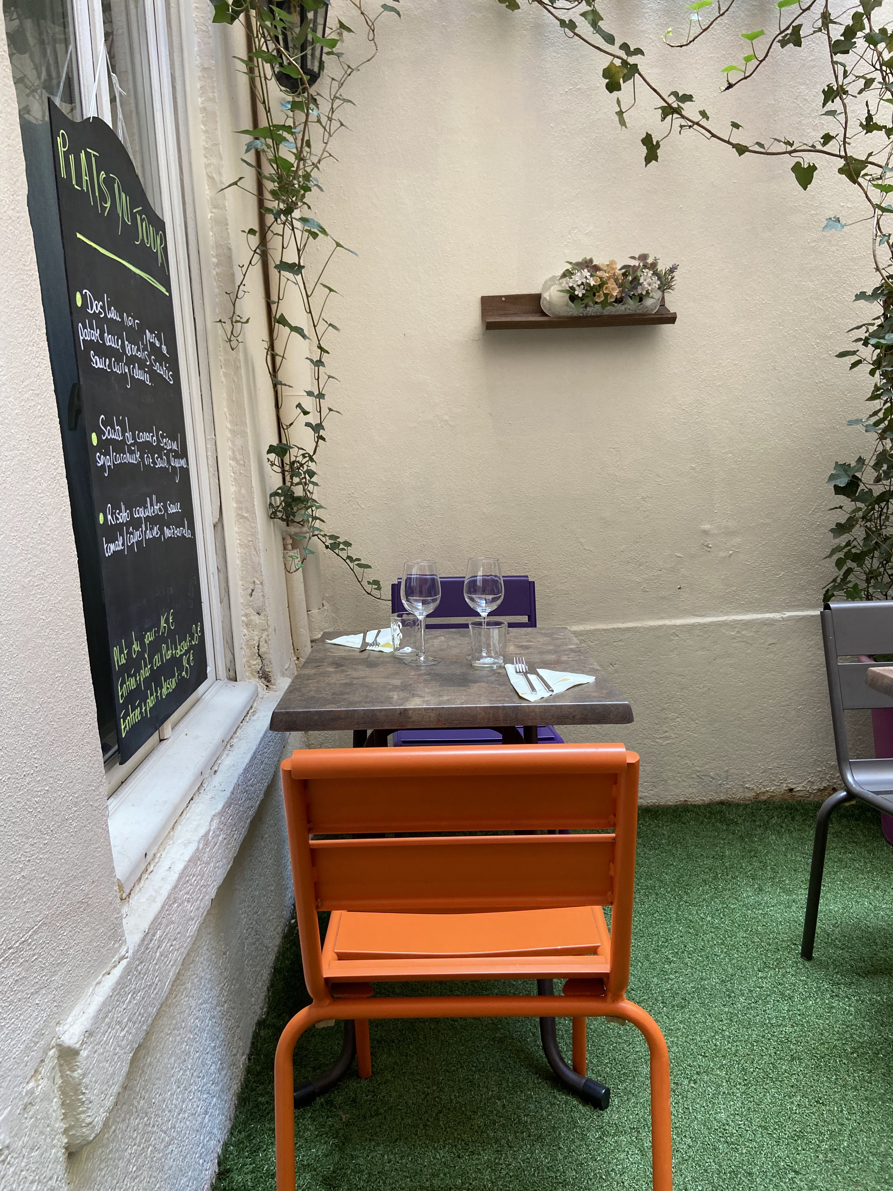 Très bonne expérience, à renouveler au plus vite ! Nous y avons diné en amoureux cet été, avec la chance de pouvoir profiter du charmant patio très bien décoré. Nous nous sommes régalés (même si mon conjoint a trouvé ses portions un peu trop petites pour son appétit). Tout était parfait du début à la fin : la grande qualité des plats, le cadre, les conseils des propriétaires -en particulier Monsieur, qui excelle dans son métier de sommelier- et leur grande gentillesse. Les petit plus : nous habitons juste au-dessus, dans l'immeuble. L'été, même les fenêtres ouvertes, nous ne sommes absolument pas gênés par les bruits de la cour, qui est très calme. Le restaurant est très bien décoré, et il dispose d'une petite terrasse sur la rue. Un cadre idéal pour un repas à deux, en amis ou un repas d'affaires.
