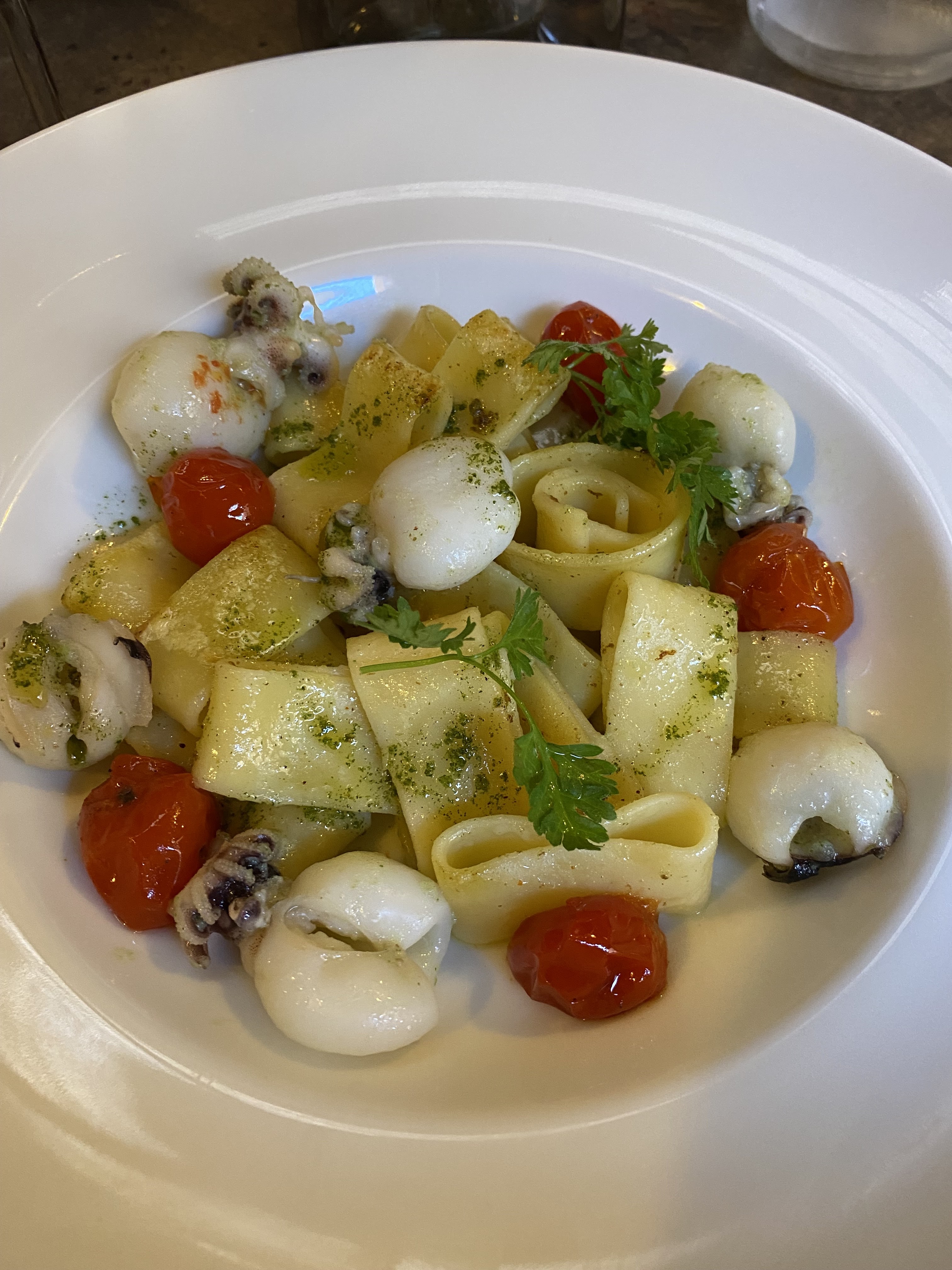 Un dîner en famille, repas bon malgré une petite erreur de plat vite rectifier. La porte ouverte n'est pas top avec le bruit des voitures qui passent. Une table ronde un peu trop basse et hop un verre de vin à 8€ renversé,la gentille serveuse à nettoyer mais dommage n'a pas remit un peu de vin dans le verre c'est dommage cela aurait été agréable pour nous .