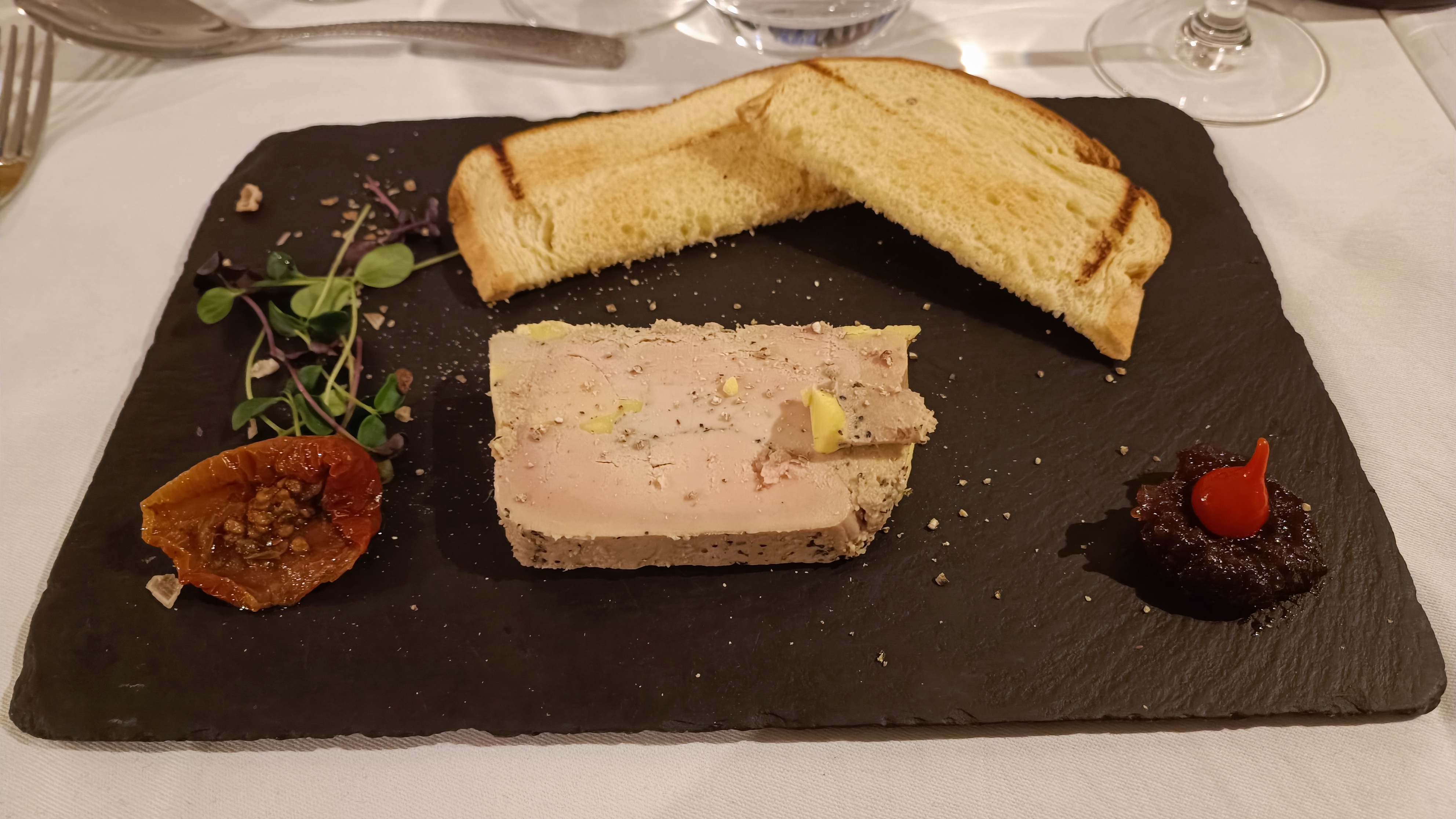 Foie gras mi-cuit ? un peu cru plutôt au centre, et pain de mie toasté, pourrait mieux faire pour le prix quand même! Restaurant bon mais vu le prix du menus à 47euros, je m'attendais à mieux en recherche de plats, décorations de l'assiette. Je n'ai fait aucune découverte. Encore un restaurant qui n'attend pas que l'on finisse notre apéritif pour apporter la suite. Et étant donné le monde, c'est vrai qu'à un moment, on nous néglige un peu(nos cafés commandés à table que nous n'avons pas eu et du coup bus au bar de l'accueil en réglant l'adition car pas oubliés sur la note). J'ai apprécié le vin au verre. Parking très mal éclairé et avec des trous.