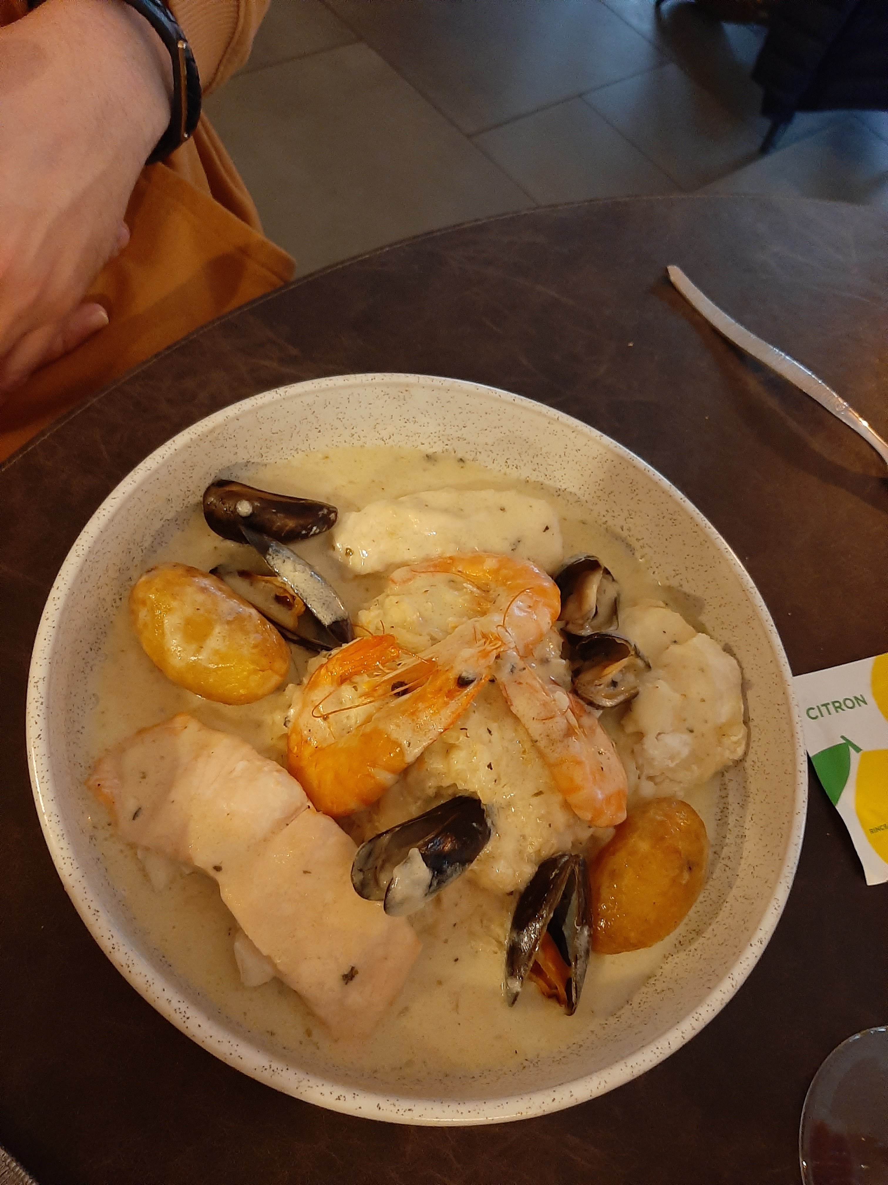 Installé en terrasse avec deux chiens, on a spontanément apporté de l'eau pour eux. Choucroute de la mer bien garnie saumon, moules, crevettes, lieu, pommes de terres et garniture pour tarif imbattable. Service au top et souriante. Bravo à toute l'équipe. A visiter les yeux fermés