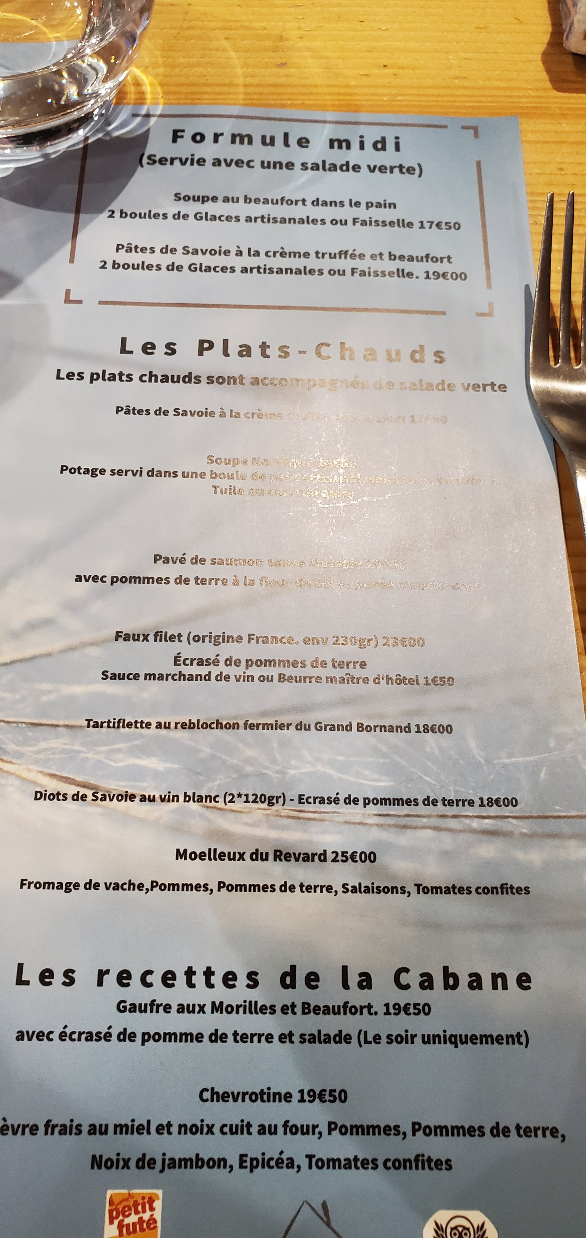 Petite adresse recommandée au beau milieu du village (qui prend tt son charme l'hiver). Une très bonne cuisine je note un pavé de saumon assez maigre cependant...