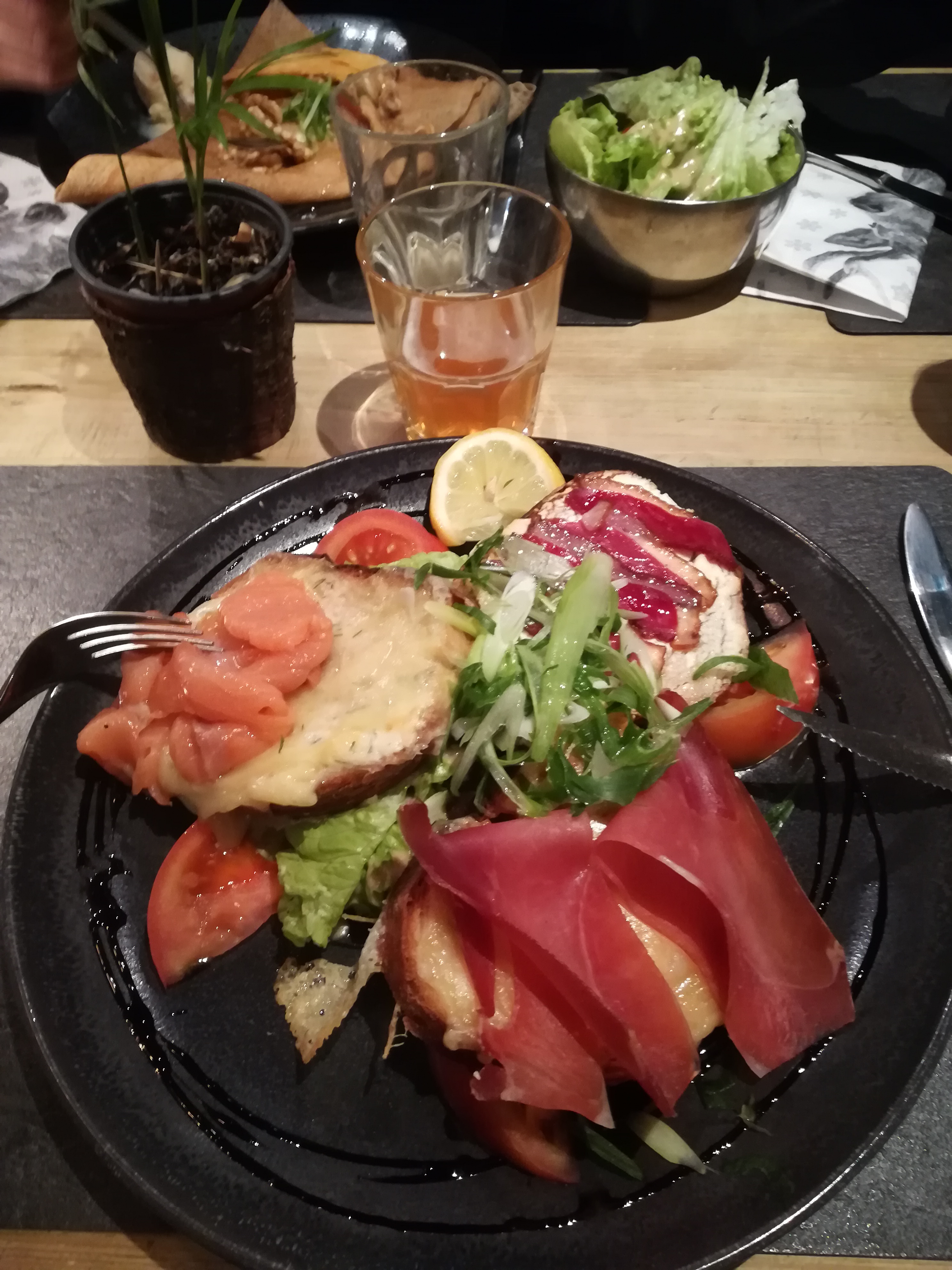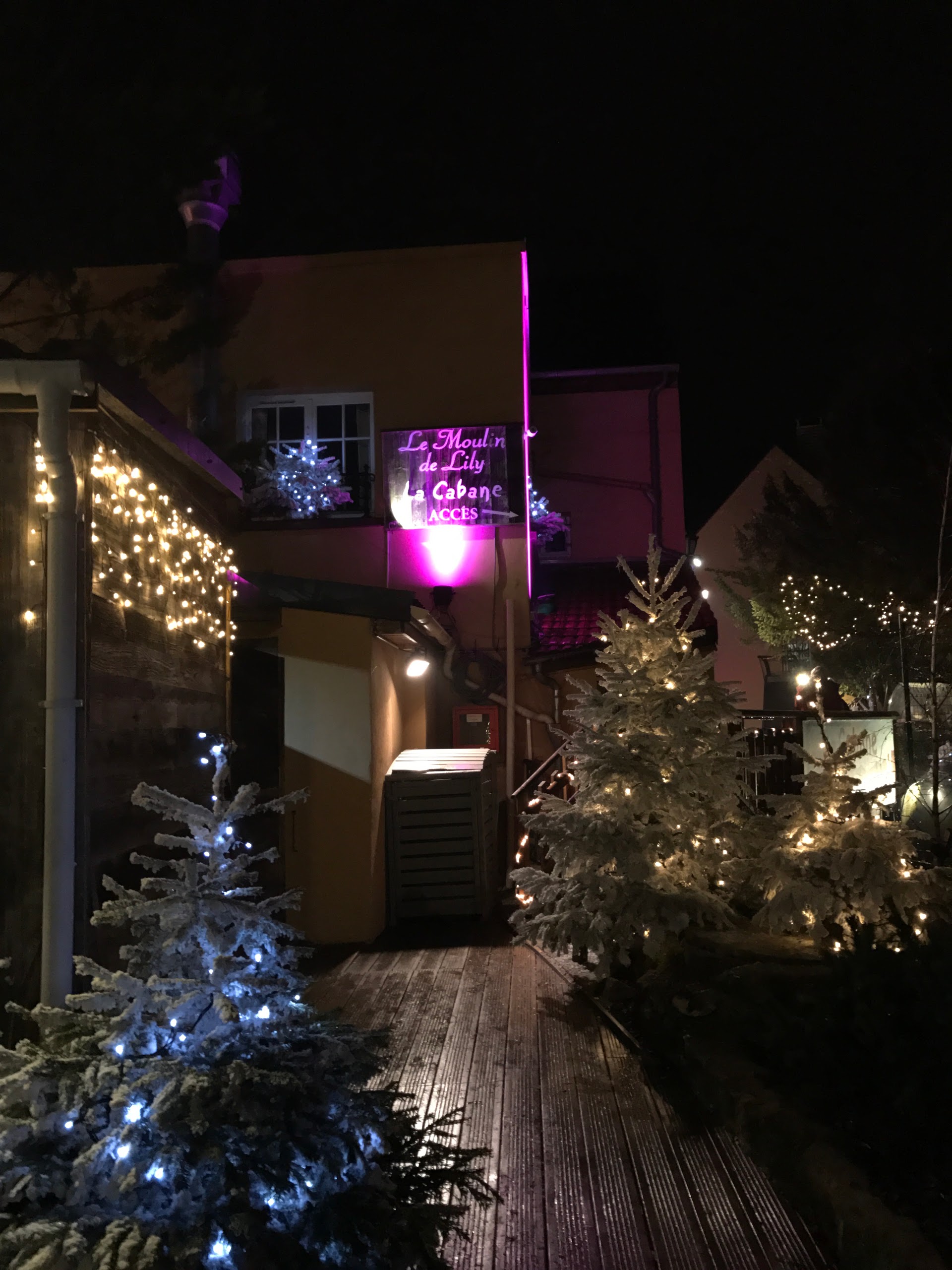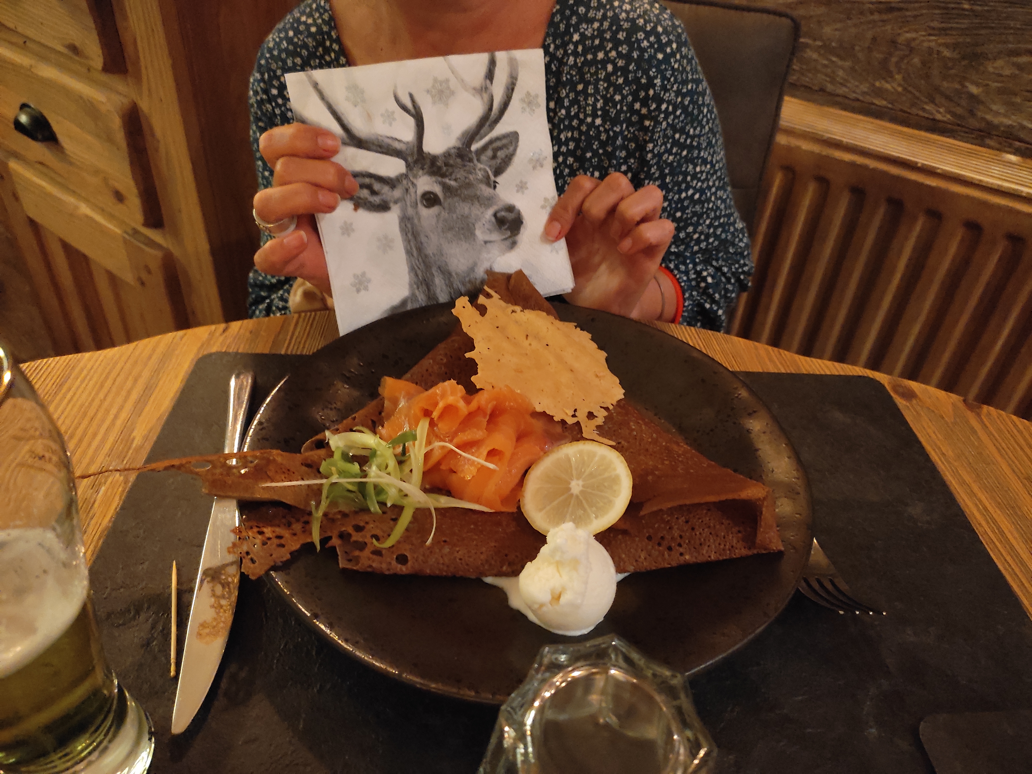 Cadre et service exceptionnels. Des décos et décors de Noël fabuleux à l'extérieur comme à l'intérieur, belles tables en bois, une ambiance scandinave, très cosy, lumières toutes douces et musique rock en fond. Plat de truite excellent avec son écrasé de pomme de terre et très bon dessert ananas et sa glace au poivre de Sichuan très onctueuse. Pour le reste c est ambiance chalet de montagne donc galettes de froment ou sarrasin avec du fromage raclette, du jambon, du lard, des pommes de terre, et tout ce qui tient bien au corps :) il y a des plats de viande/pomme de terre/ fromage fondu. Le vin rouge était très bon. Allez y en période de Noël ça vaut le détour ! Pensez à réserver