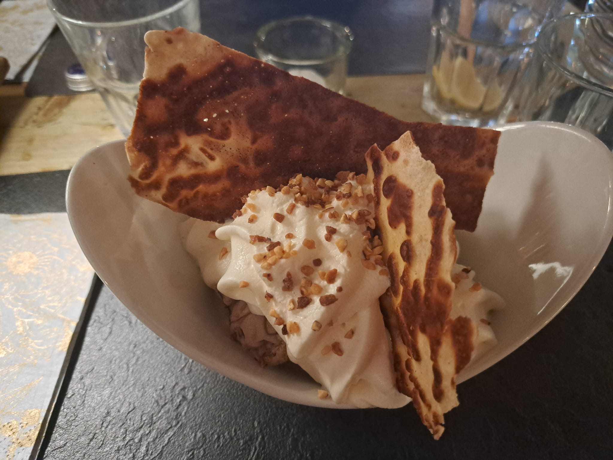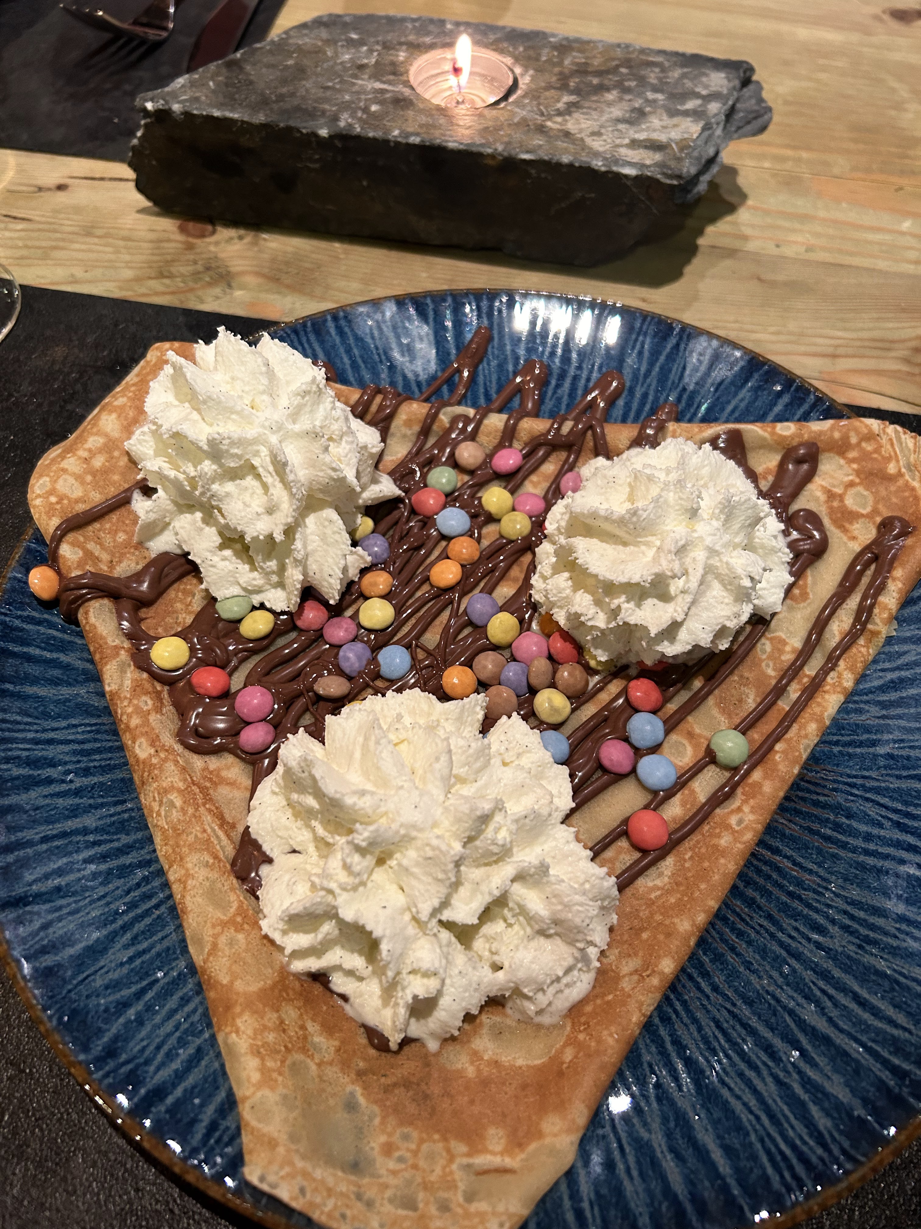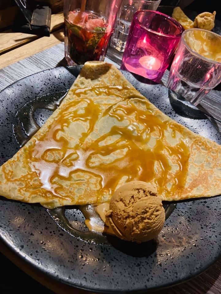 Alors nous avions commandé une fondu pour 4 personnes… comment dire… déjà le pain rapporter la quantité était minime, la serveuse s’en ai rendu compte et en a rajouté de suite. La fondu, c’était de l’huile au fromage, ça n’a crochait pas du tout au pain, aucun goût, la pire fondu que j’ai goûter, même celle en grande surface en sachet a plus de goûts et ressemble au moins à une fondu. Nous l’avons bien évidemment signalé à la serveuse. Concernant les crêpes aux desserts, toutes froides et pas très garnies. Je ne conseille pas du tout ce restaurant.